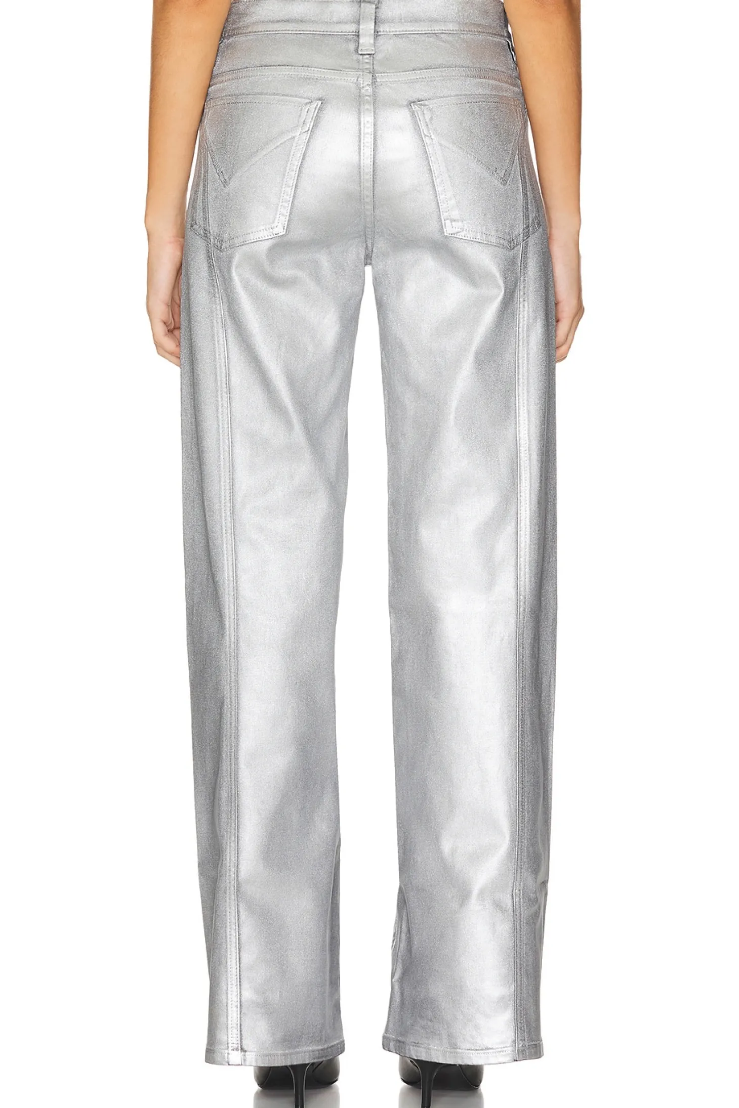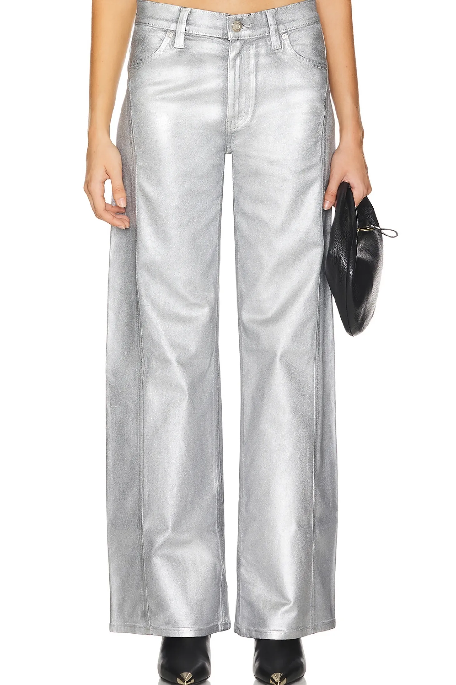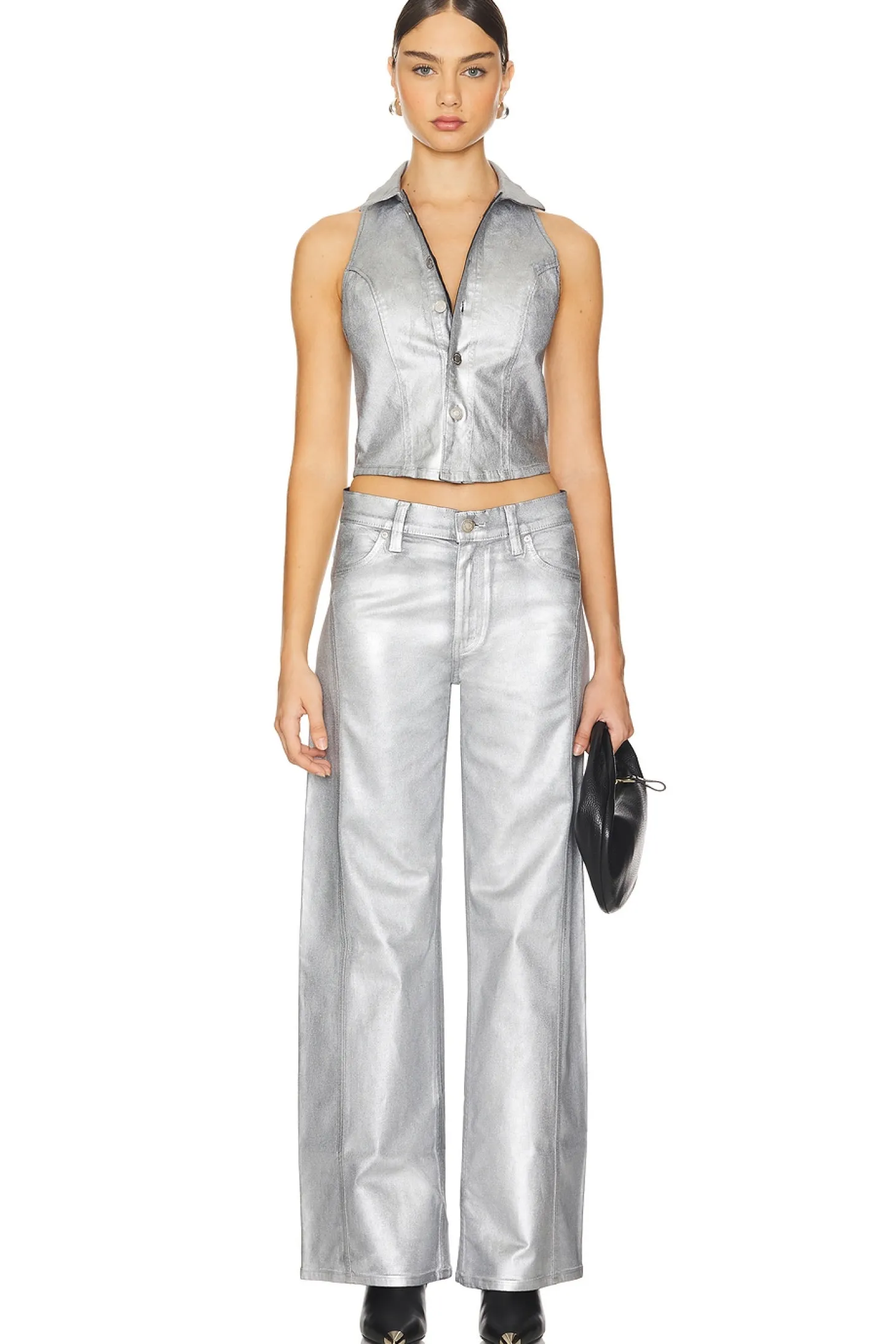 79% cotton 18% modal 3% elastane.Made in China.Dry clean only.Zip fly with button closure.4-pocket styling.Metallic coated denim.Item not sold as a set.21" at the knee and breaks to 23" at the leg opening