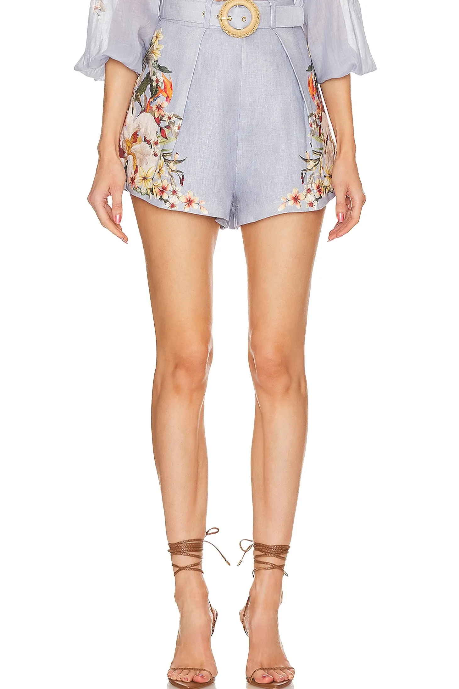 100% ramie.Made in China.Dry clean only.Zip fly with hook and bar closure.Detachable linen belt with raffia buckle.Linen fabric with side seam pockets.Item not sold as set.Shorts measure approx 14.5" in length