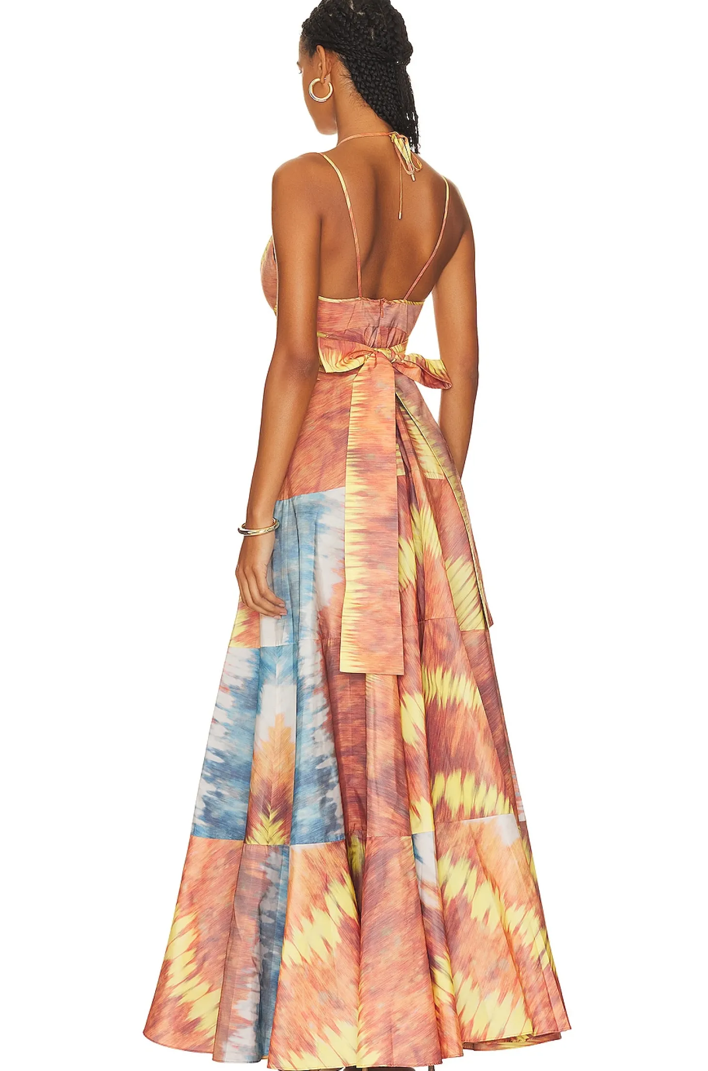 100% polyester.Made in China.Dry clean only.Unlined.Hidden back zipper closure Front button loop accents.Halterneck tie closure Attached waist tie.Midweight ripstop fabric with flounce hem