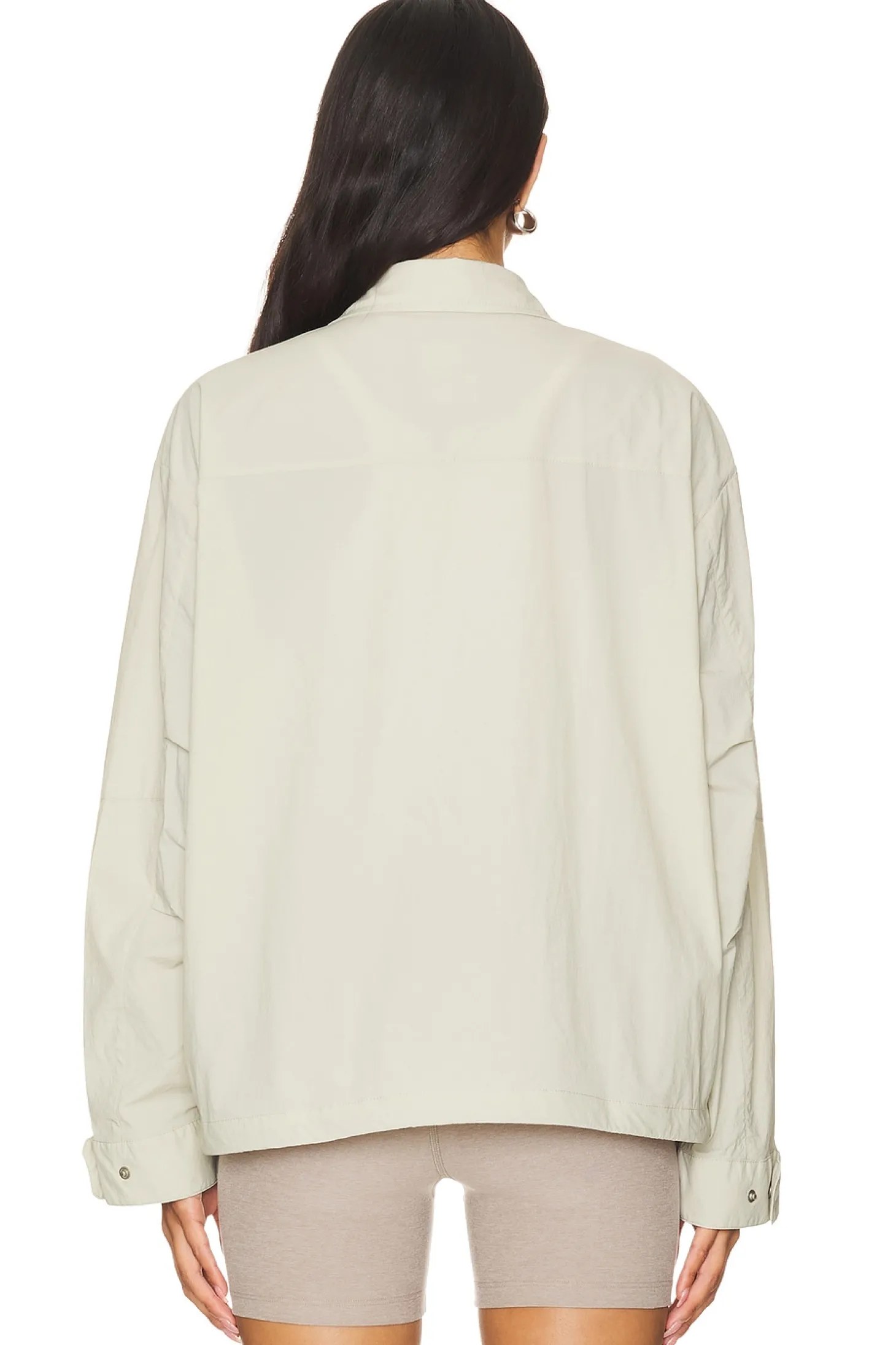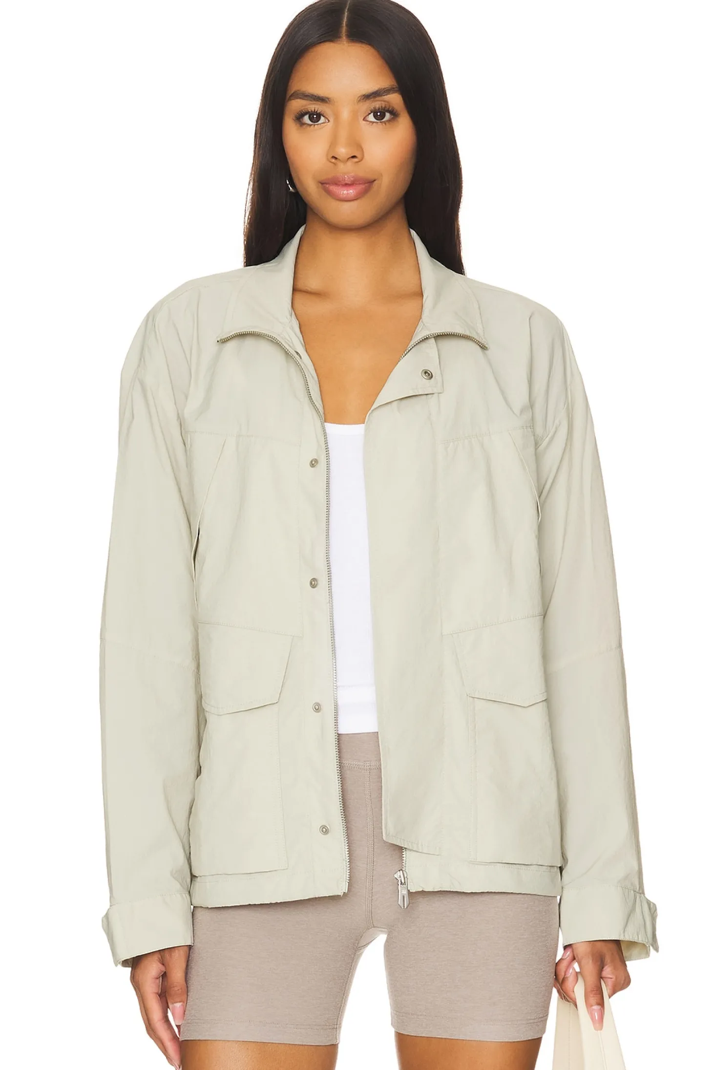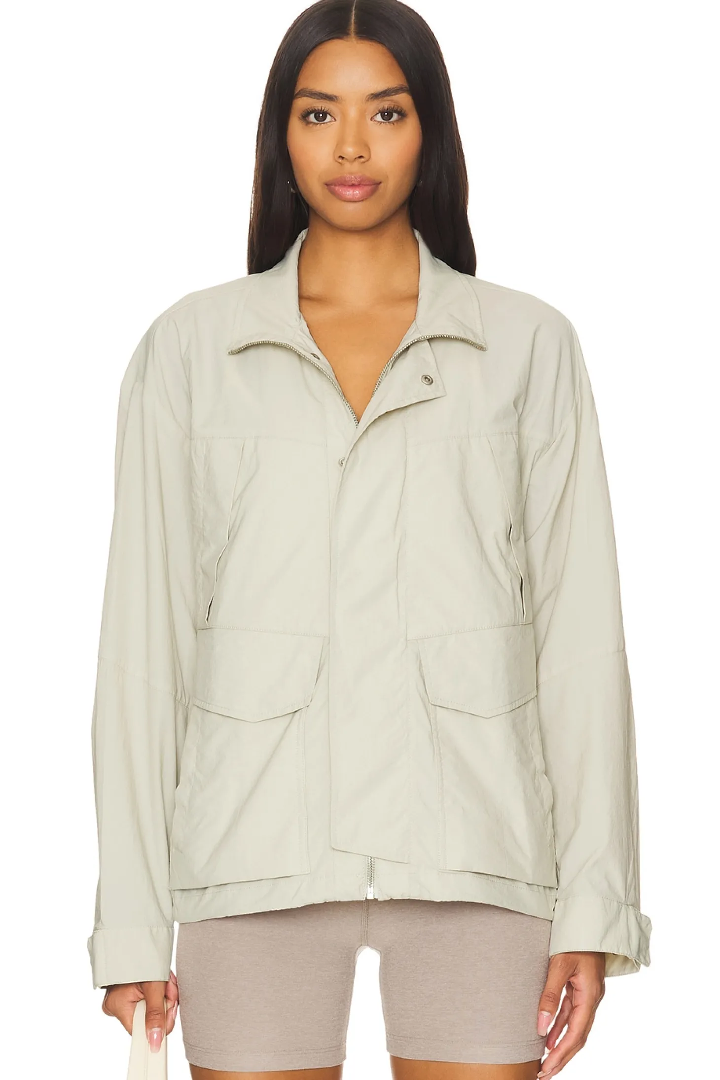 Self: 76% nylon 20% cotton 4% elastane Lining: 100% polyester.Made in Myanmar.Hand wash.Front zipper closure.6-pocket design.Button cuffs.Lightweight ripstop fabric