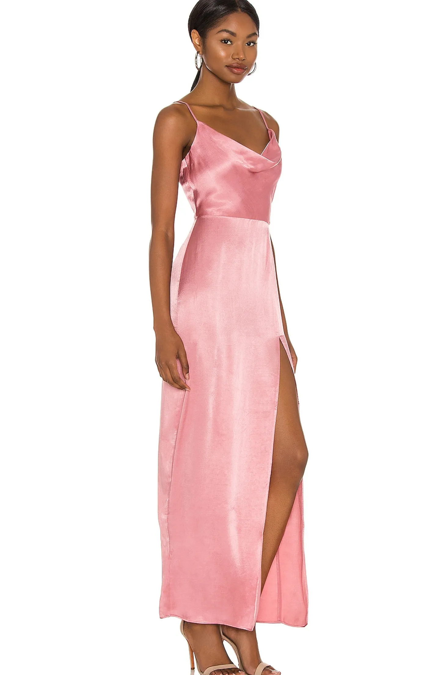 53% viscose 47% rayon.Made in China.Dry clean only.Partially lined satin fabric with sheen finish.Hidden back zipper closure.Adjustable shoulder straps.Cowl neckline and hem slit