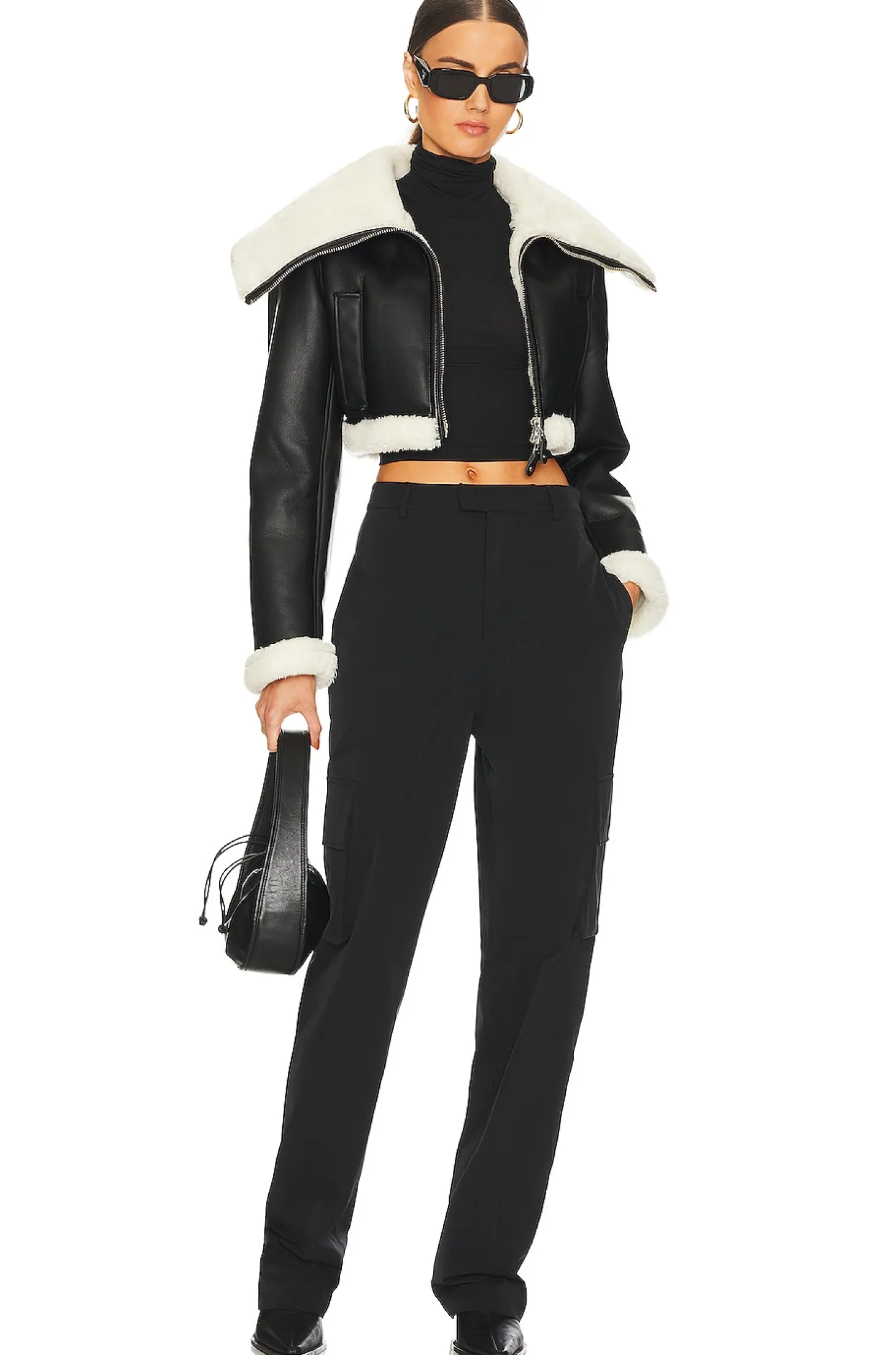 Self: 100% polyurethane Lining: 100% polyester.Made in China.Dry clean only.Two-way front zipper closure.Side slant pockets.Faux leather fabric with faux fur trim and lining
