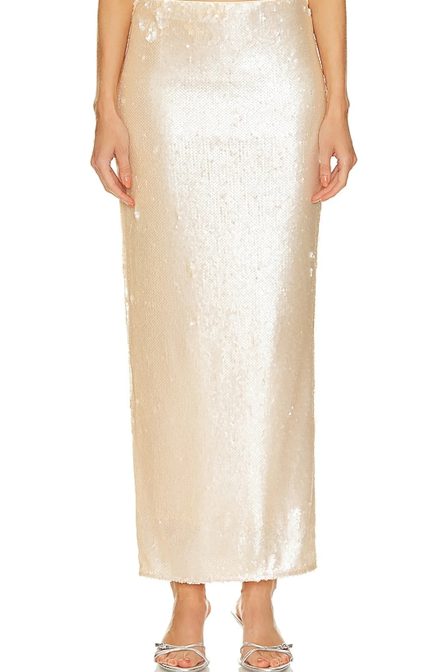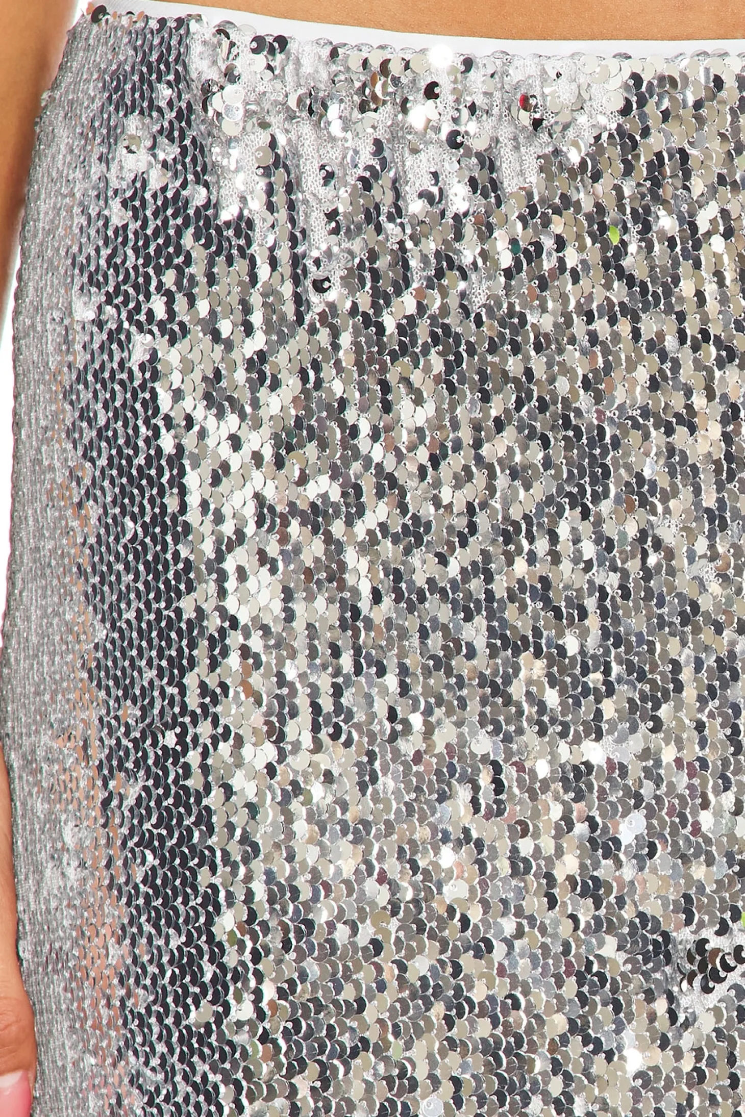 Self: 95% polyester 5% elastane Lining: 97% polyester 3% elastane.Made in China.Dry clean only.Fully lined.Hidden back zipper closure.Back vent.Heavyweight sequin fabric Item not sold as a set.Skirt measures approx 40" in length
