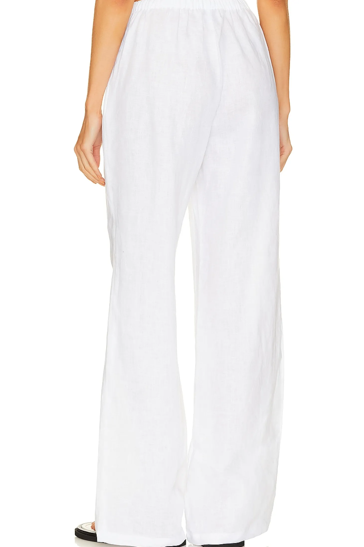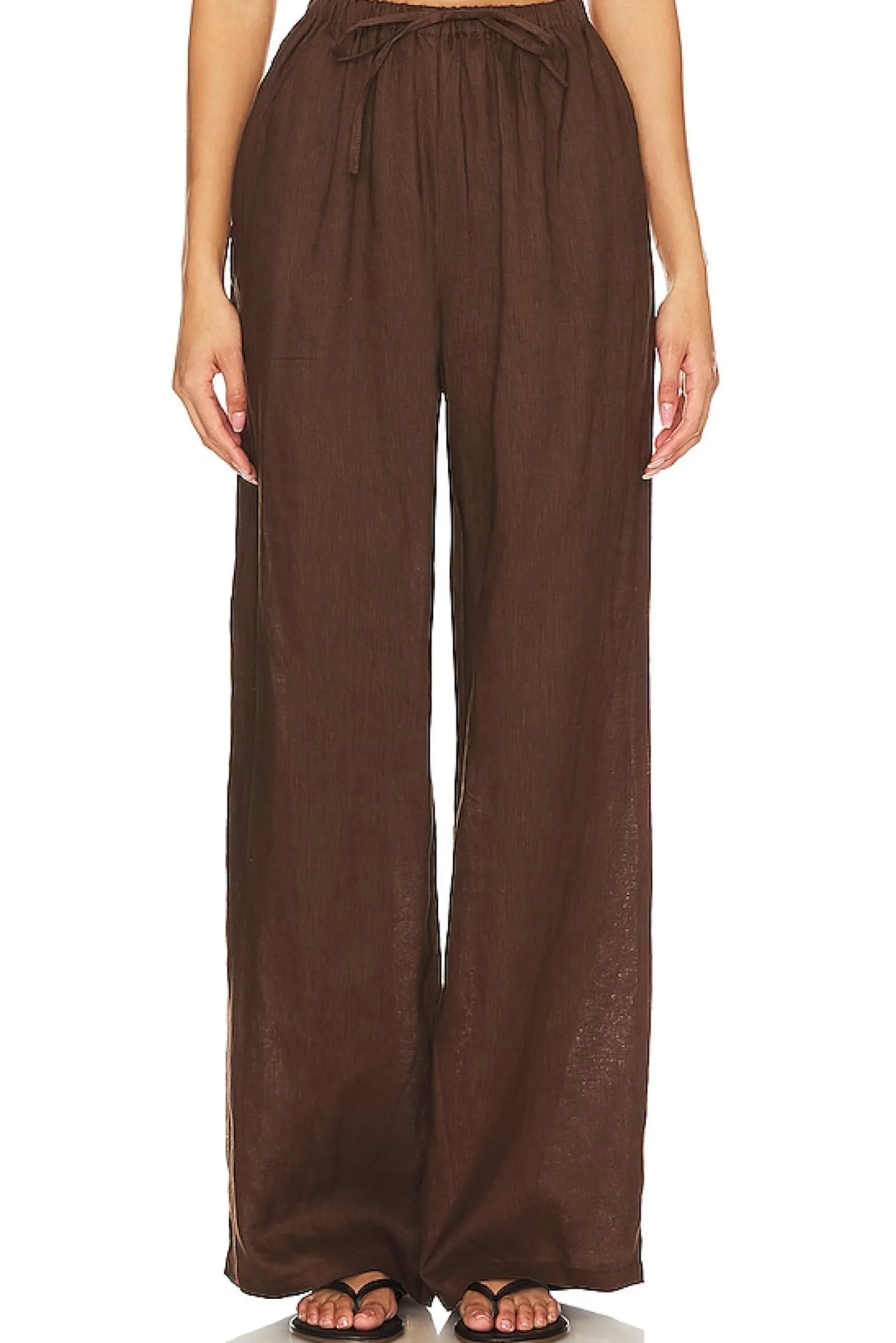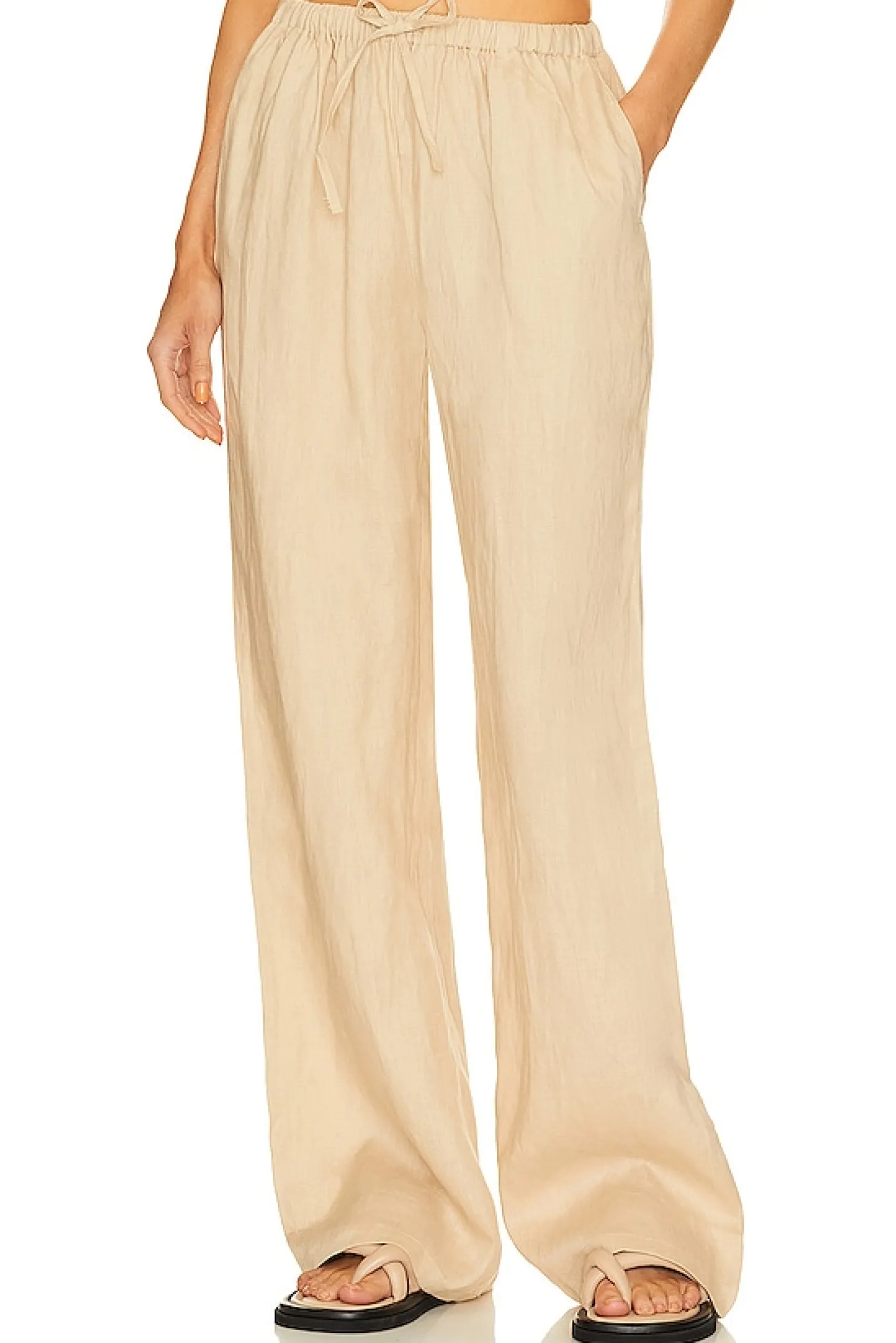 100% linen.Made in China.Hand wash.Drawstring closure.Side seam pockets.Lightweight linen fabric.Item not sold as set.21" at the knee and 21" at the leg opening