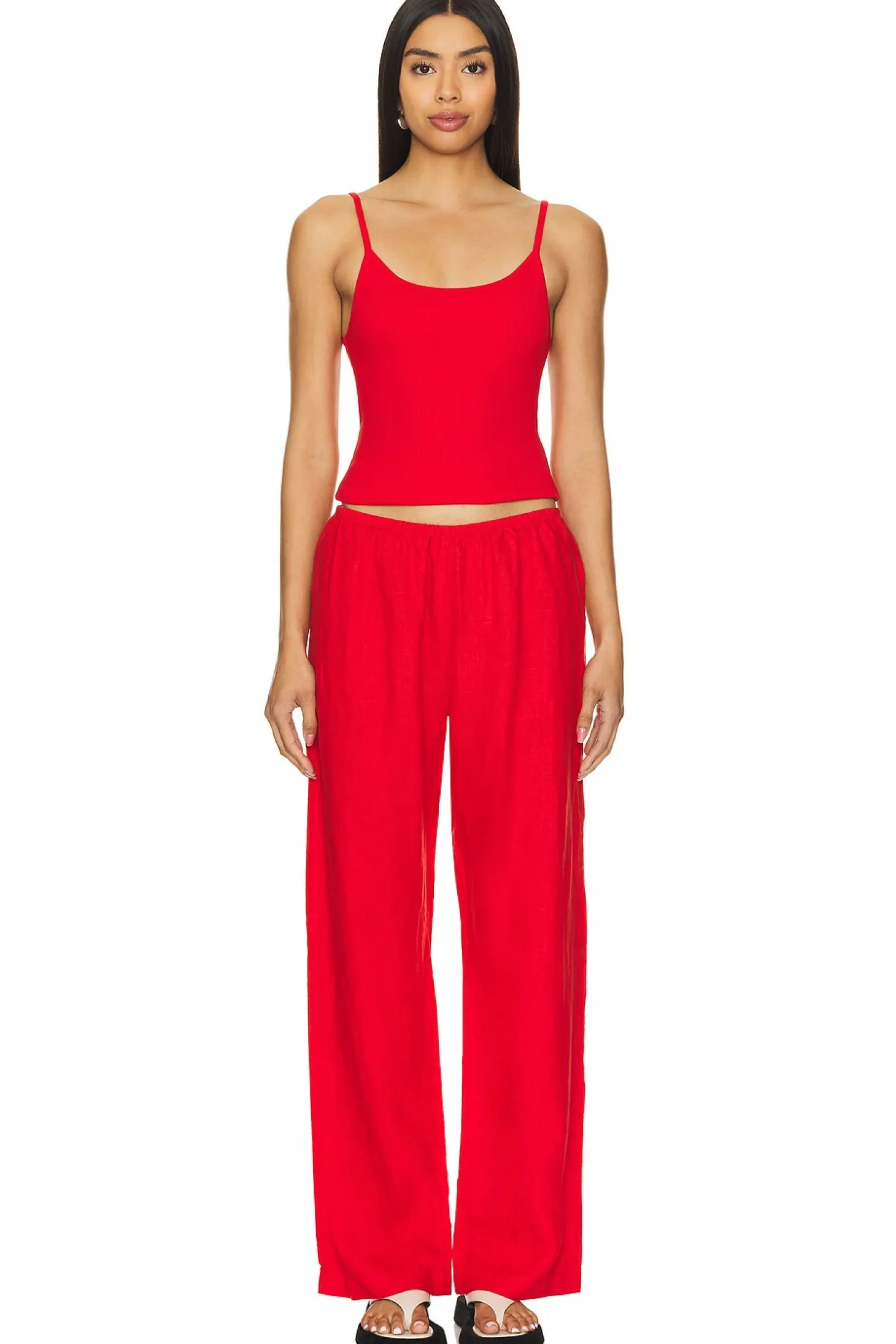 100% linen.Made in USA.Machine wash.Pull-on styling with elastic waistband.Lightweight fabric.Item not sold as a set.19" at the knee and 19" at the leg opening