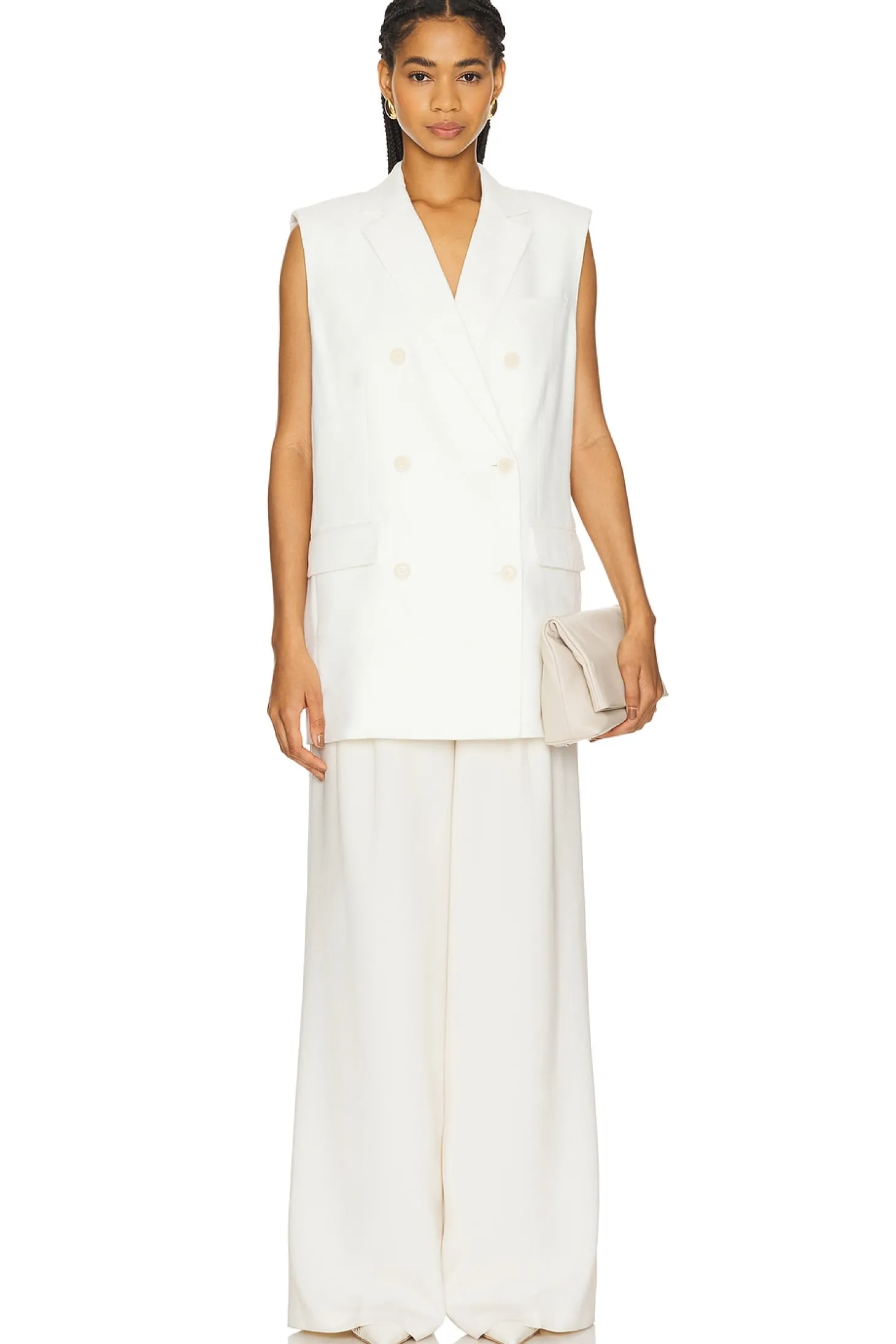 52% linen 45% viscose 3% elastane.Made in Vietnam.Dry clean only.Double breasted front button closure.Padded shoulders.Front flap pocketsFaux breast slip pocket.Midweight linen fabric