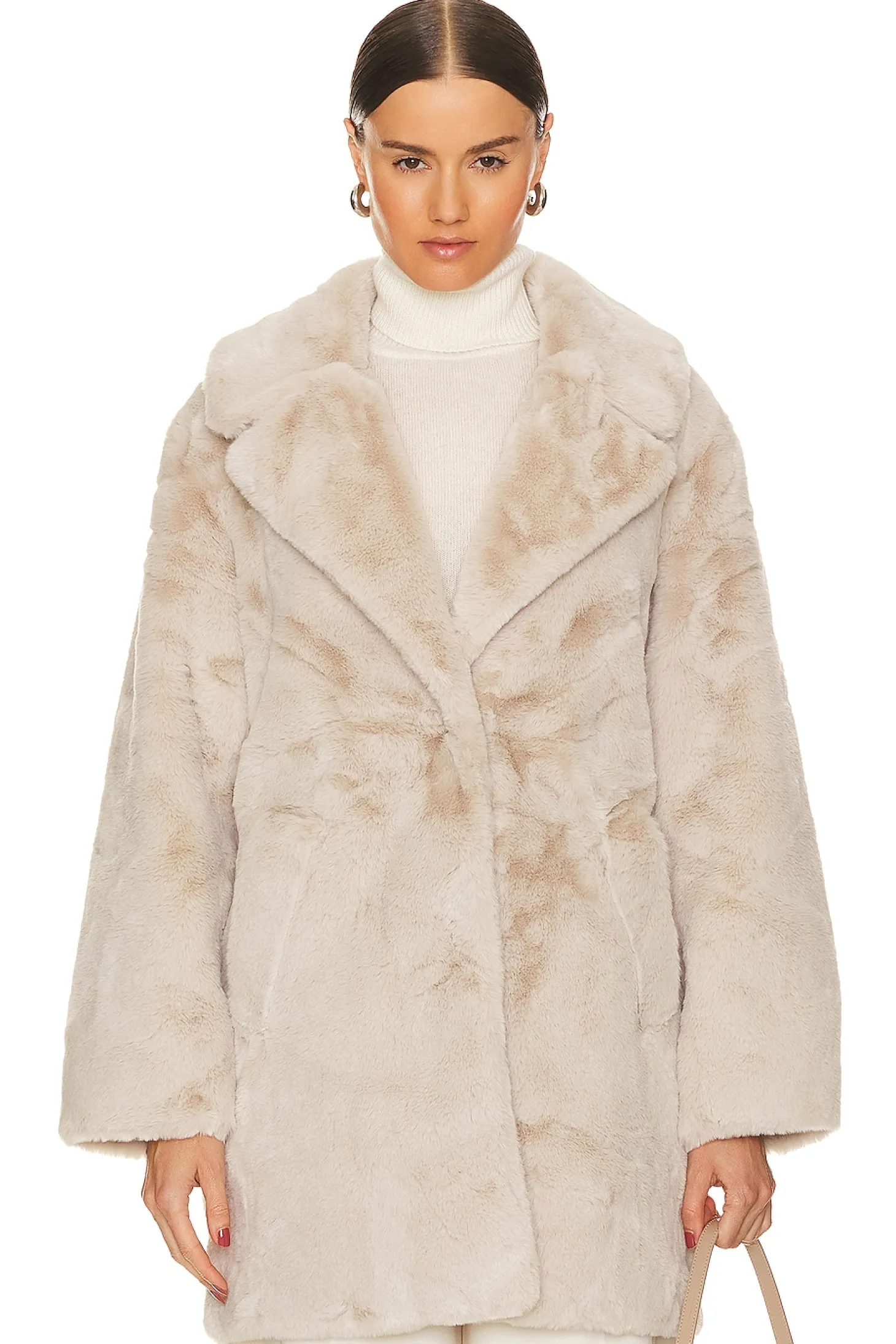 100% polyester.Made in China.Dry clean only.Front button closure.Side slant pockets.Faux fur fabric