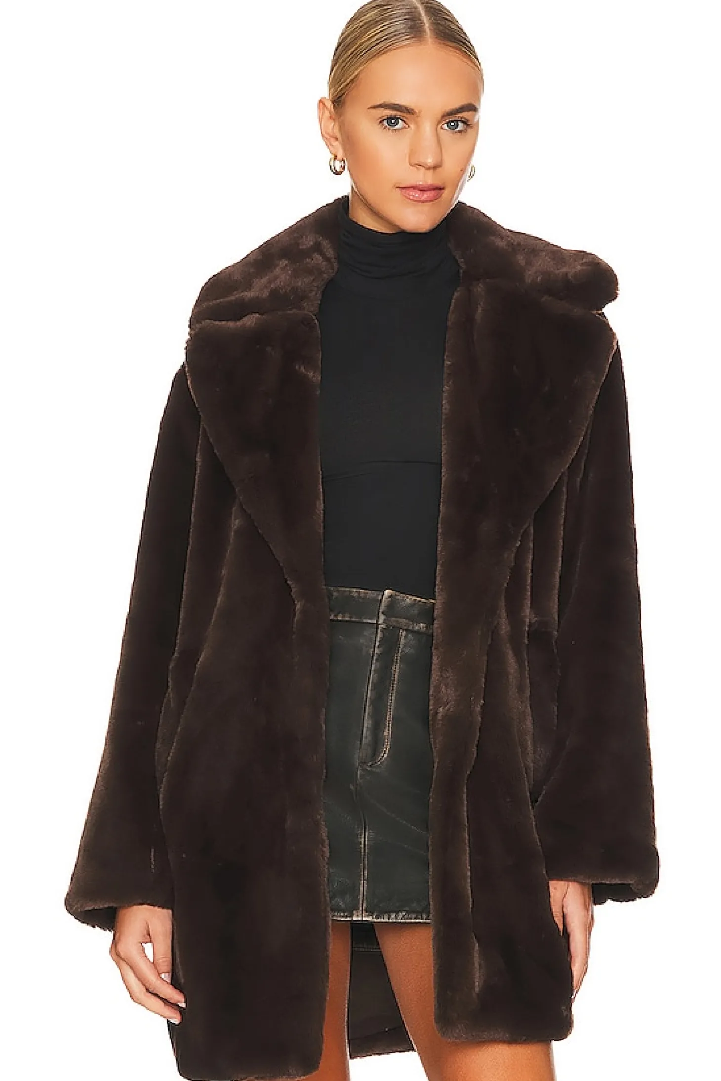 100% poly.Made in China.Dry clean only.Front singular snap button closure.Side seam pockets.Faux fur fabric