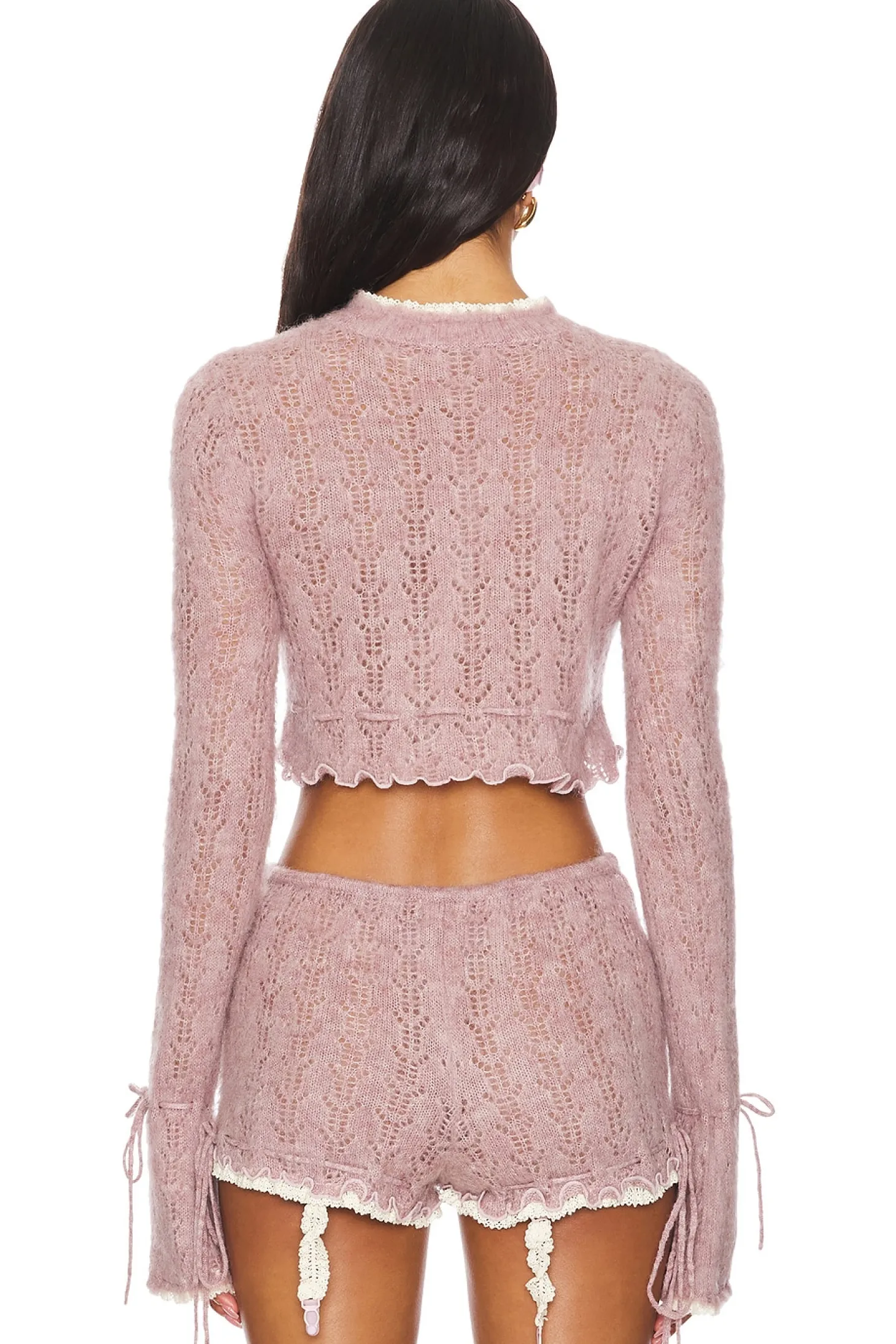 Self: 42% acrylic 30% nylon 20% wool 8% mohair Contrast: 100% cotton.Made in China.Dry clean only.Front button closure.Drawstring cuffs and drawstring lettuce hem.Fuzzy open lightweight knit fabric with lace trim