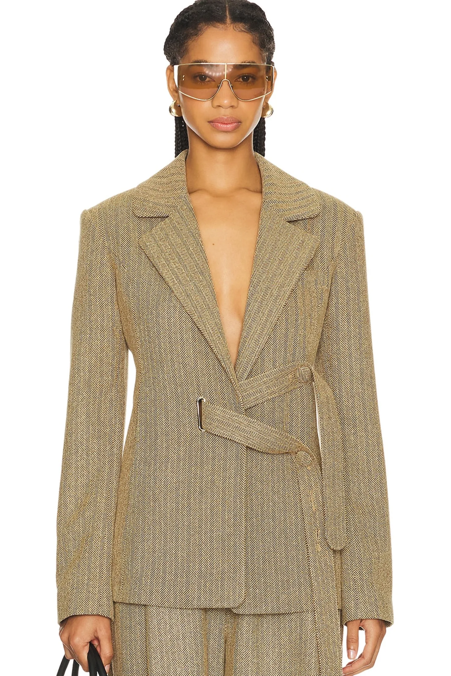 Crepe textile.Made in China.Dry clean only.Open front with waist tie closure.Padded shoulders.Buttoned cuffs.Midweight suiting fabric.Item not sold as a set