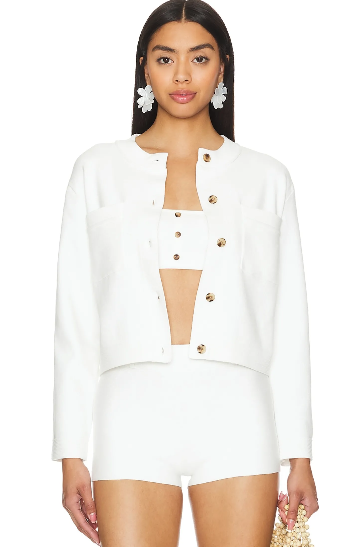 85% cotton 15% polyester.Made in China.Dry clean only.Front button closure.Breast slip pockets.Ribbed trim.Midweight knit fabric.Item not sold as a set