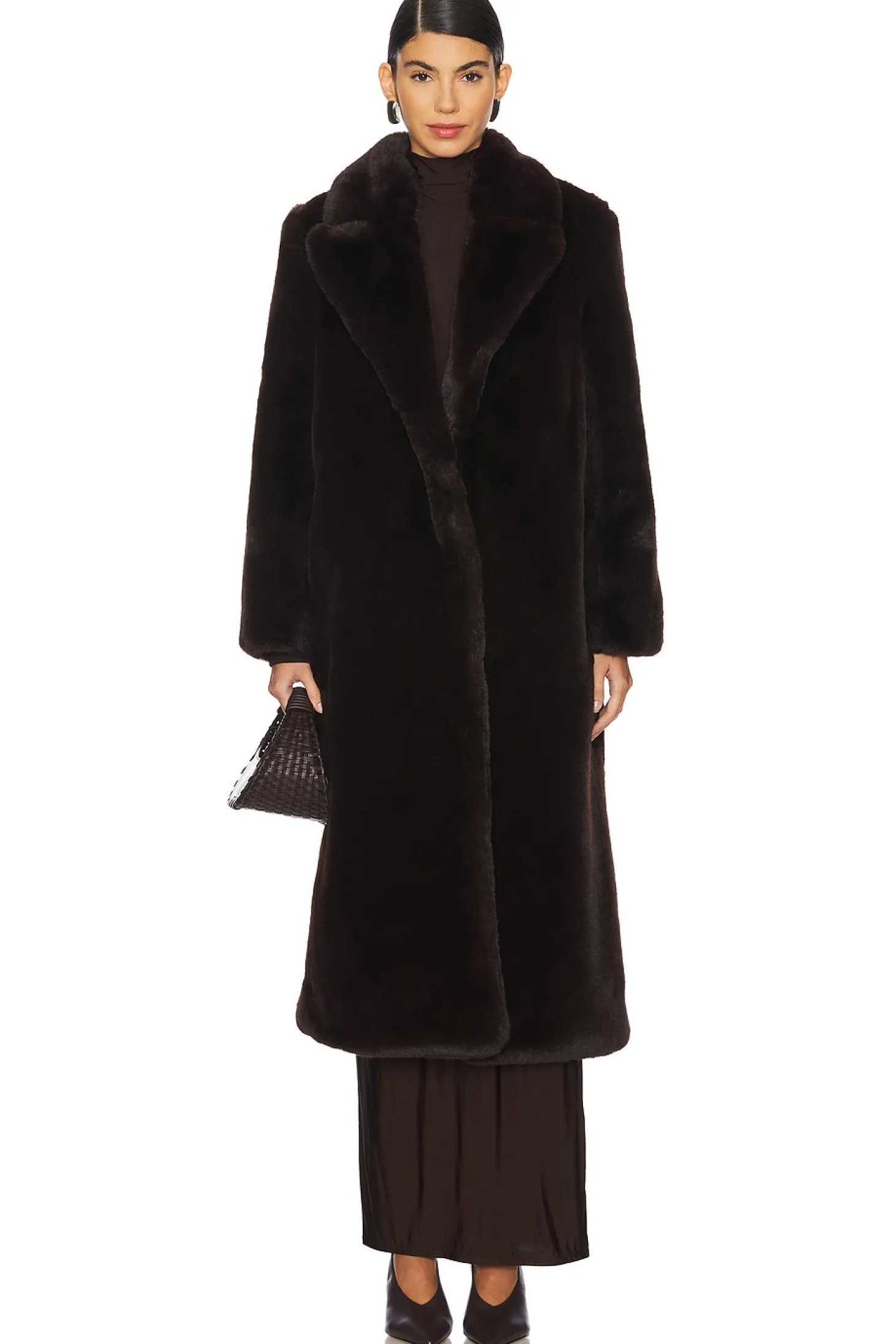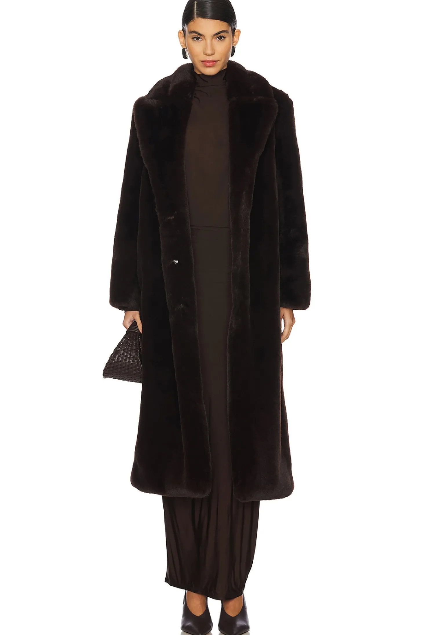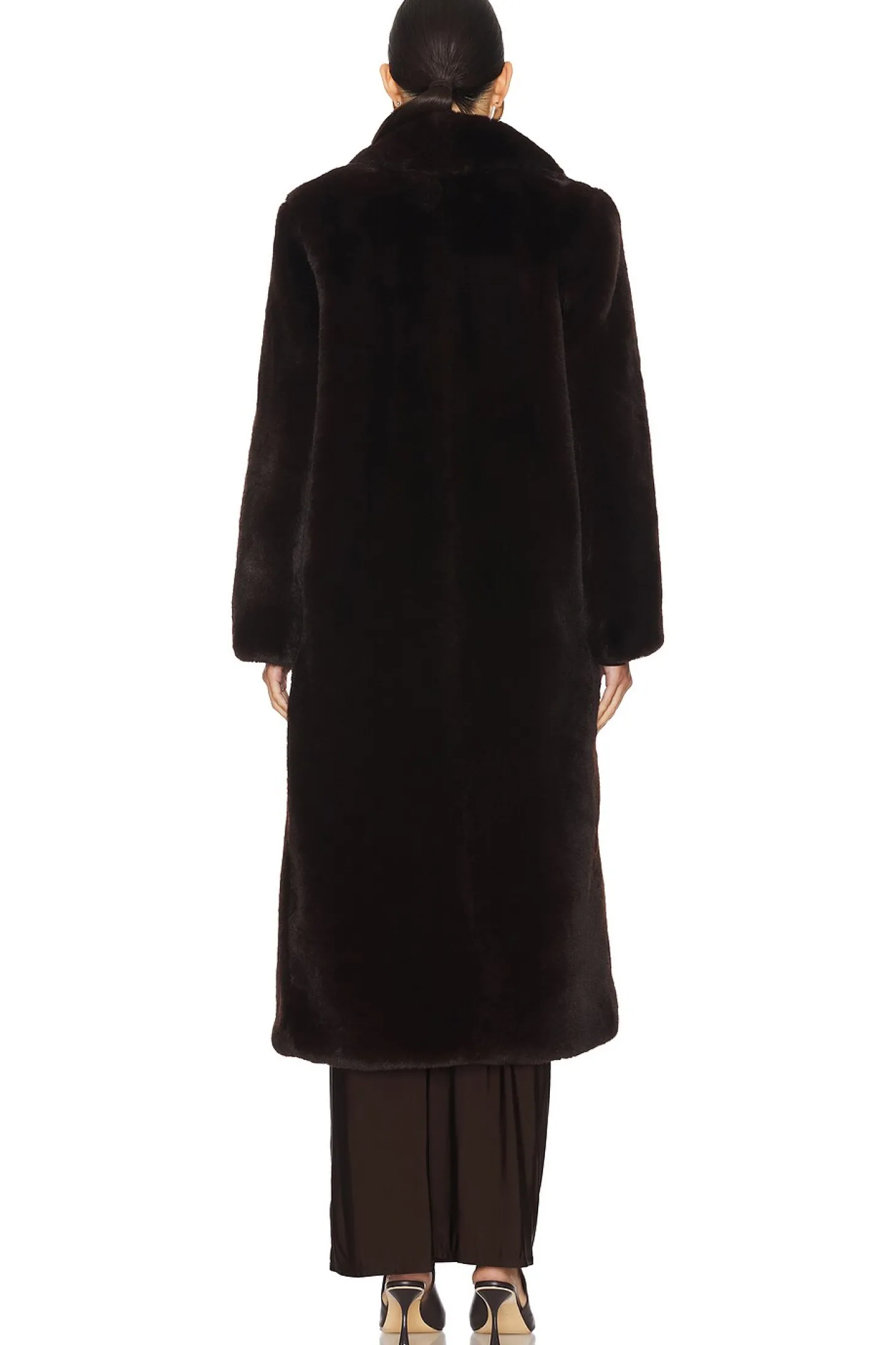 Self: 100% polyester Lining: 55% polyester 45% viscose.Made in China.Dry clean only.Front snap closure.Side seam pockets Notched lapel collar.Heavyweight faux fur fabric