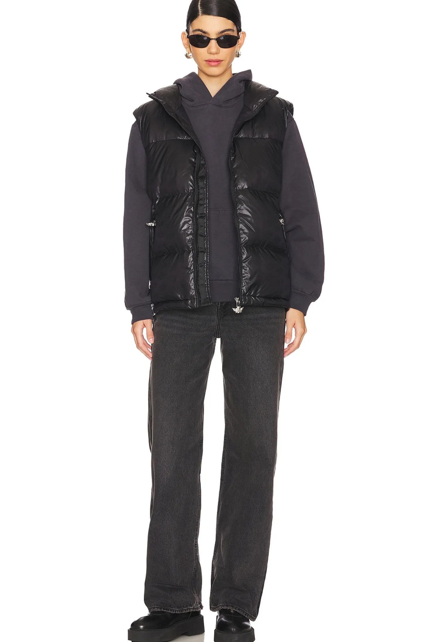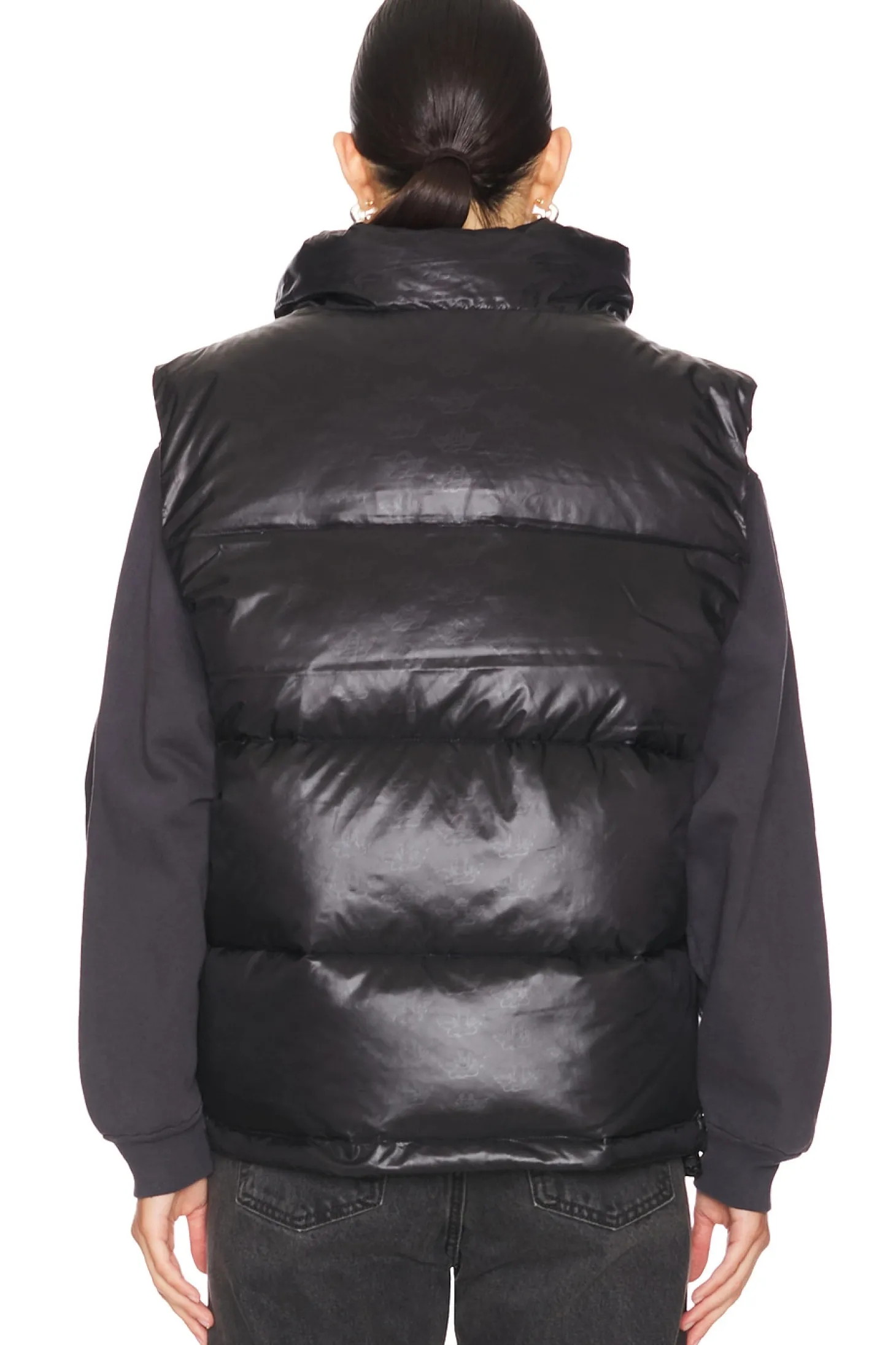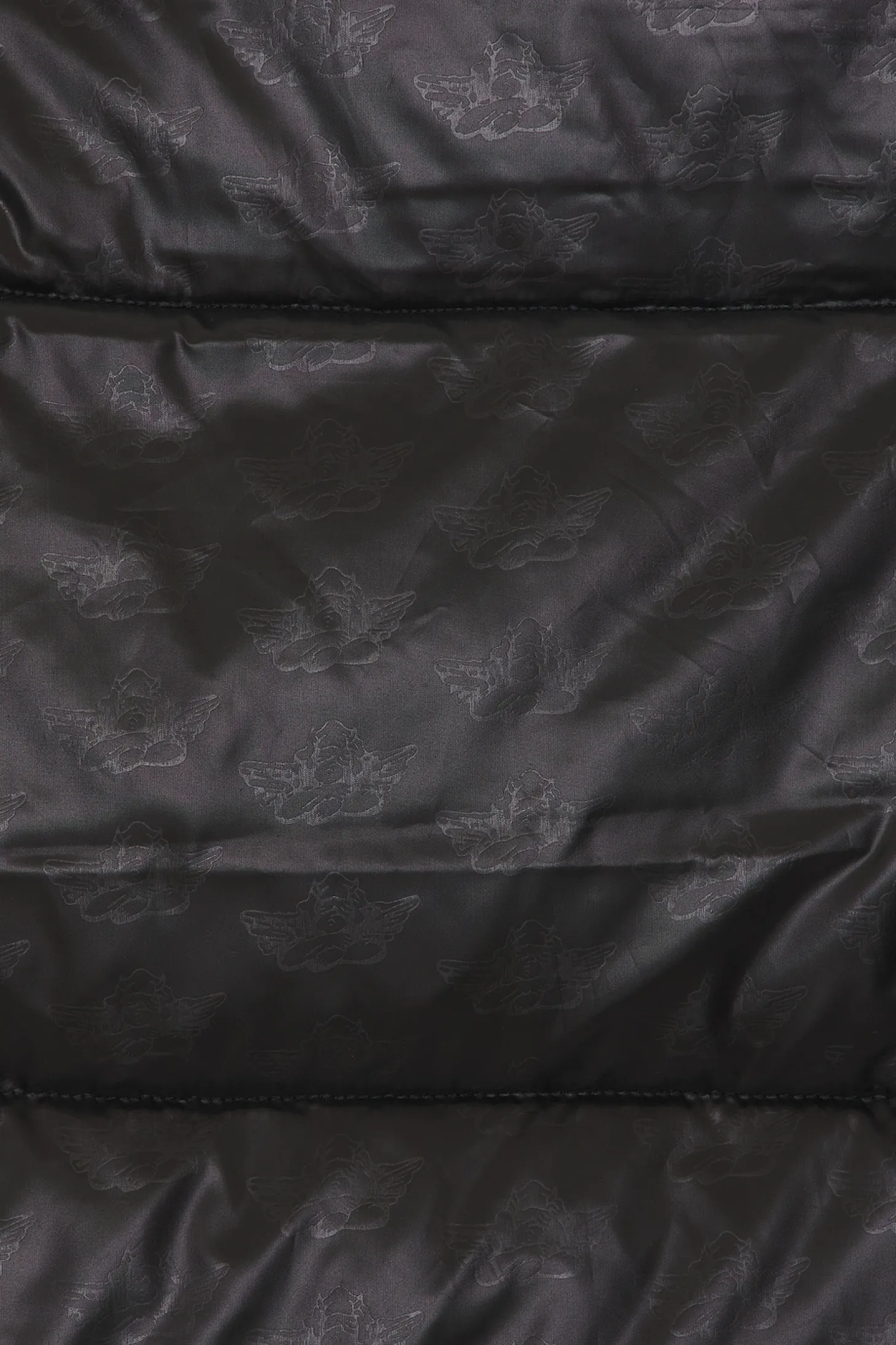 Self: 100% polyester Lining: 100% nylon Filling: 90% duck down 10% duck feathers.Made in China.Machine wash.Exposed front zip closure.Side zip pockets and interior zip pocket.Adjustable pull-cord waistband.Logo print throughout.Padded ripstop fabric