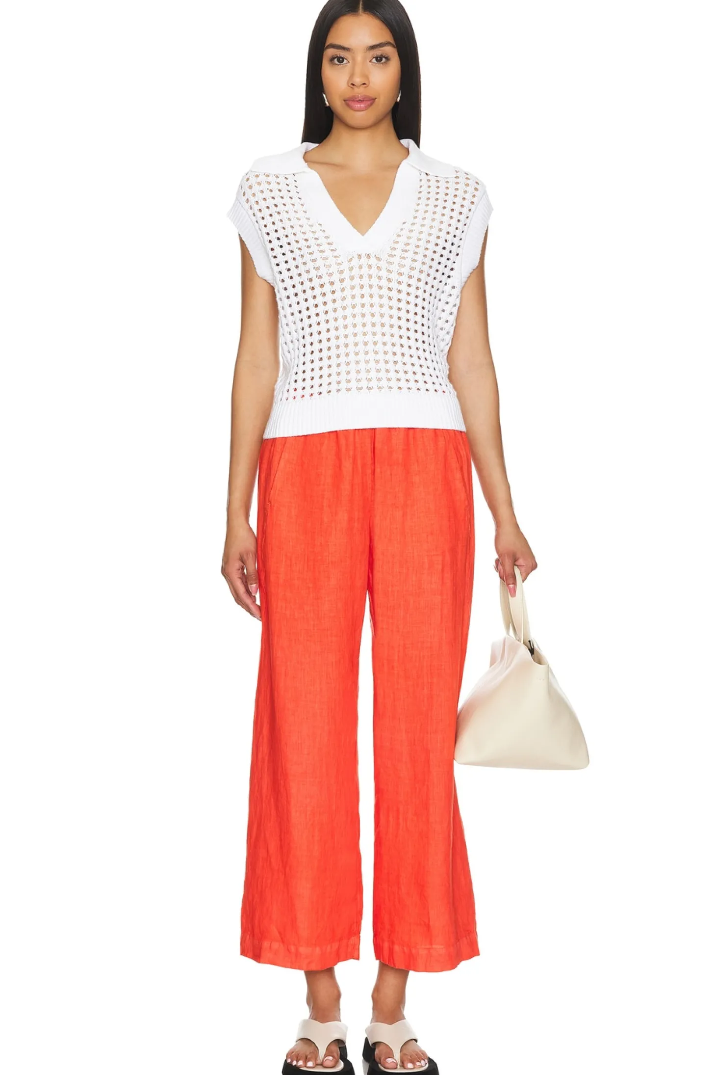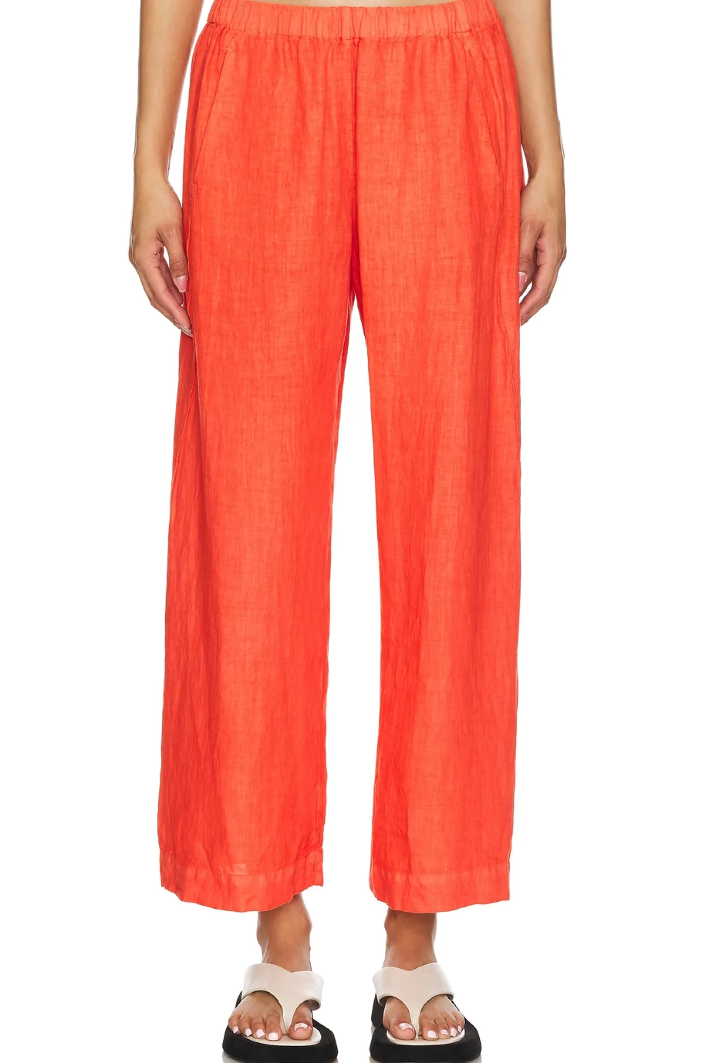 Self: 100% linen.Made in USA.Machine wash.Pull-on styling.22.5" at the knee and 23" at the leg opening