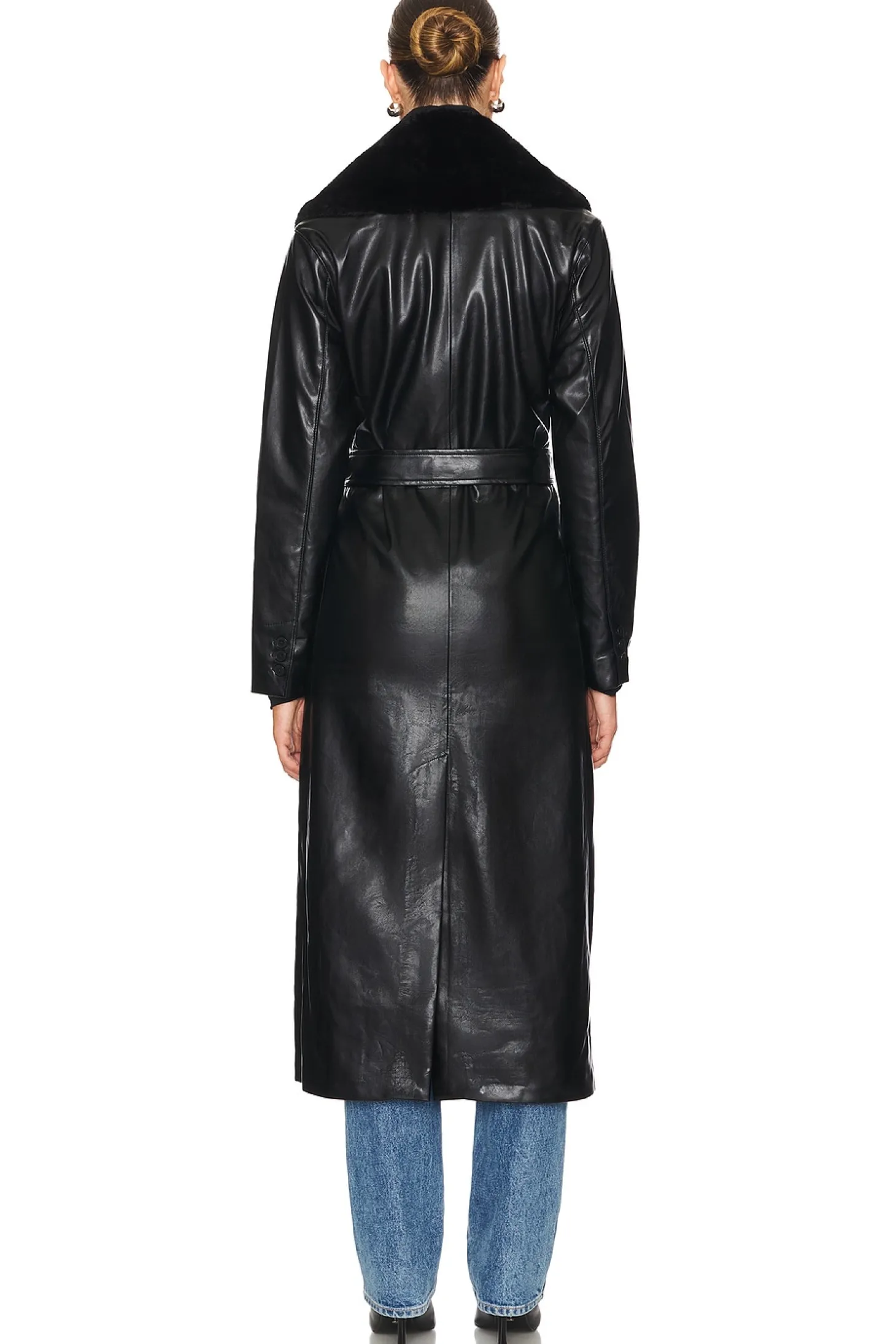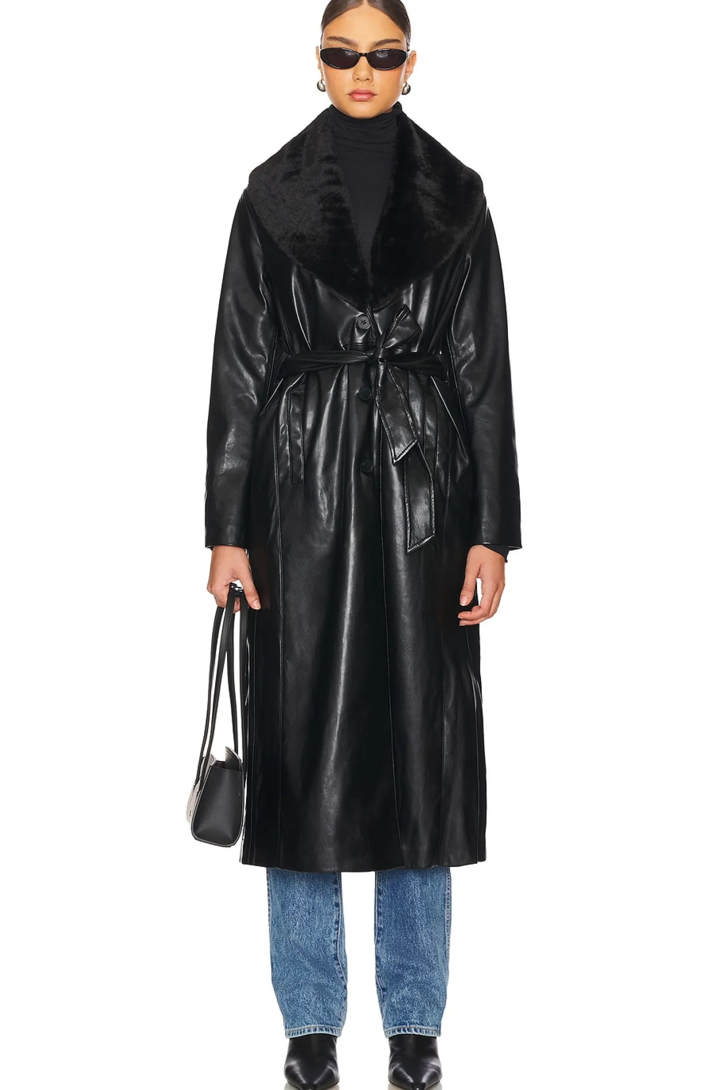 Self: 55% polyurethane 45% polyester Faux Fur Collar: 100% polyester Lining: 97% polyester 3% spandex.Made in China.Wipe clean.Single breasted closure with optional waist tie.Side pockets.Faux button cuffs.Faux leather and faux fur collar