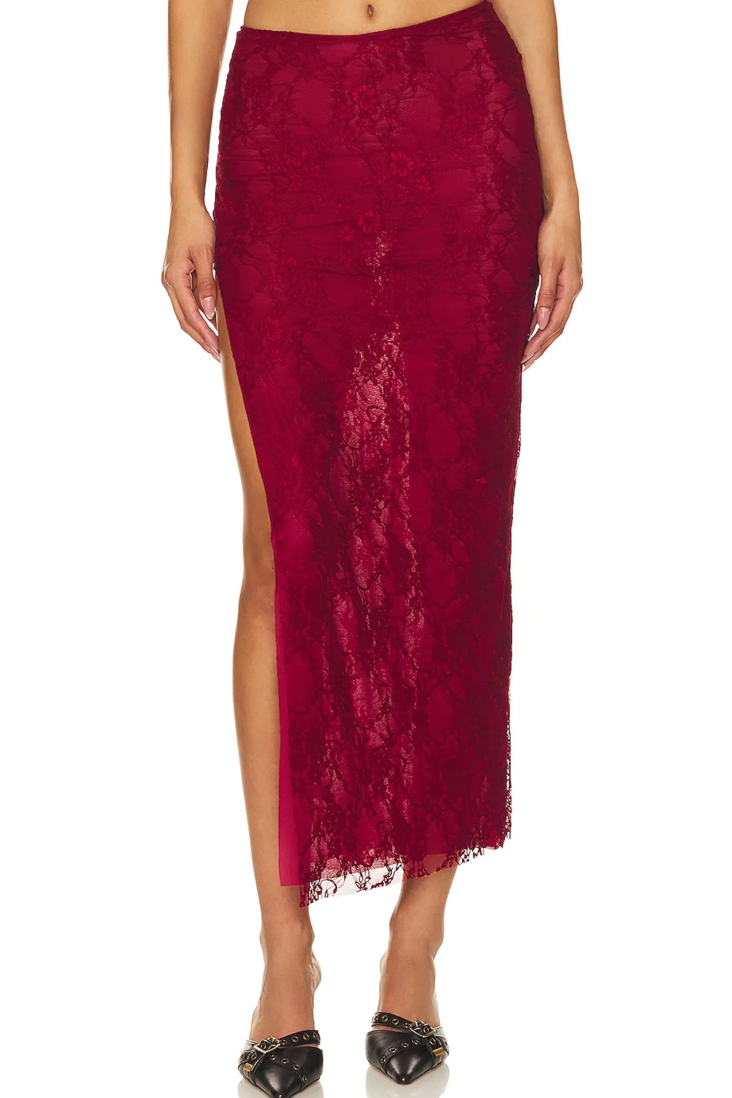 92% polyester 8% nylon.Made in England.Hand wash.Fully lined.Pull-on styling.Lace fabric with side slit.Item not sold as set.Skirt measures approx 40" in length