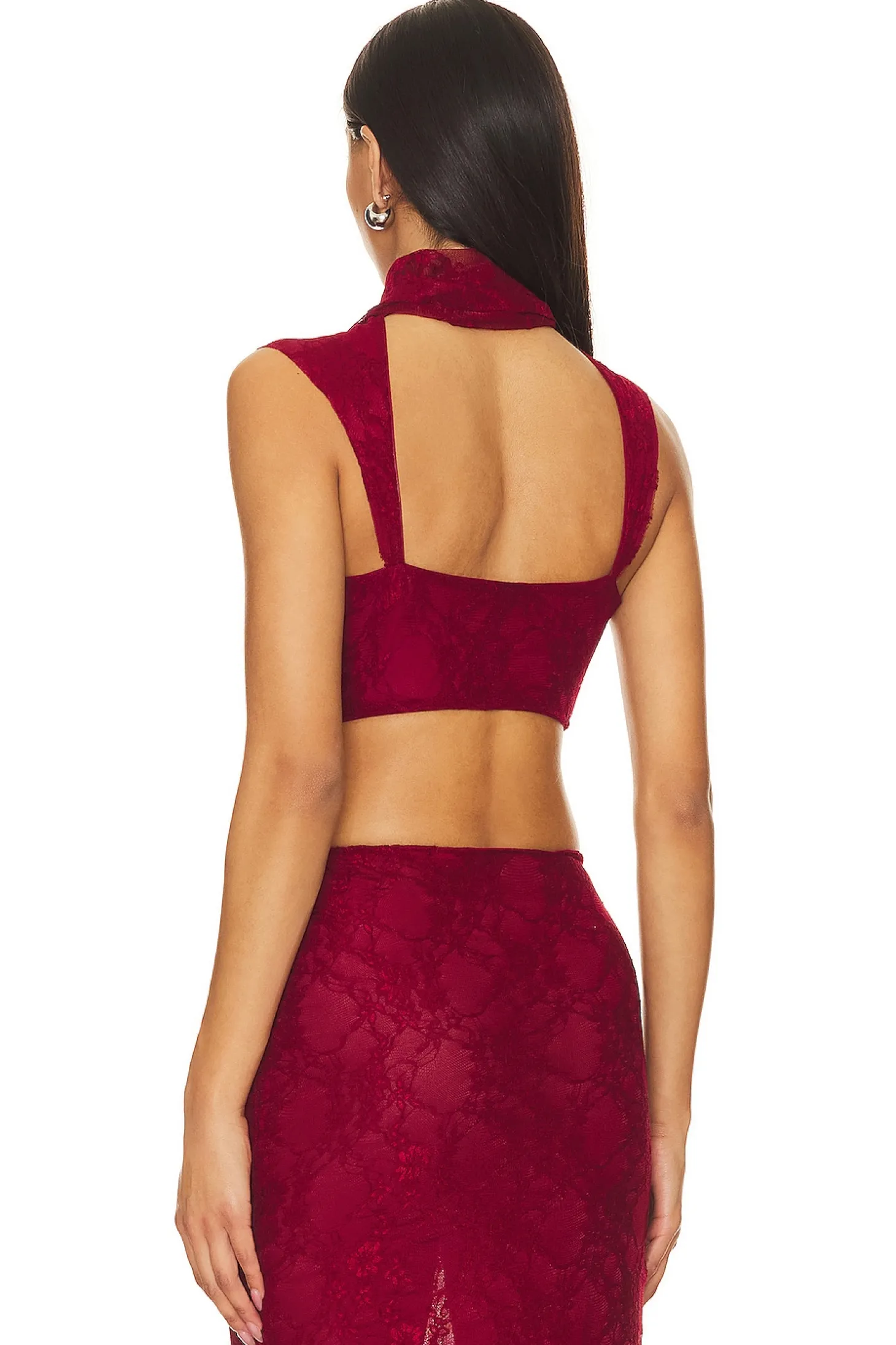 92% polyester 8% nylon.Made in England.Hand wash.Mockneck styling.Back cut-out.Lace fabric.Item not sold as set