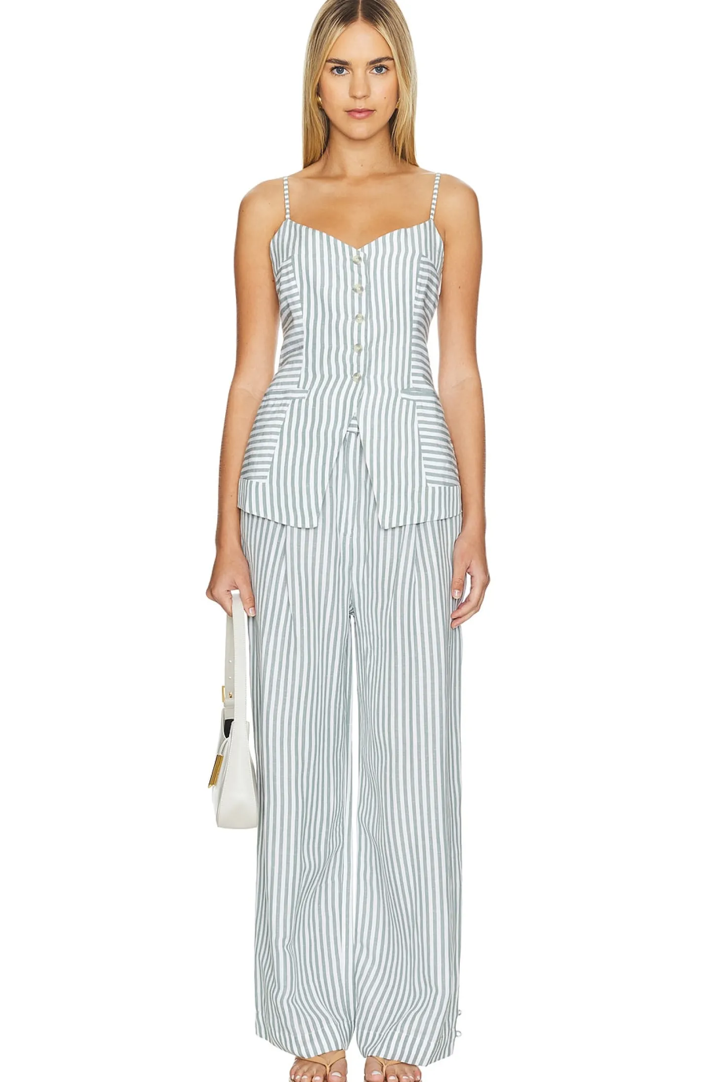 Self: 55% viscose 45% linen Lining: 100% cotton.Made in India.Hand wash.Zip fly hook and bar closure.Adjustable waist feature.Wide leg with adjustable tabs at hem for a narrower fit.24" at the knee and 22" at the leg opening