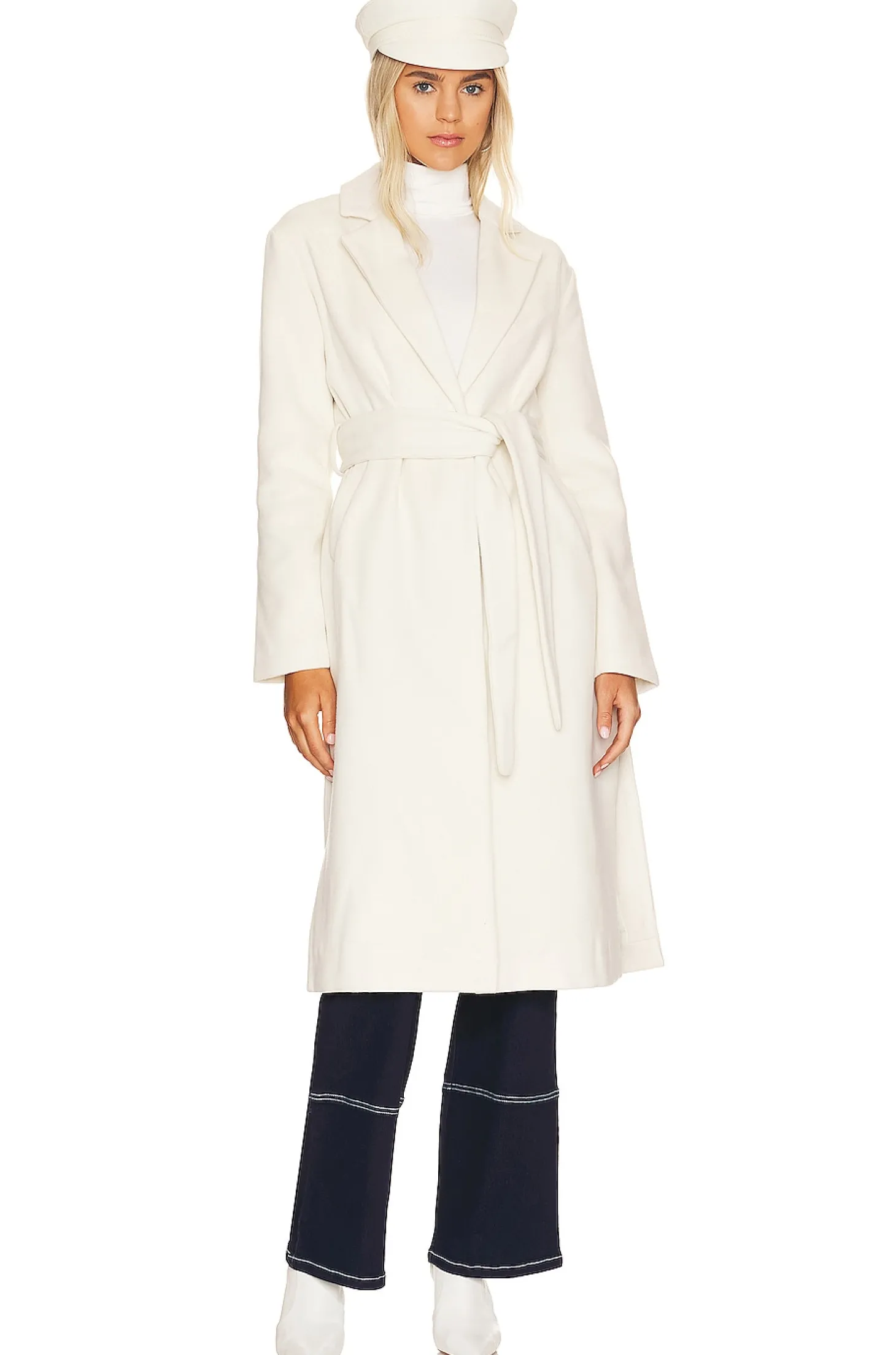 Self: 80% polyester 16% viscose 4% spandex Lining: 95% polyester 5% elastane.Made in China.Dry clean only.Singular front button closure with detachable waist tie.Side slant pockets.Side seam slits.Soft Melton fabric