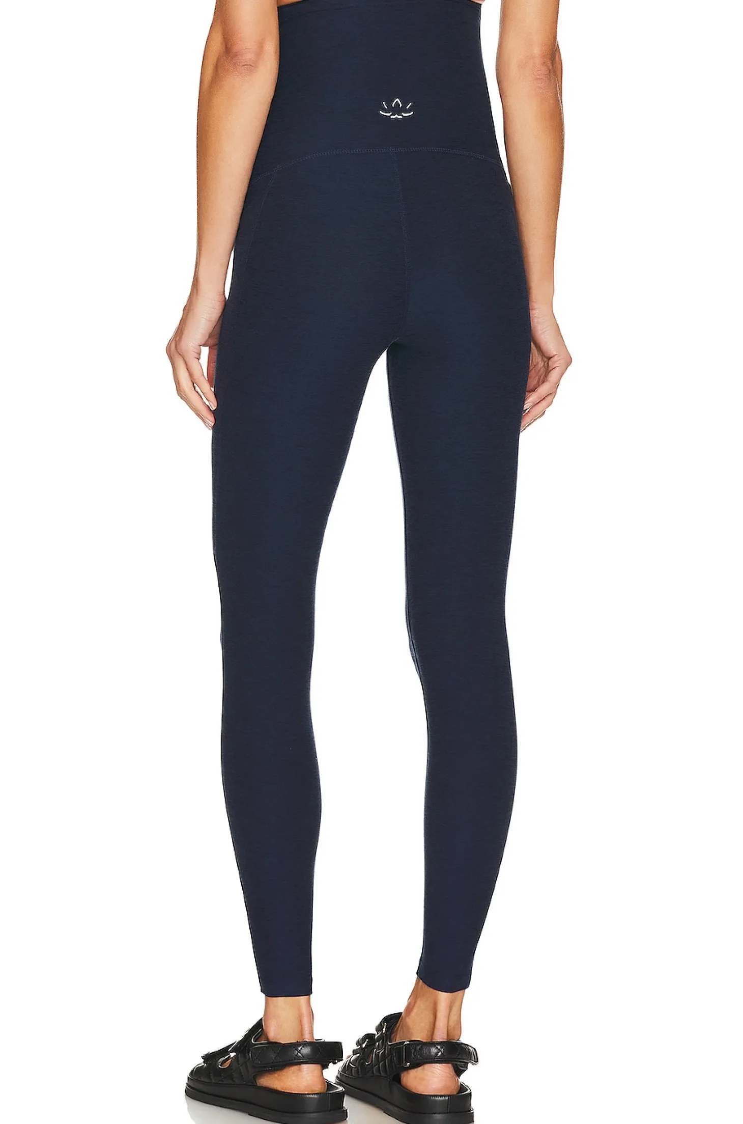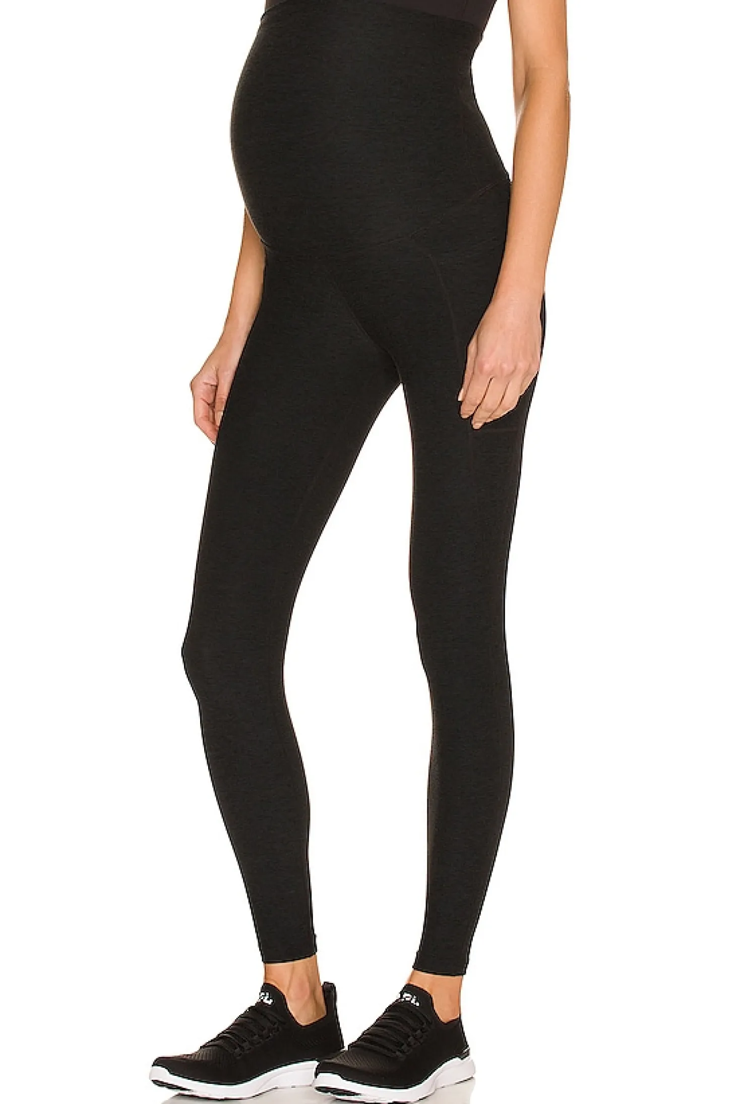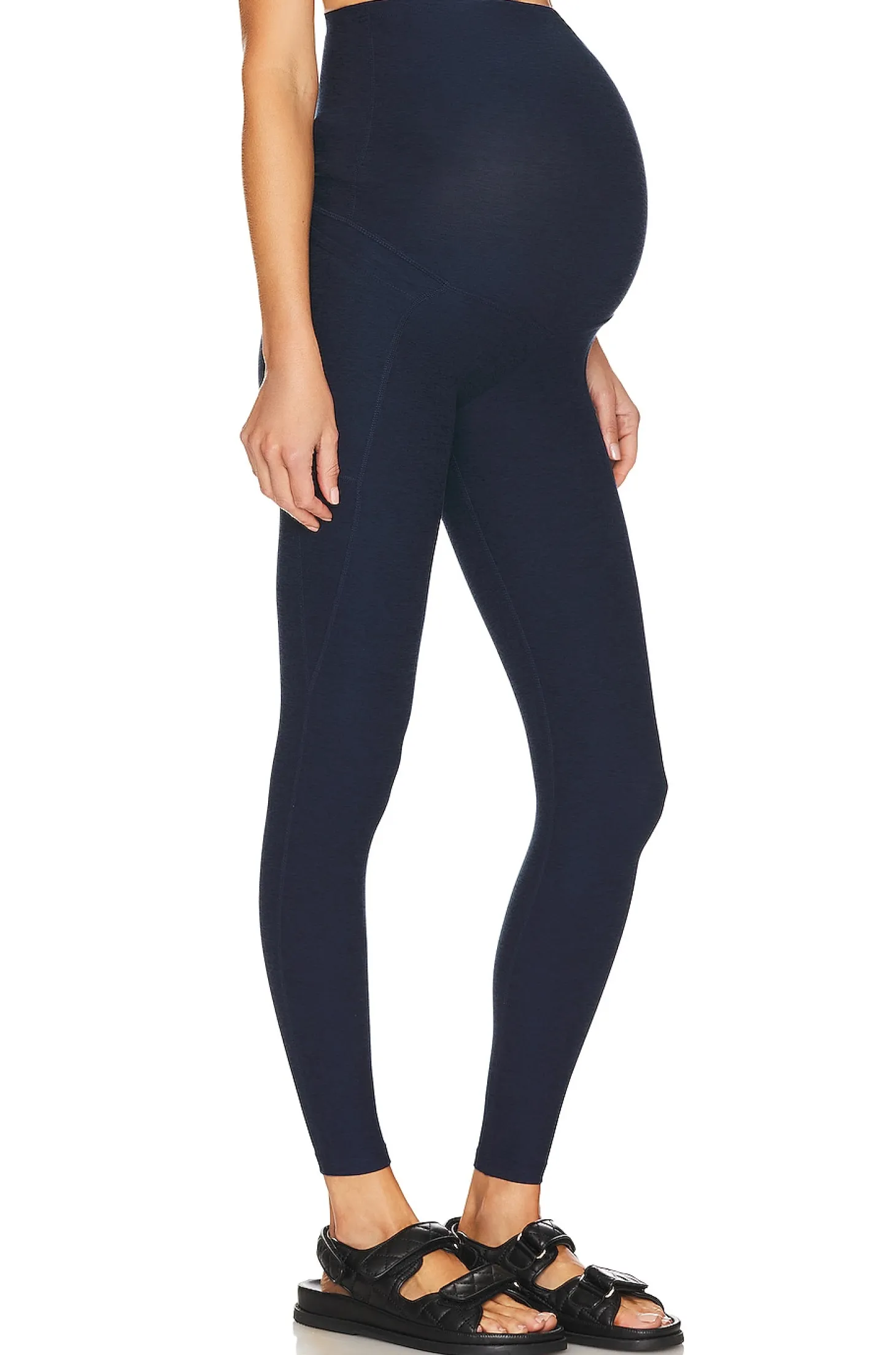 87% polyester 13% spandex.Made in USA.Machine wash.Wide stretch waistband.Made to fit all through pregnancy.4-way stretch