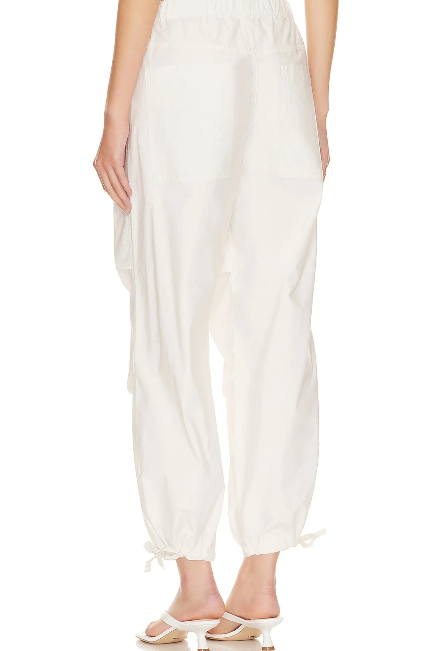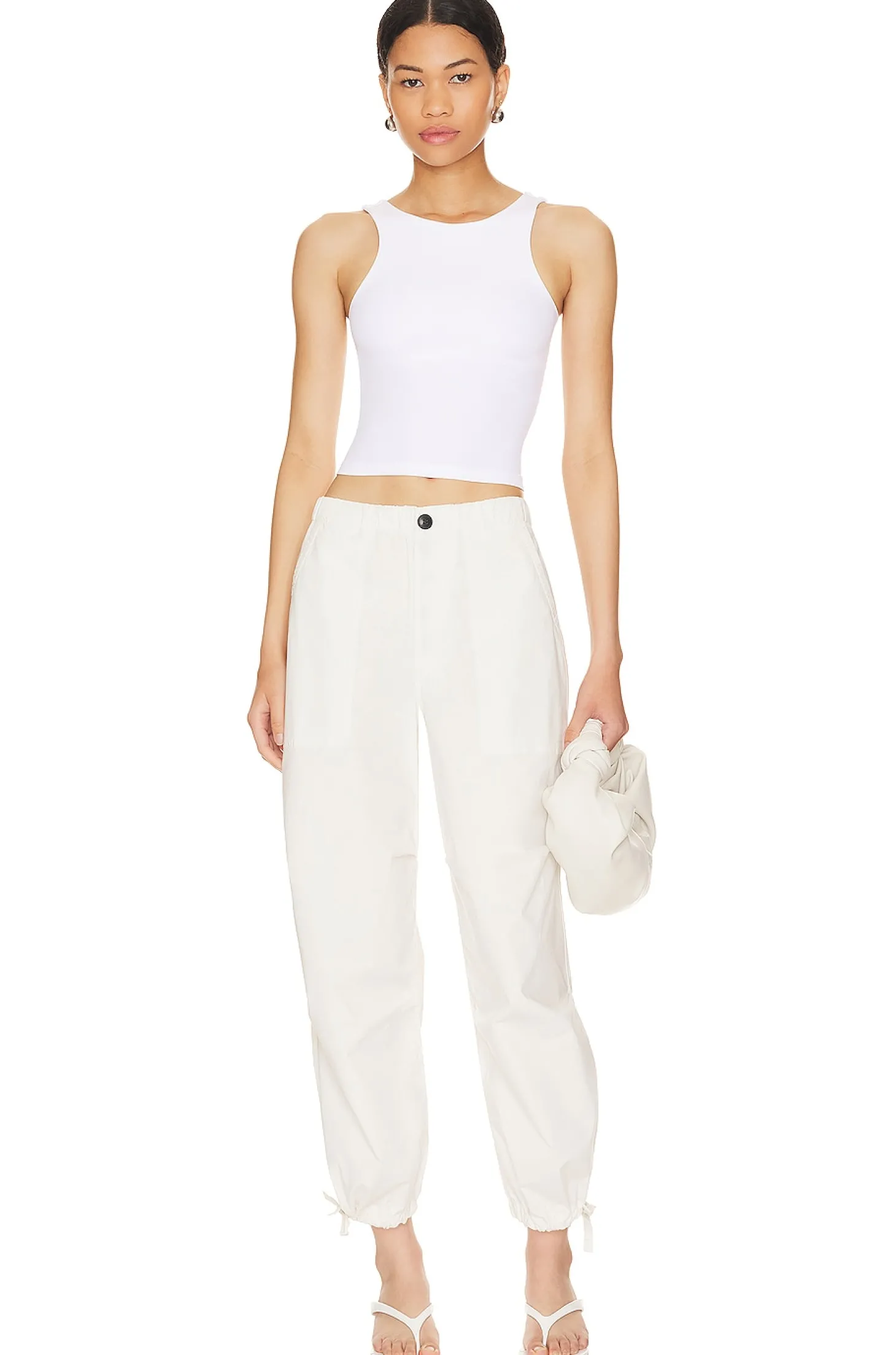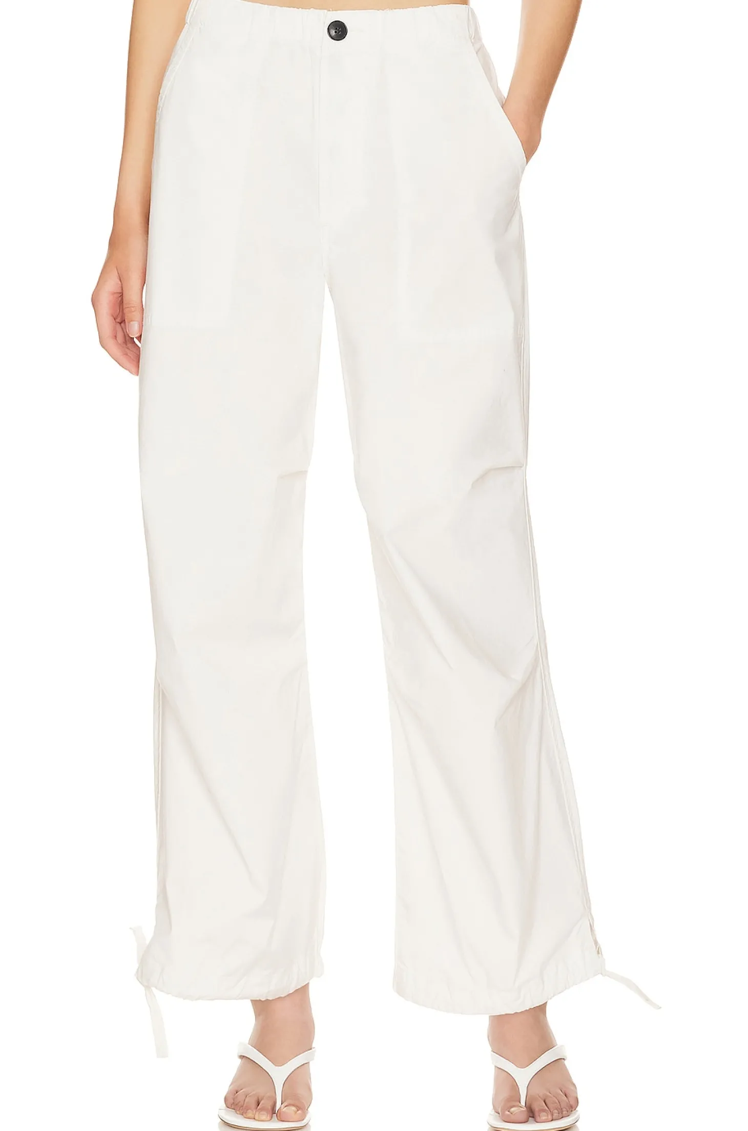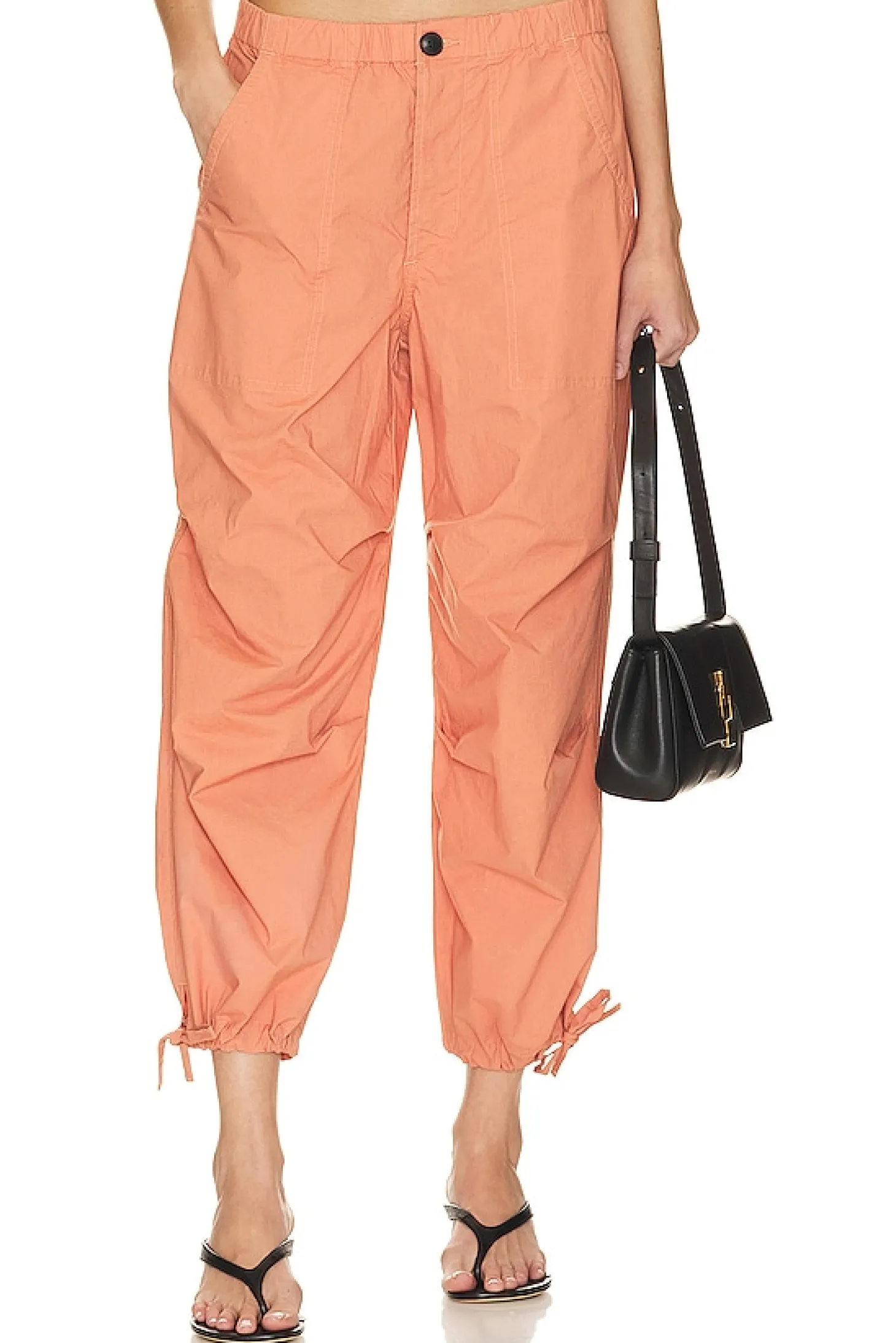 97% cotton 3% elastane.Made in Turkey.Machine wash.Button fly Elastic waistband.4-pocket styling.Drawstring cuffs.Lightweight ripstop fabric.24" at the knee narrows to 20" at the leg opening