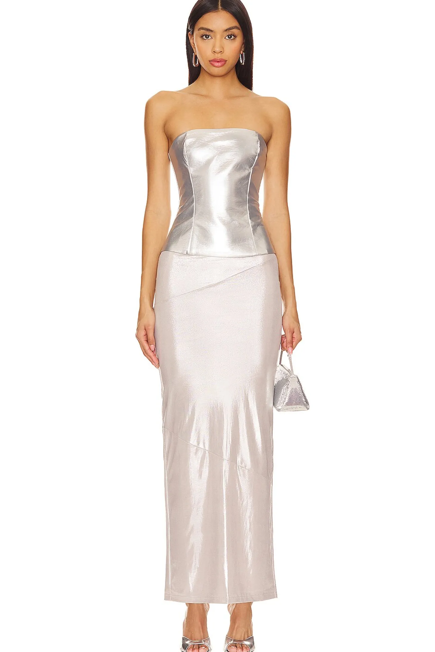 Shine in the superdown Lucia Column Skirt in Silver. Crafted from metallic jersey fabric, this maxi-length skirt features a back slit for added allure. Make a chic statement during your next night out and embrace the glamorous vibes of this stunning piece..95% polyester 5% spandex.Made in China.Hand wash.Fully lined.Stretch metallic jersey fabric with back vent.Item not sold as a set.Skirt measures approx 42" in length