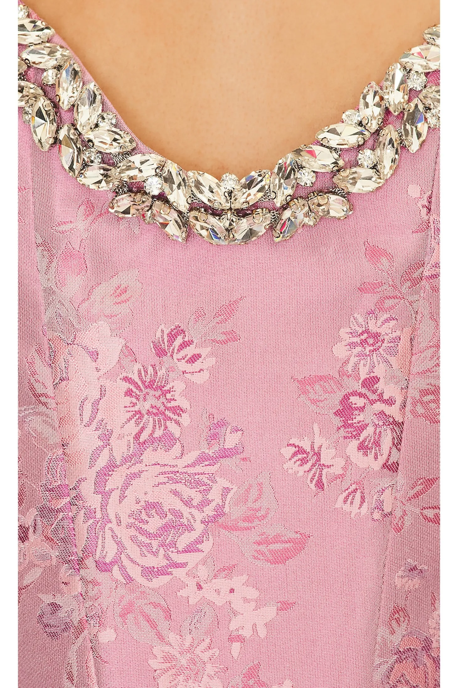 100% polyester.Made in China.Dry clean recommended.Unlined.Back lace-up tie closure.Boned bodice.Midweight jacquard fabric with crystal embellished trim.Neckline to hem measures approx 42" in length