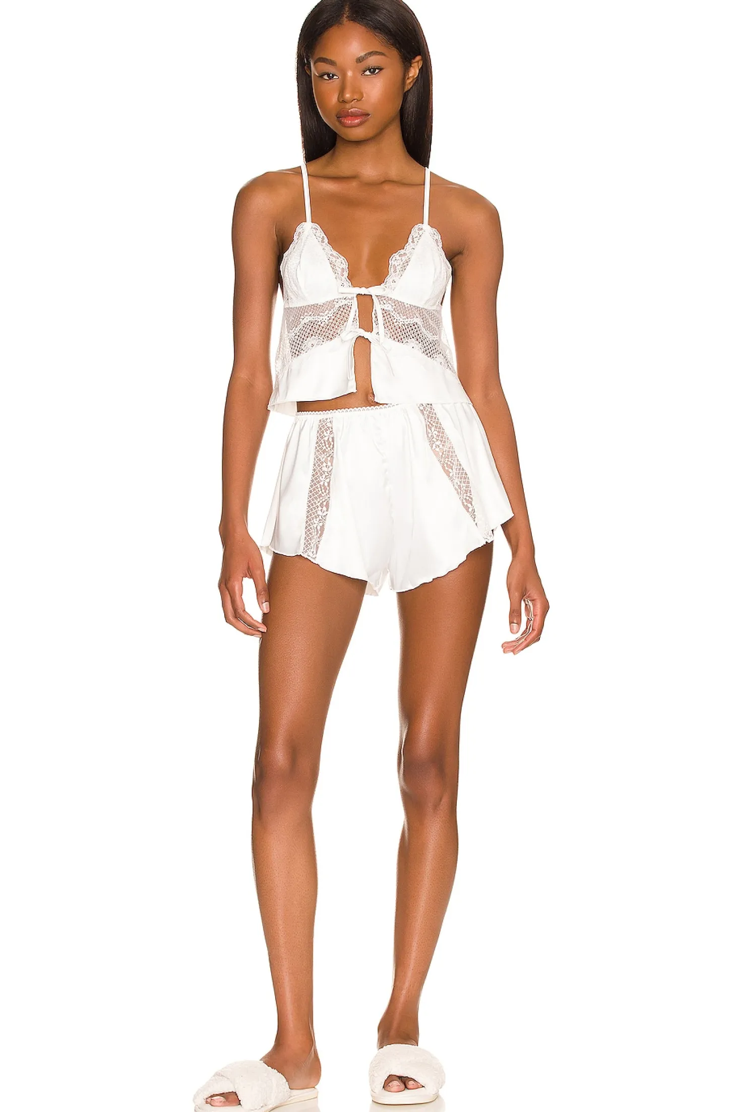 93% poly 7% elastane.Made in China.Hand wash.Elastic waistband trim.Sheer lace and sheen satin panels.Item not sold as a set