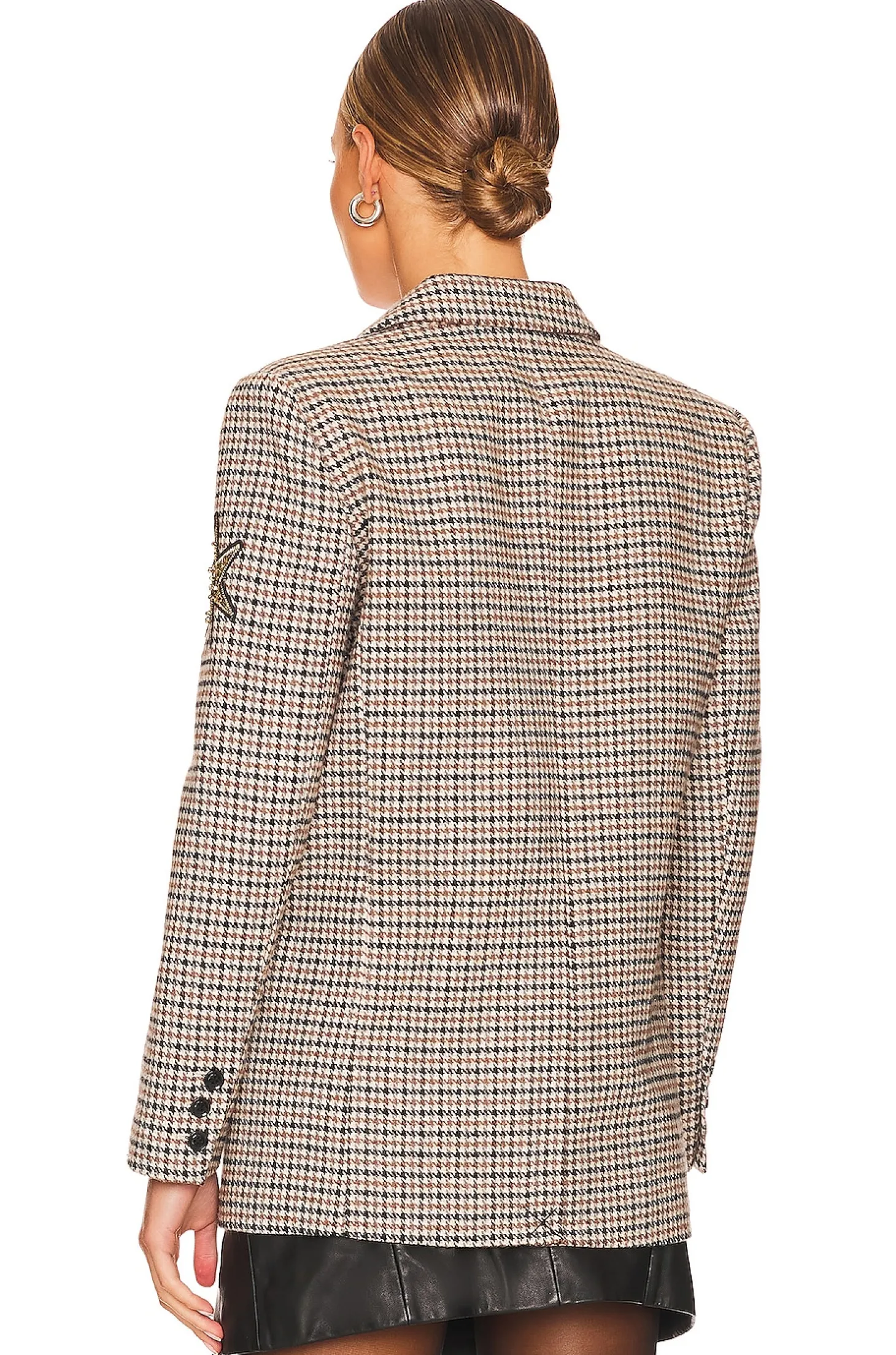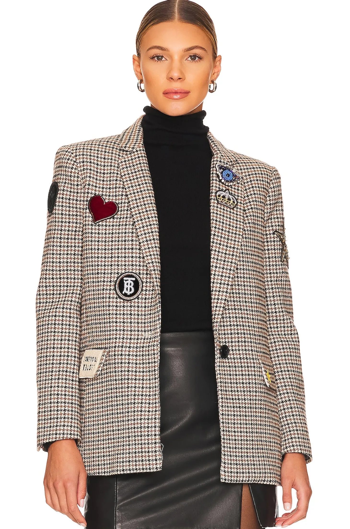 Shell: 100% polyester Lining: 55% polyester 45% viscose.Made in China.Dry clean recommended.Front button closure.Front flap pockets.Buttoned cuffs.Allover patch detail.Tweed fabric