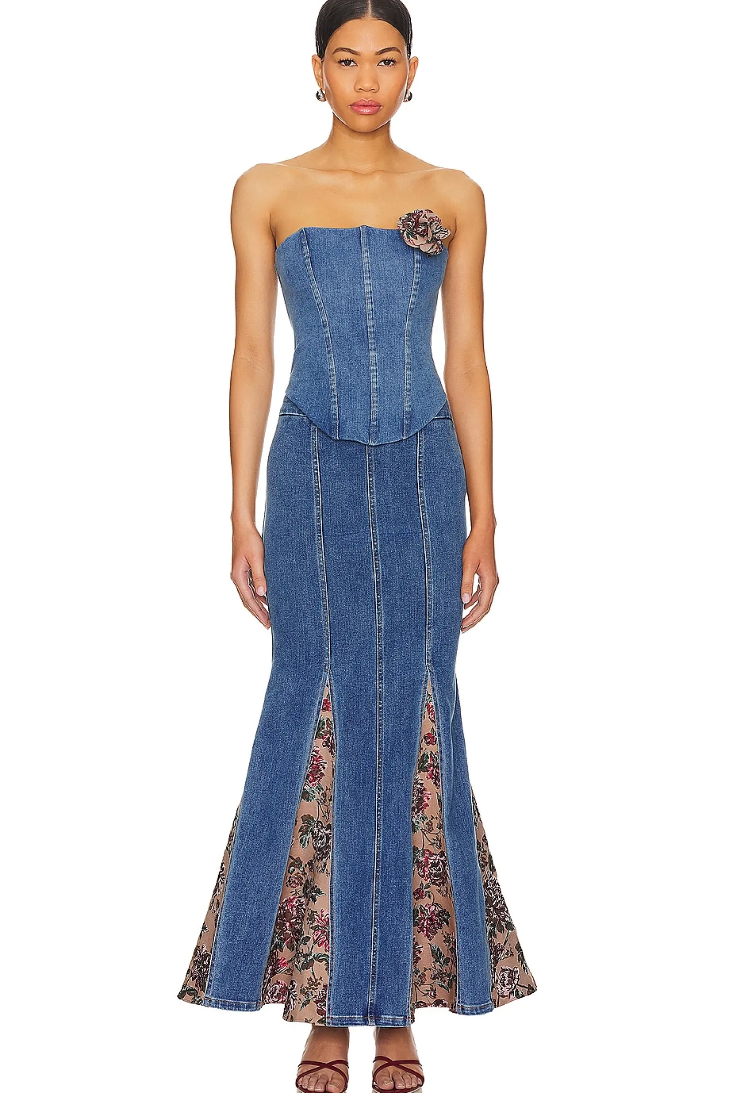 Introducing the MAJORELLE Luda Maxi Skirt in a serene Washed Blue hue. Crafted from a blend of denim and jacquard fabric, this skirt exudes boho elegance. Paired with its matching top, it creates a cohesive and stylish ensemble that's perfect for a laid-back brunch or casual daytime gatherings. Embrace the free-spirited vibe with this effortlessly chic maxi skirt..Self: 92% cotton 6% polyester 2% elastane Contrast Fabric: 70% polyester 30% metallic.Made in China.Dry clean only.Unlined.Hidden side zipper closure.Midweight denim and jacquard fabric Item not sold as a set.Skirt measures approx 38" in length