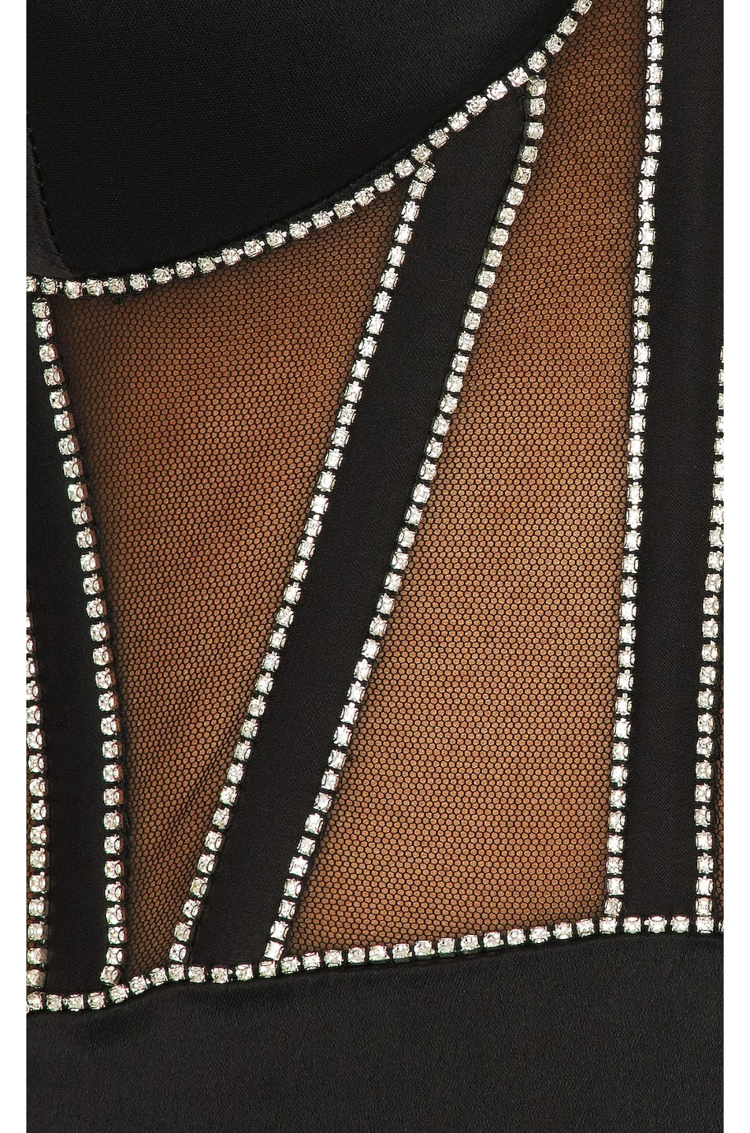 Self: 100% polyester Lining: 95% polyester 5% lycra.Made in India.Dry clean only.Fully lined.Hidden back zipper closure.Lightly padded bust Sheer mesh bodice with rhinestone embellished trim.Sheen satin fabric.Neckline to hem measures approx 21" in length