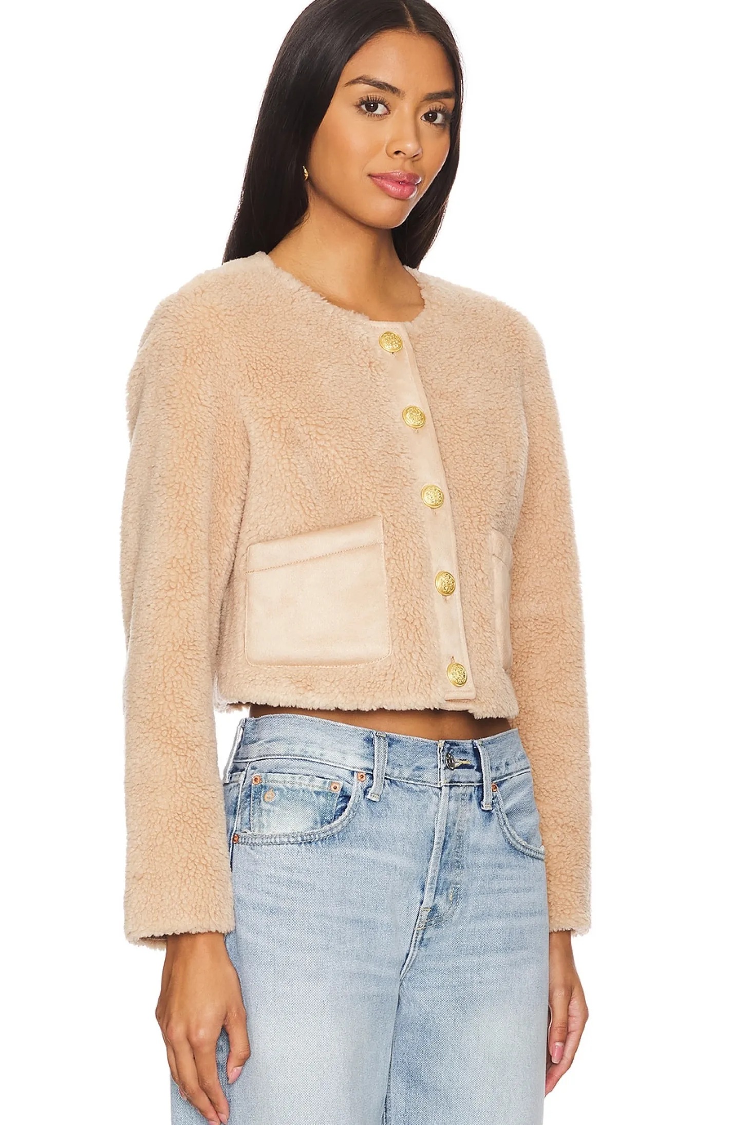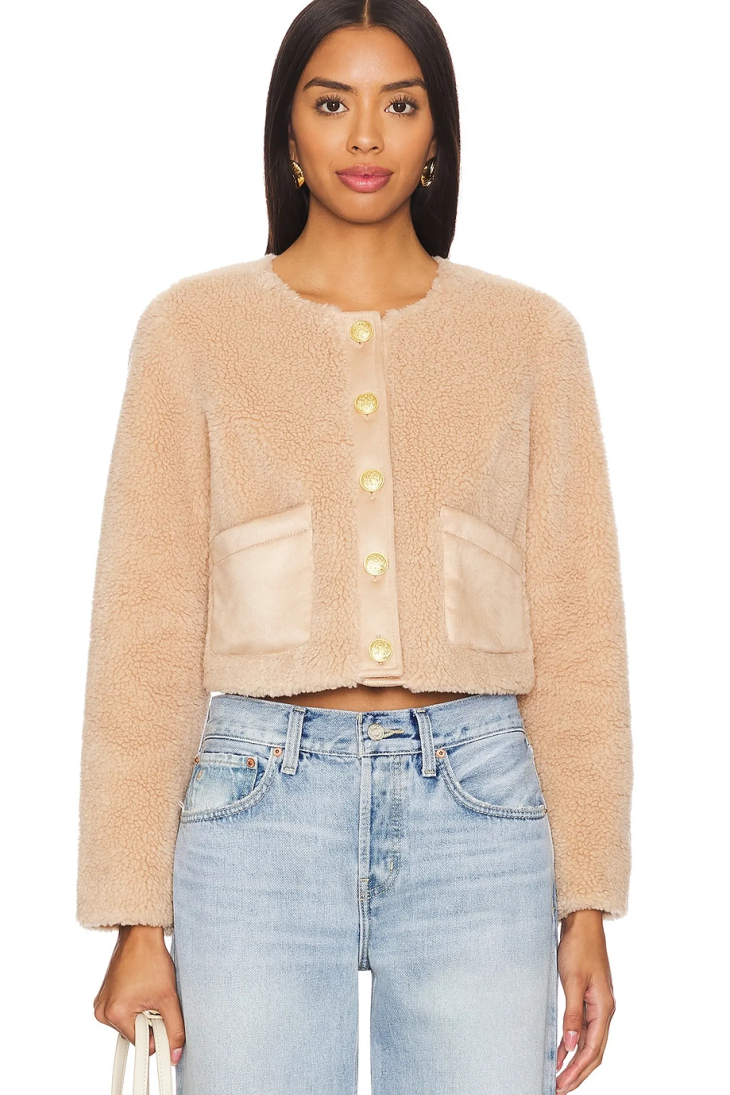 100% polyester.Made in China.Dry clean only.Front button closure.Front slip pockets.Sherpa fabric