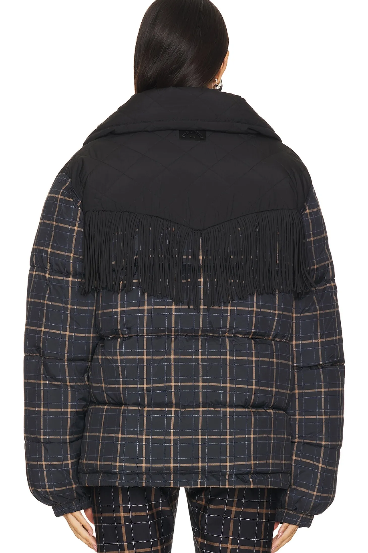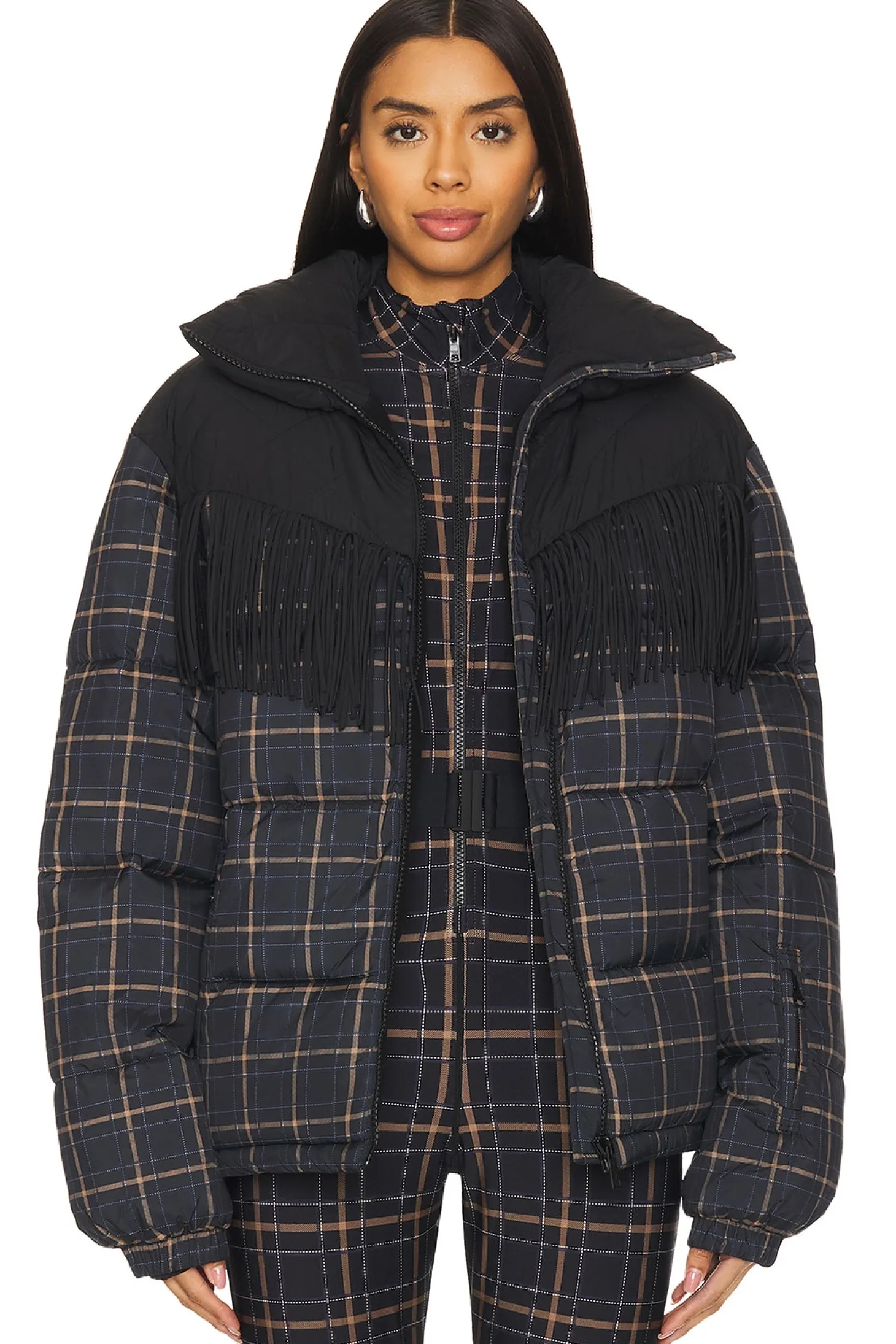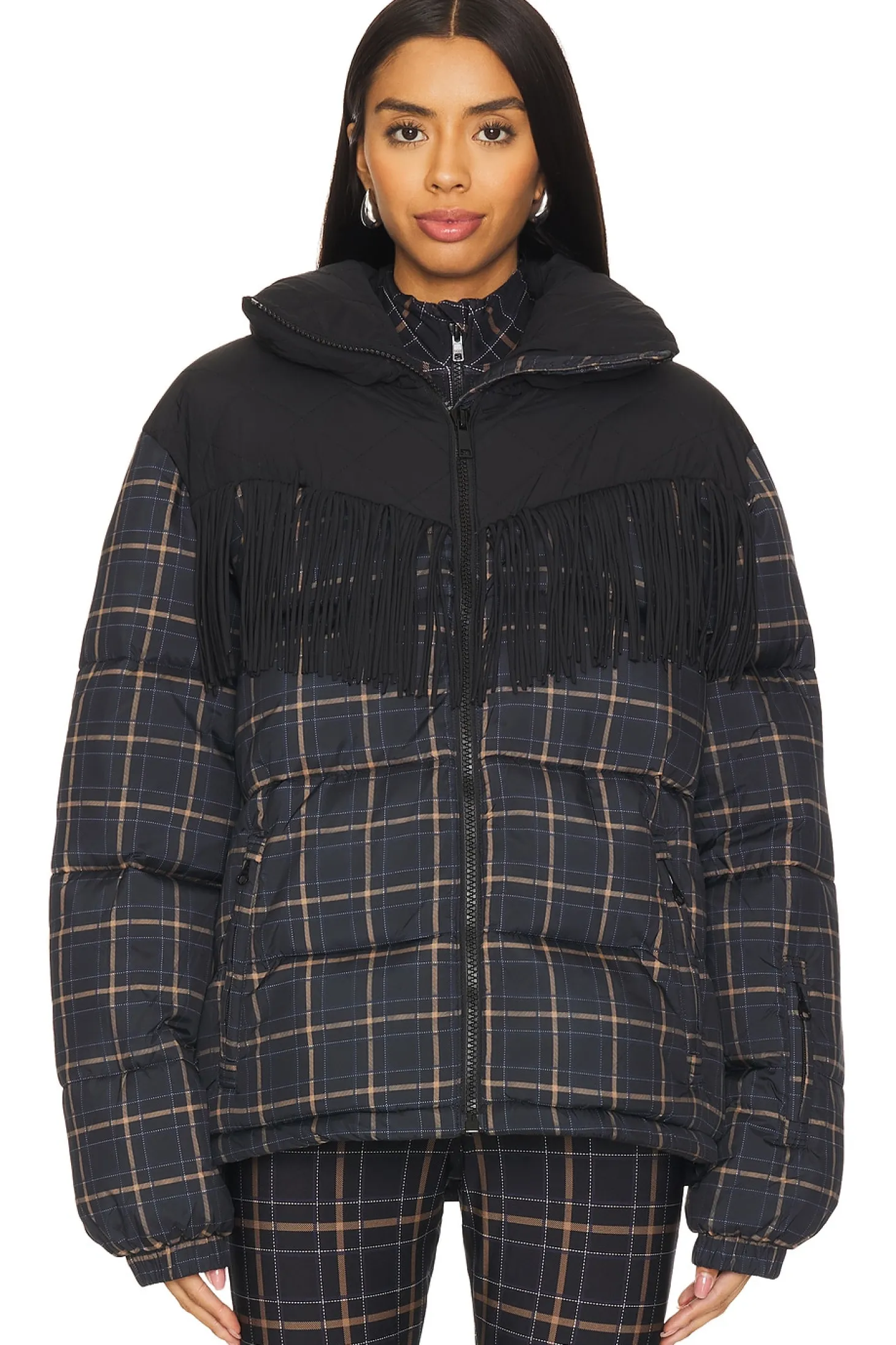 100% polyester.Made in China.Machine wash.Exposed front zipper closure with optional waist belt.Side zip pockets.Zip sleeve pockets.Padded ripstop fabric with fringe accent and pull-cord waistline.Item not sold as set