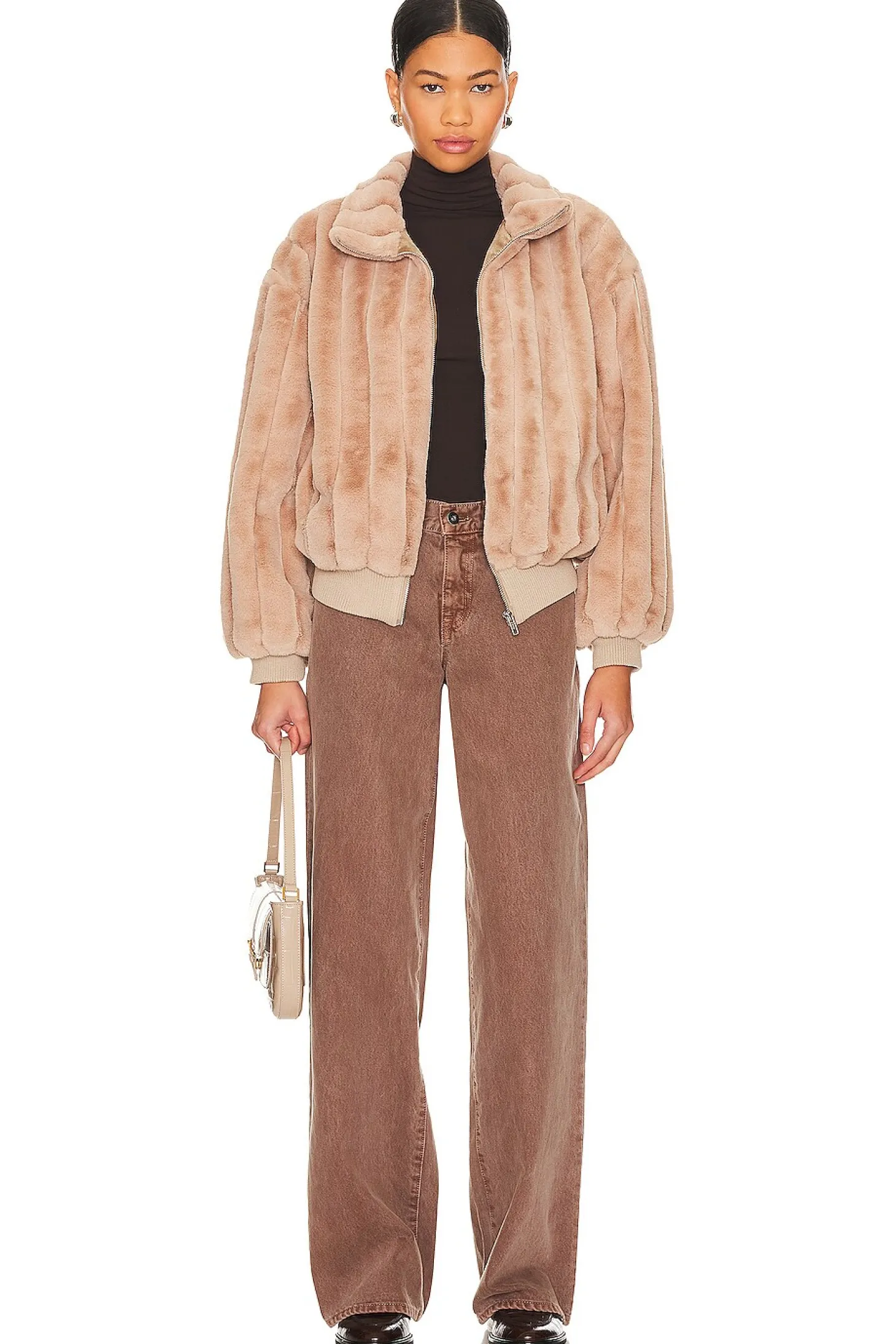 100% polyester.Made in China.Dry clean only.Front zipper closure.Side seam pockets.Teddy faux fur fabric.This oversized faux fur bomber jacket from Line & Dot feels like butter. This style pairs well with baggy denim and a tee for a cool girl look.