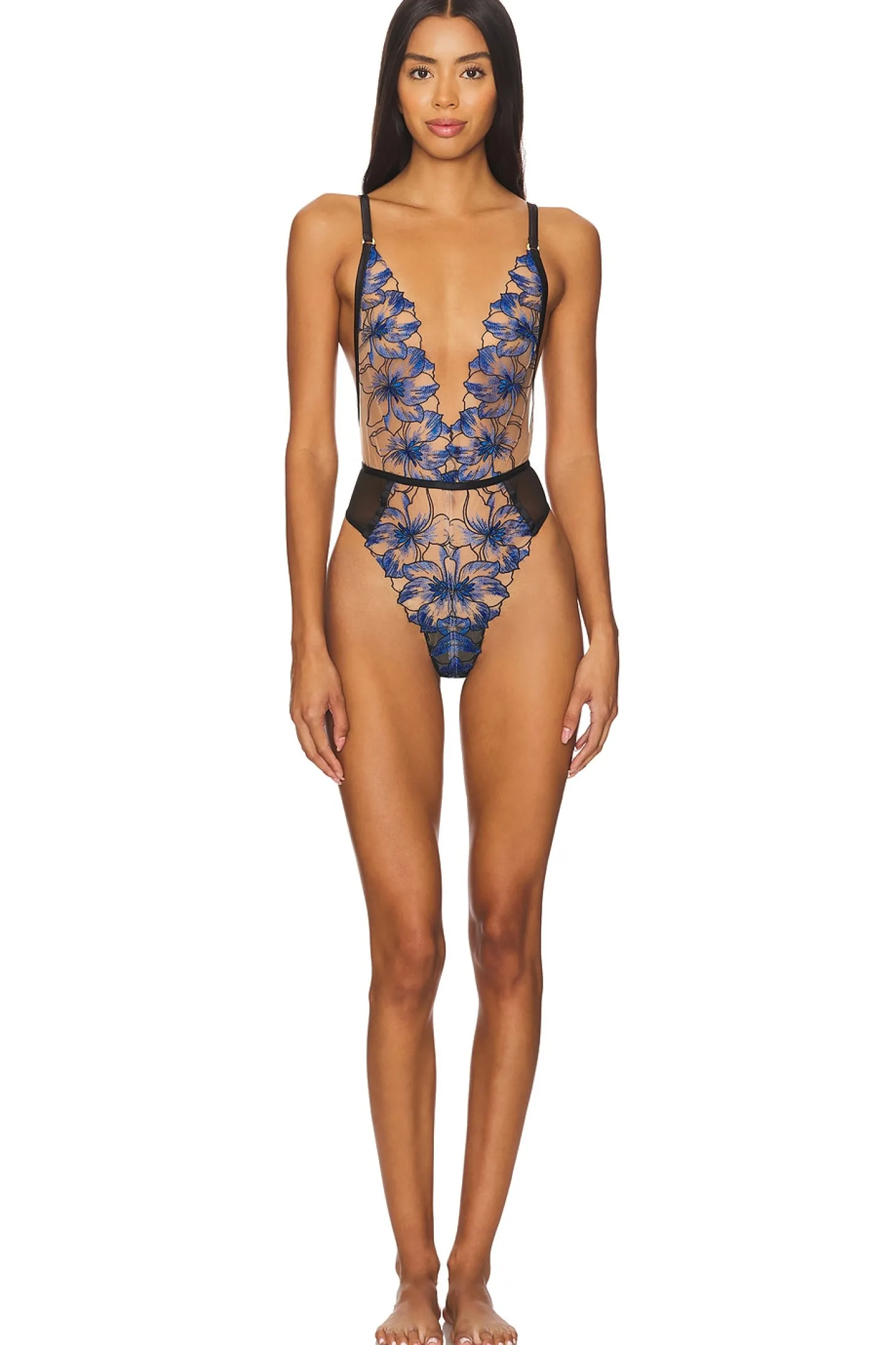 Self: 85% polyamide 15% elastane Gusset: 100% viscose.Made in China.Machine wash.Gusset pull-on styling with thong back.Plunging neckline.Lightweight mesh fabric