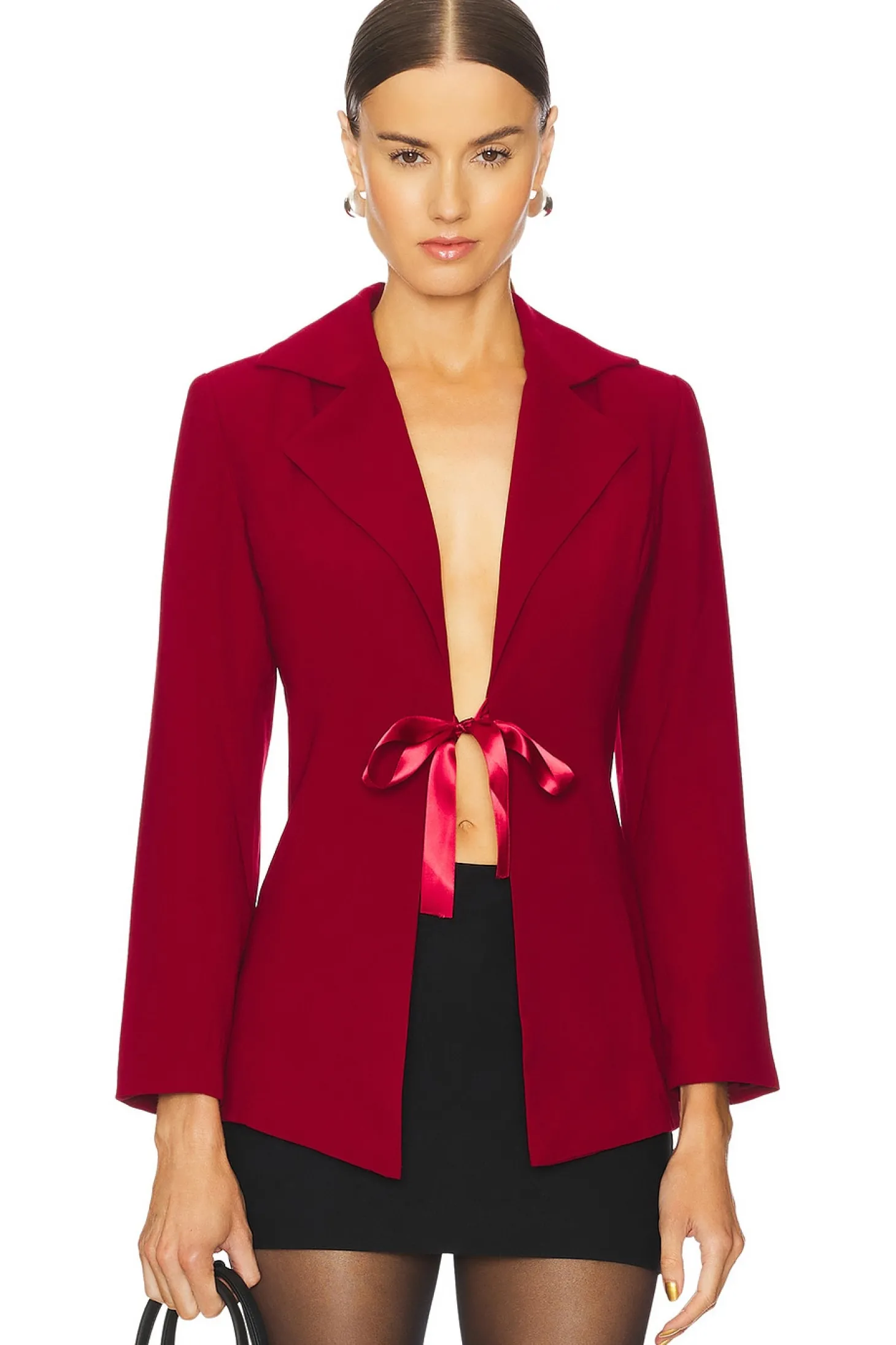 100% polyester.Made in China.Machine wash.Front tie-up closure.Light padding at shoulders.Buttoned cuffs.Chiffon fabric