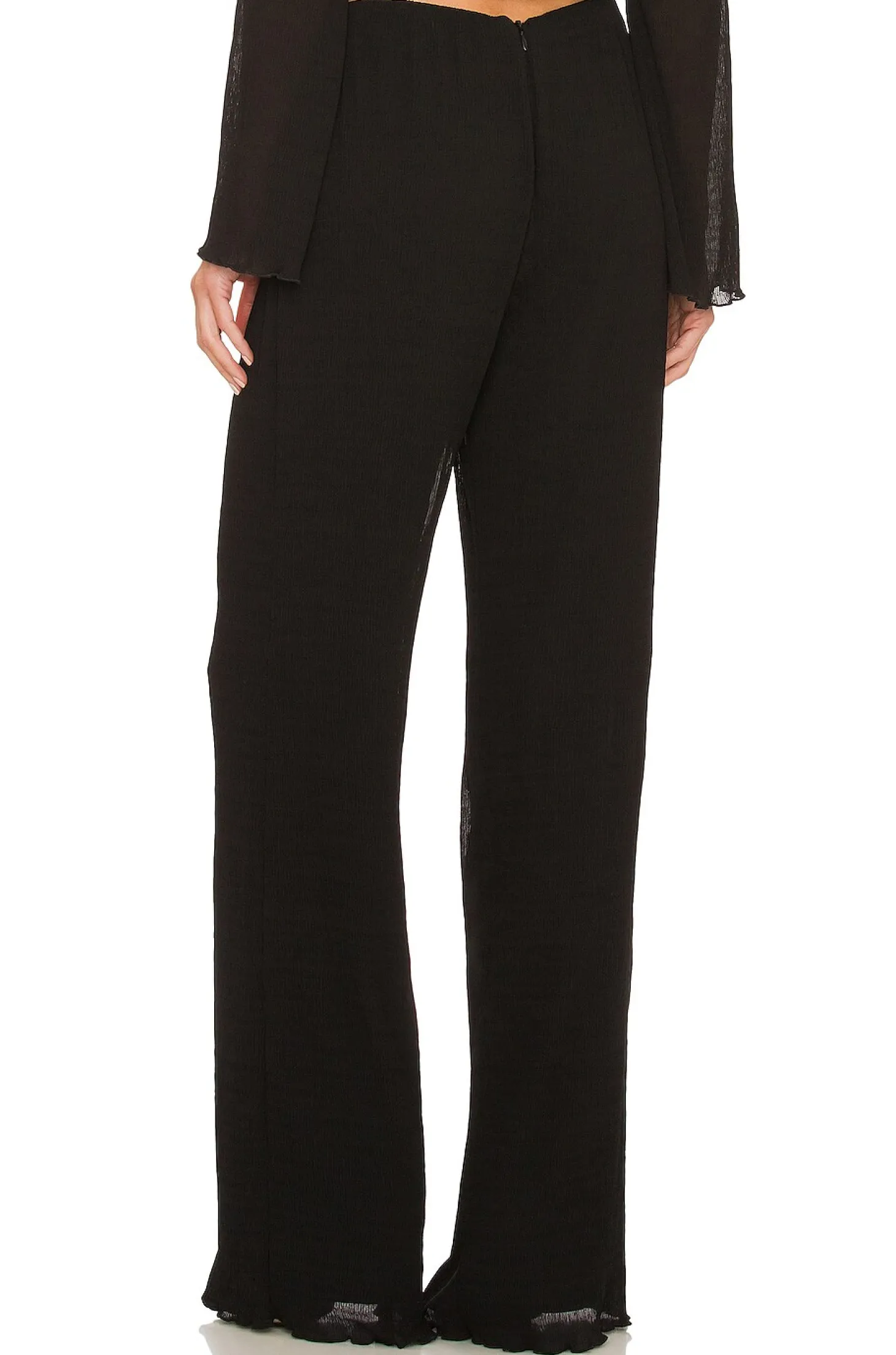 Self: 100% poly Lining: 97% poly 3% spandex.Made in China.Dry clean only.Hidden back zipper closure.Crinkle crepe fabric.Item not sold as a set.24" at the knee and 24" at the leg opening