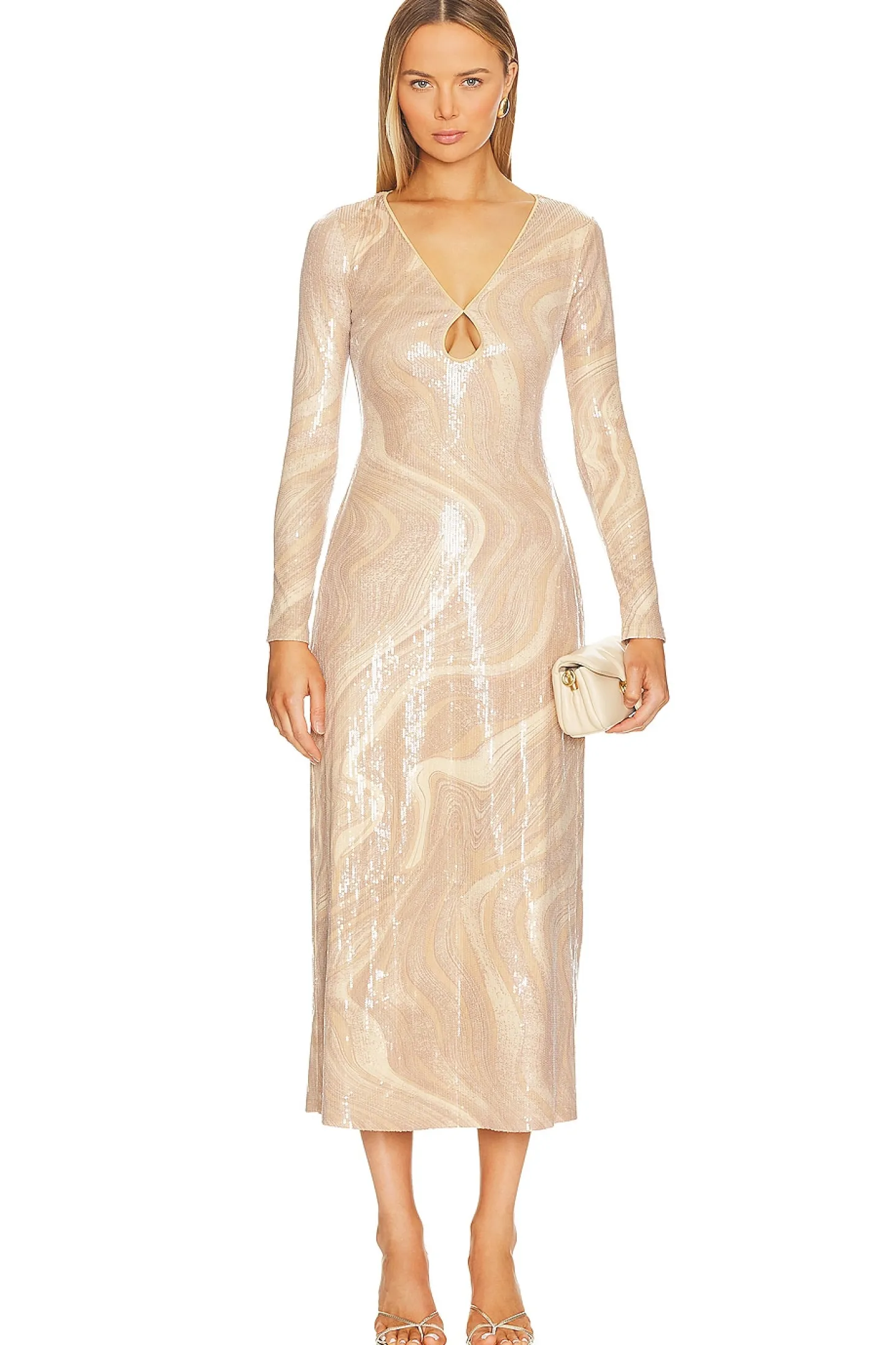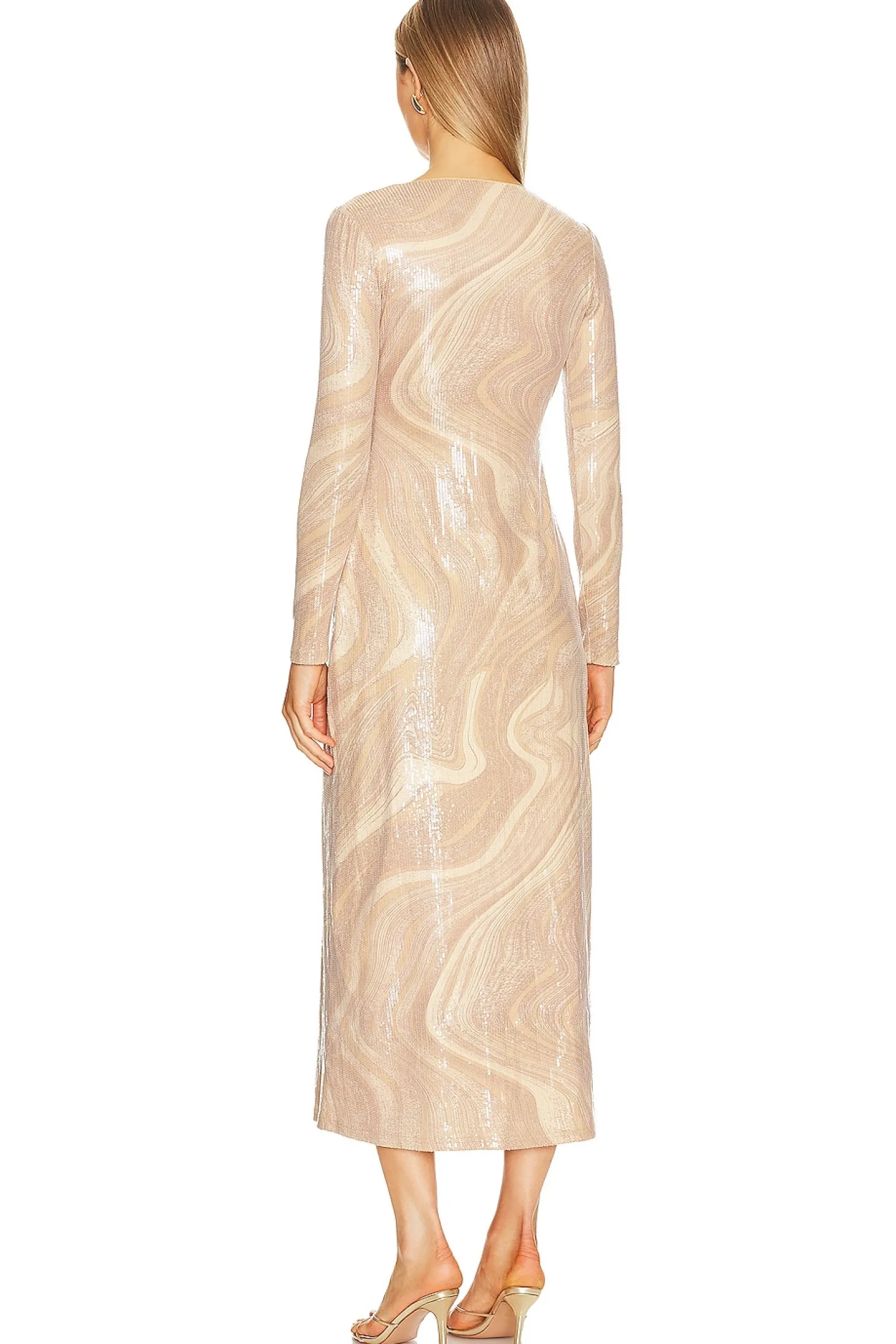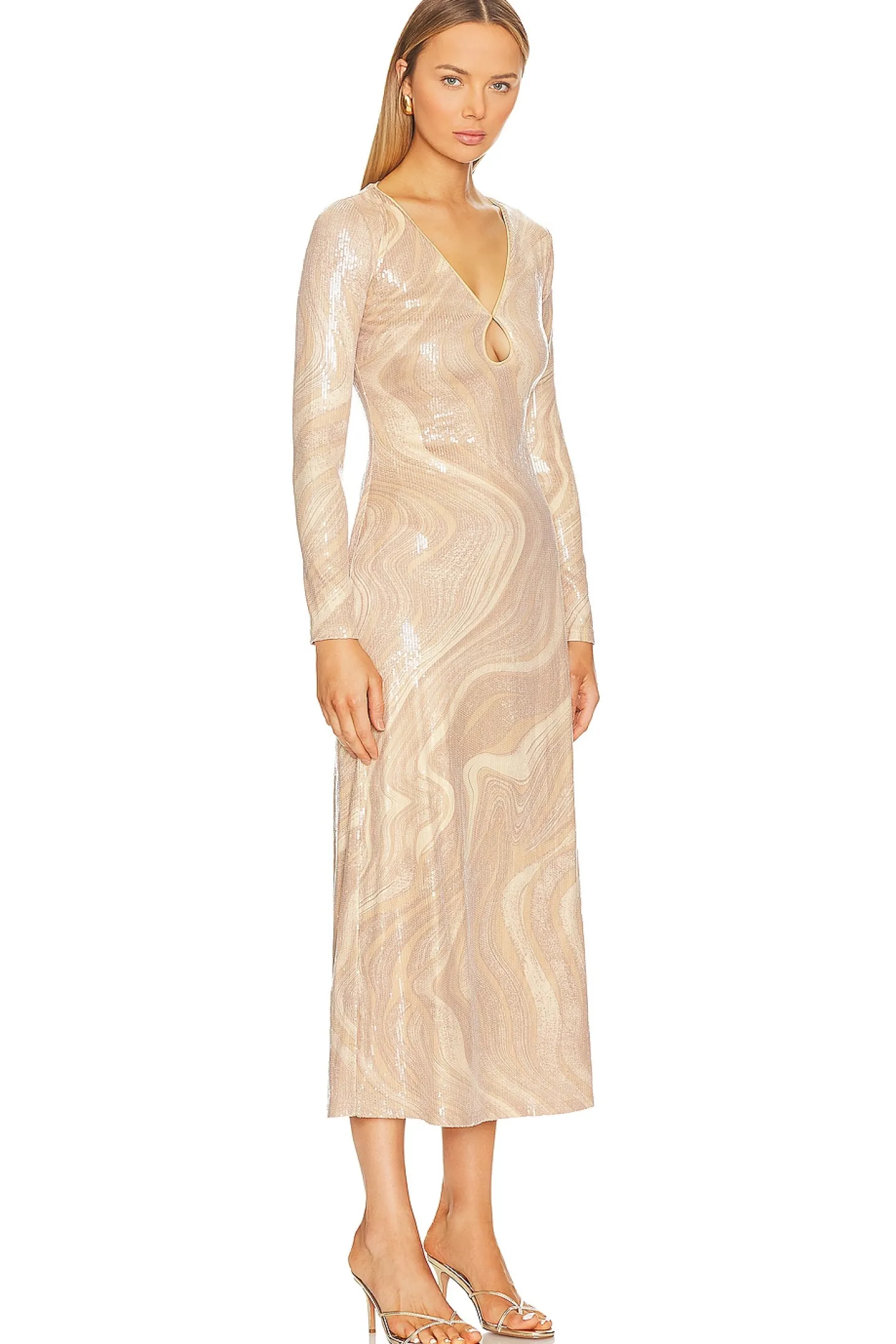 Polyamide blend.Imported.Dry clean recommended.Fully lined.Pull-on styling.Keyhole cut-out at bust.Tonal sequin embellishments throughout