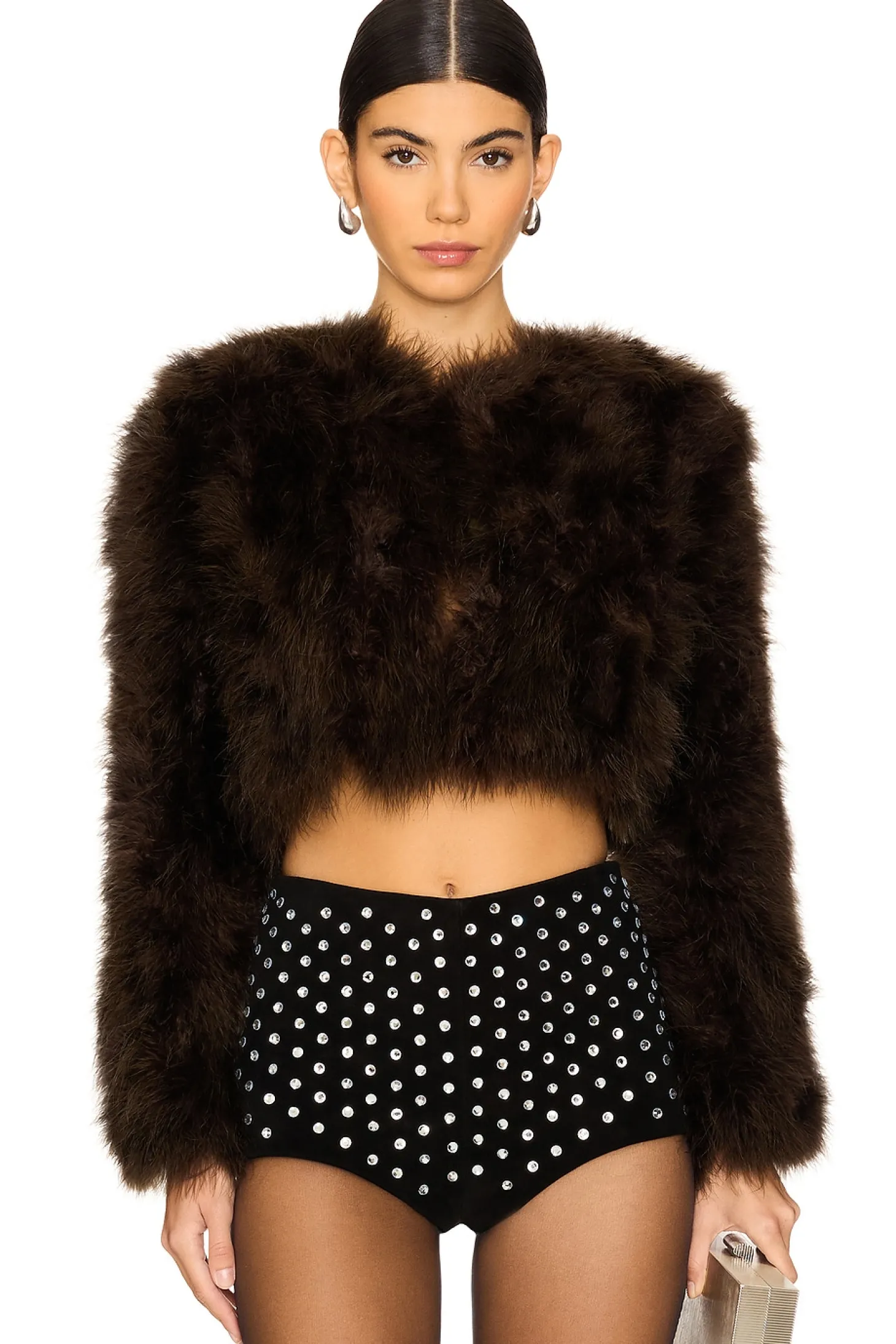Self: real turkey feather Lining: 100% polyester.Made in China.Dry clean only.Front button closure.Feather treatment: dyed Feather Origin: USA.Feather exterior and satin lining