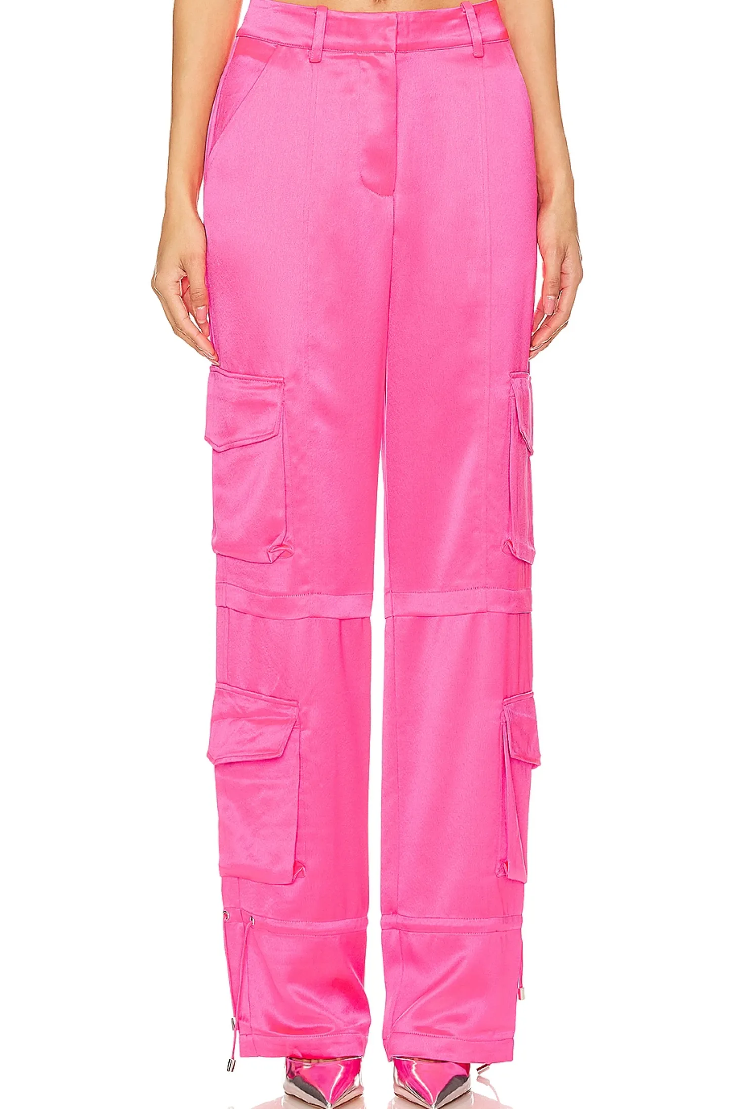 76% acetate 24% polyester.Made in China.Dry clean only.Zip fly with hook and bar closure.8-pocket styling includes four cargo button pockets.Satin fabric with drawstring hem.Item not sold as set.19" at the knee and 19" at the leg opening Size XS waist circumference measures approx 29"