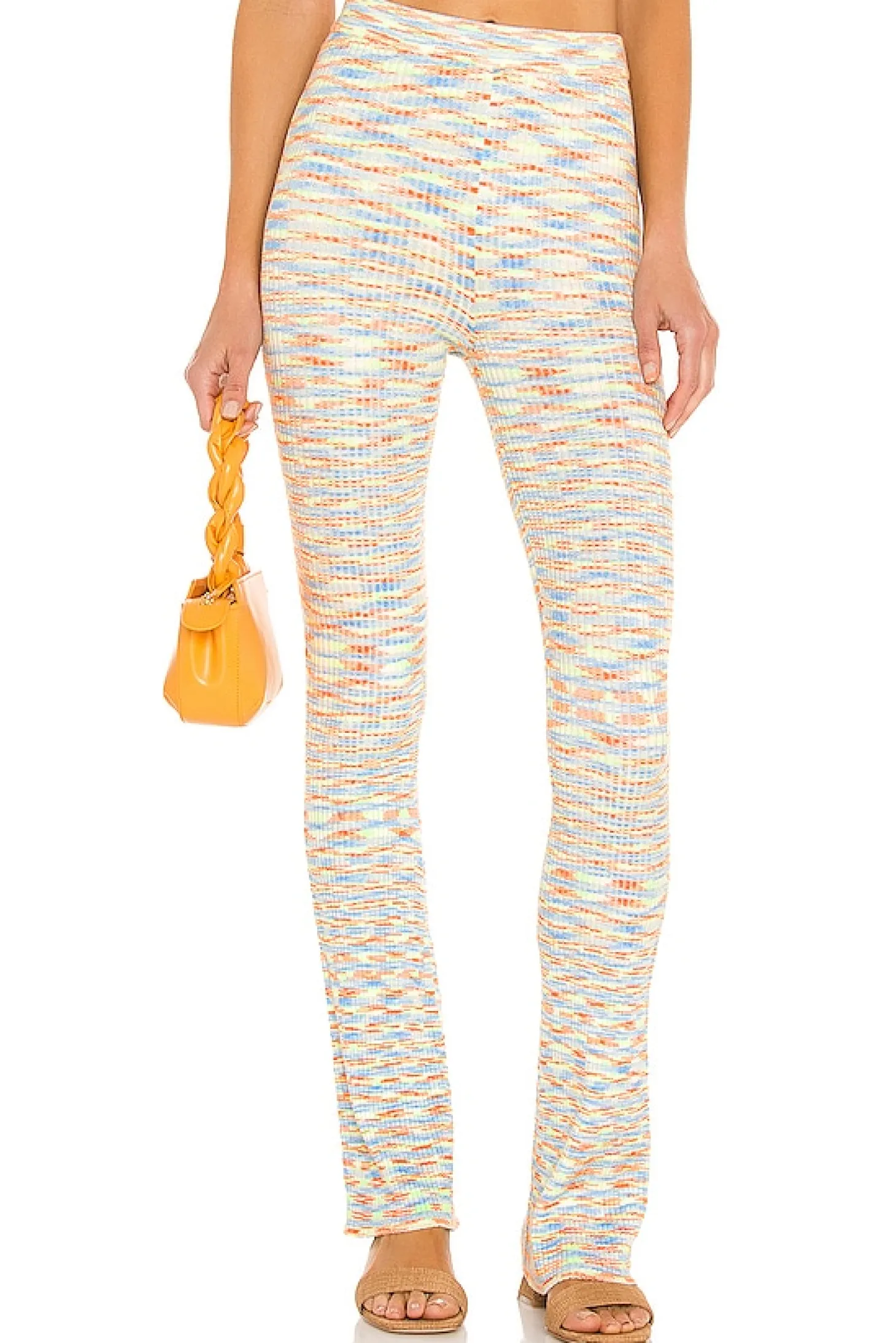 70% viscose 15% polybutylene terephthalate 10% nylon 5% spandex.Made in China.Hand wash.Pull-on styling with elastic waistband.Ribbed knit fabric.Item not sold as a set.8" at the knee narrows to 16" at the leg opening
