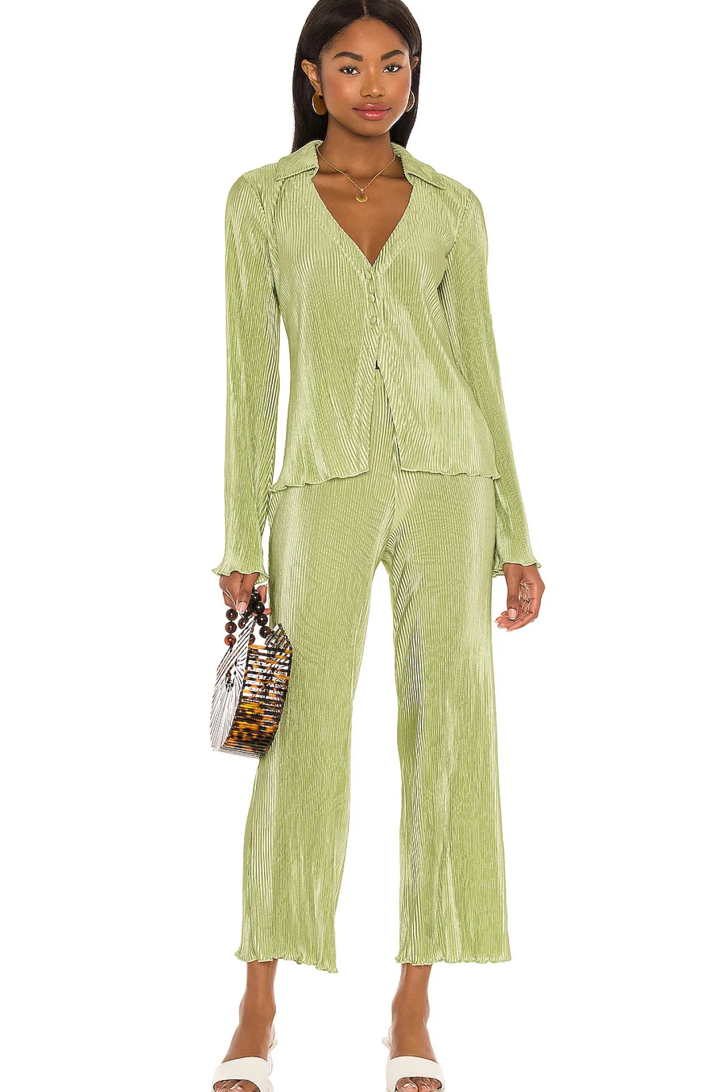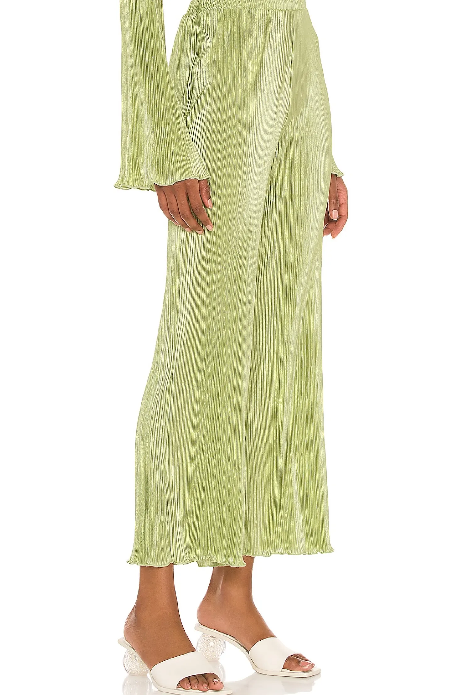 100% poly.Dry clean only.Elasticized waistband.Lettuce trim edges.Pleated lightweight fabric.Item not sold as a set.14" at the knee breaks to 19" at the leg opening.Imported