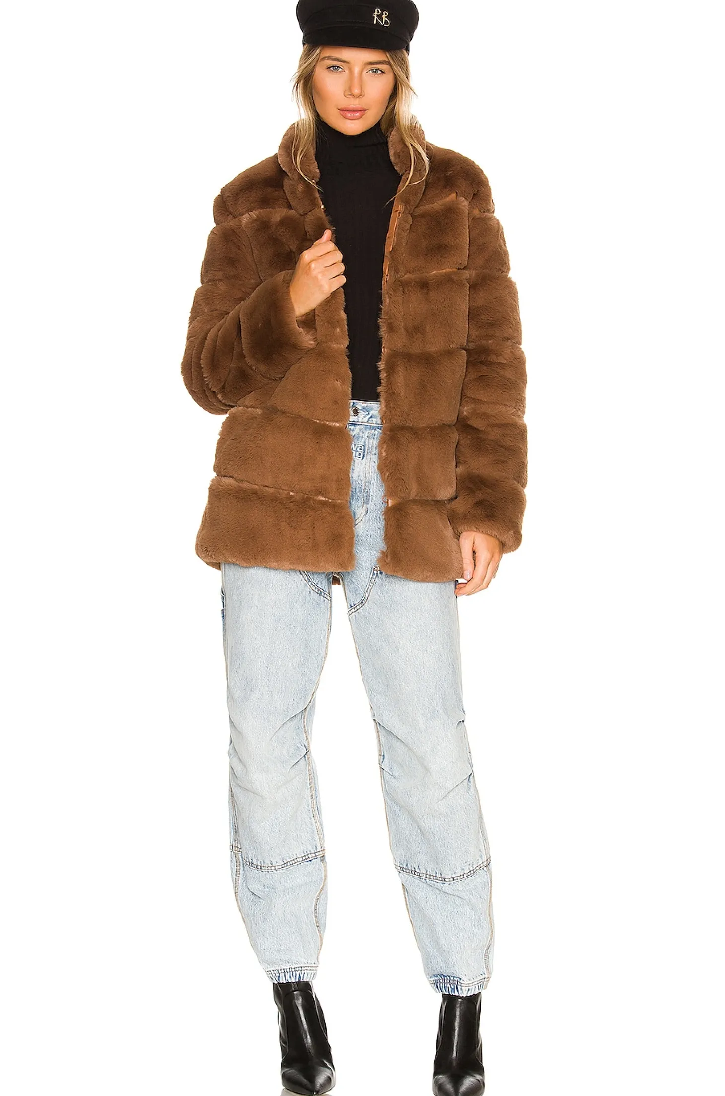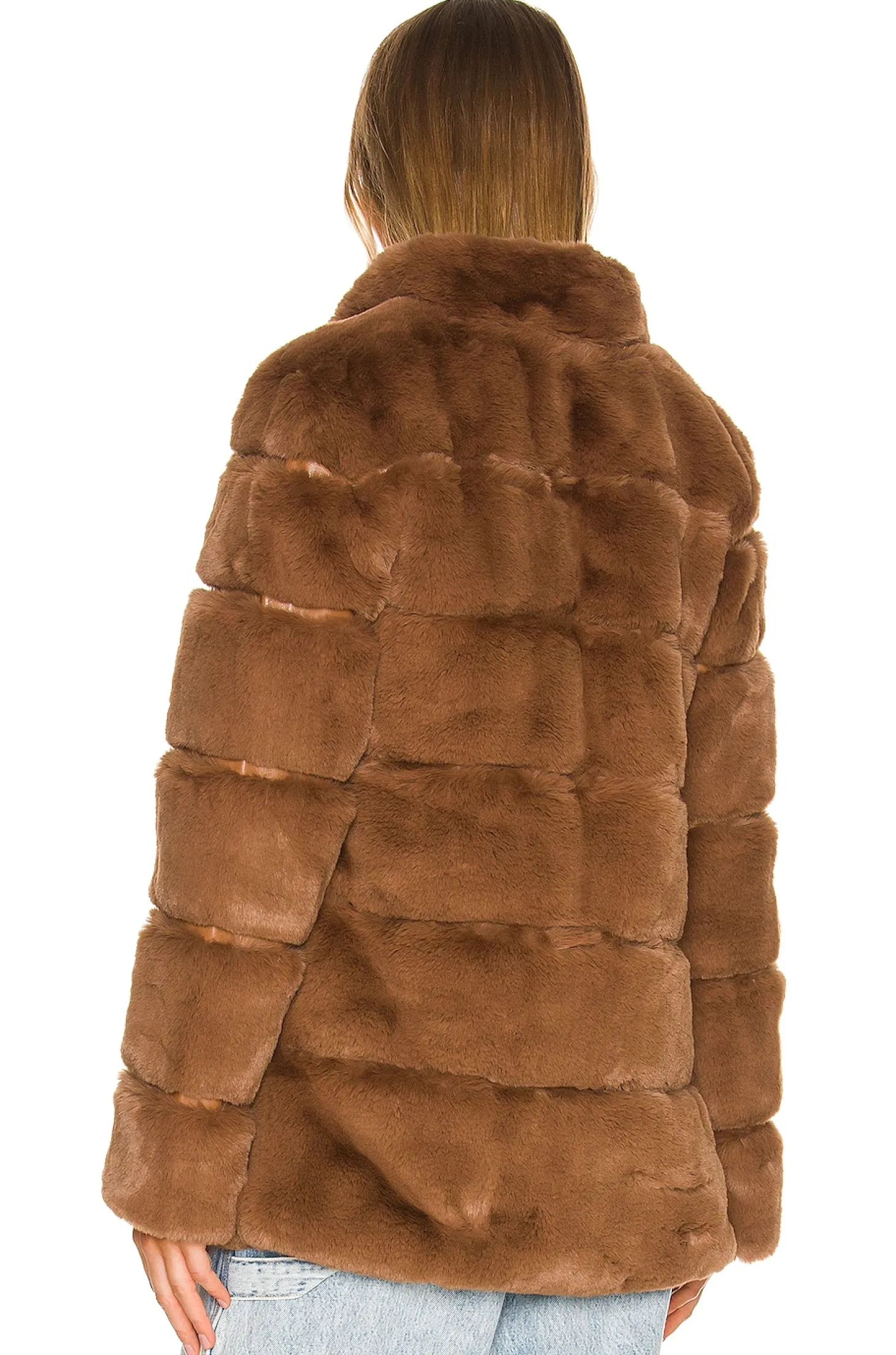 100% poly.Made in China.Dry clean only.Hidden front hook and eye closure.Side seam pockets.Plush faux fur fabric
