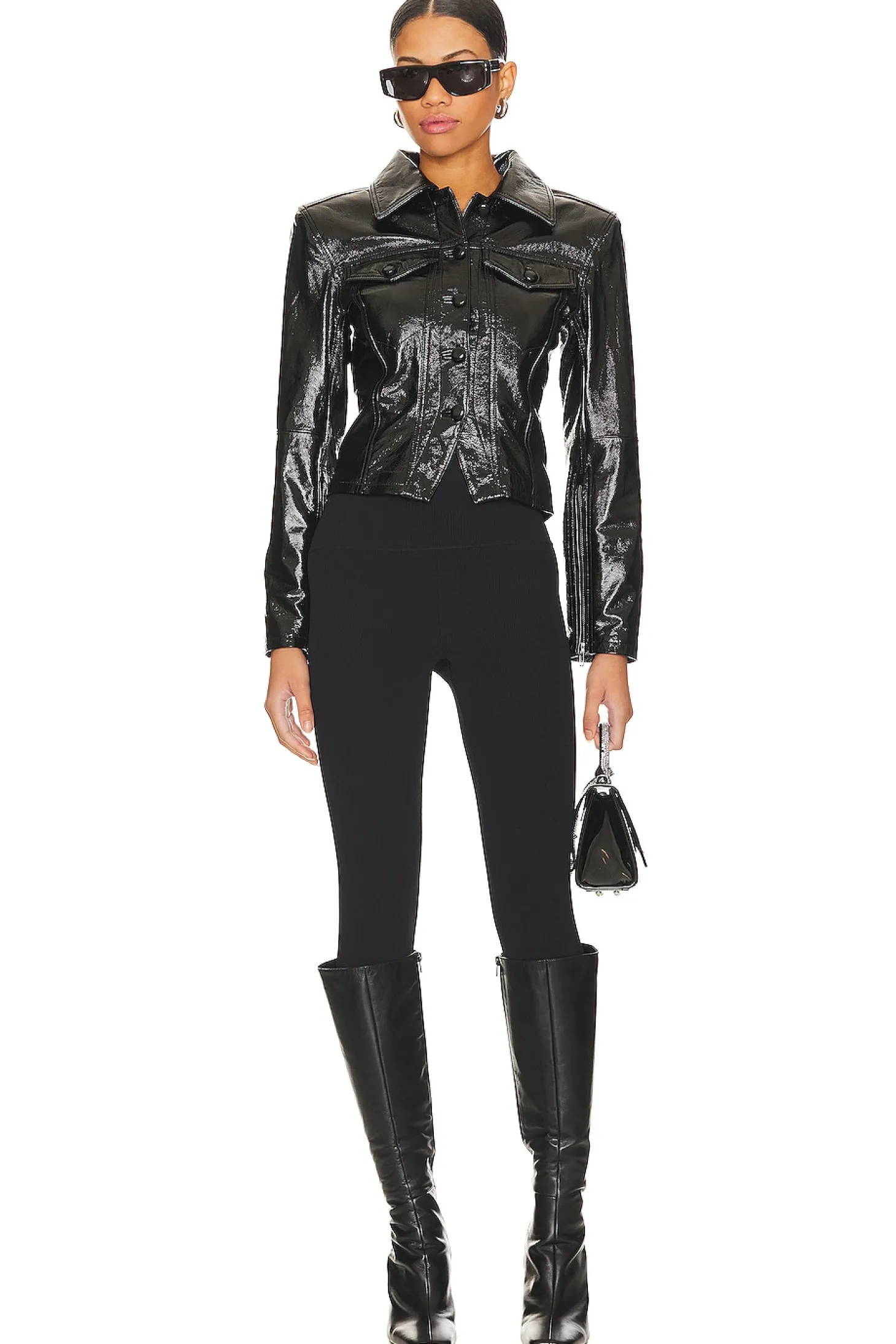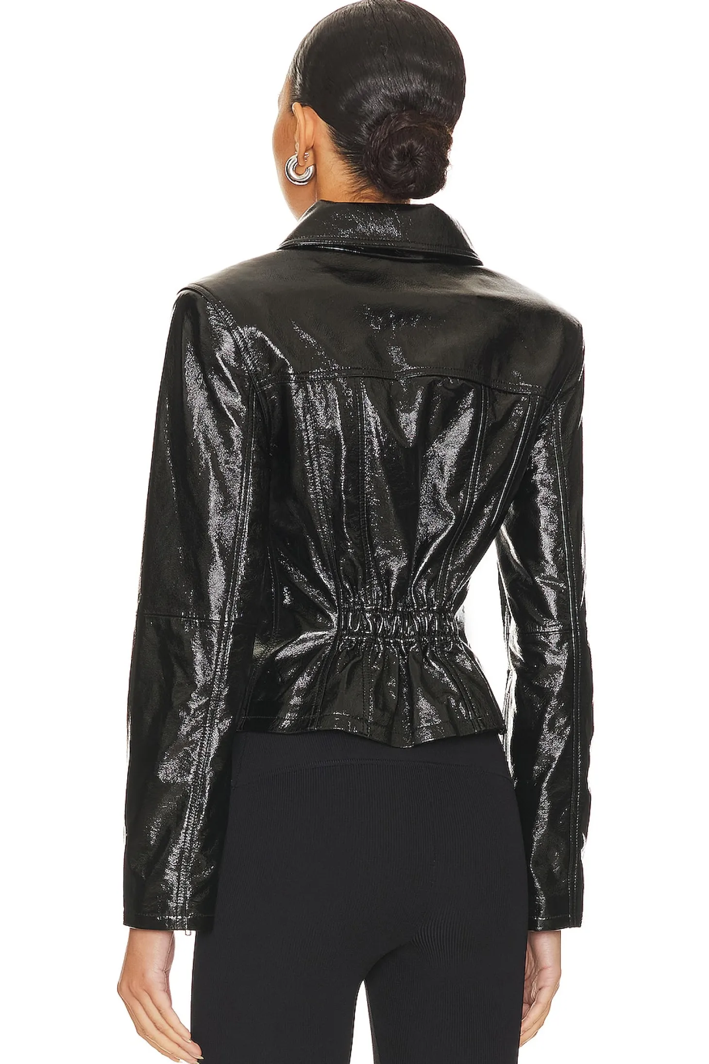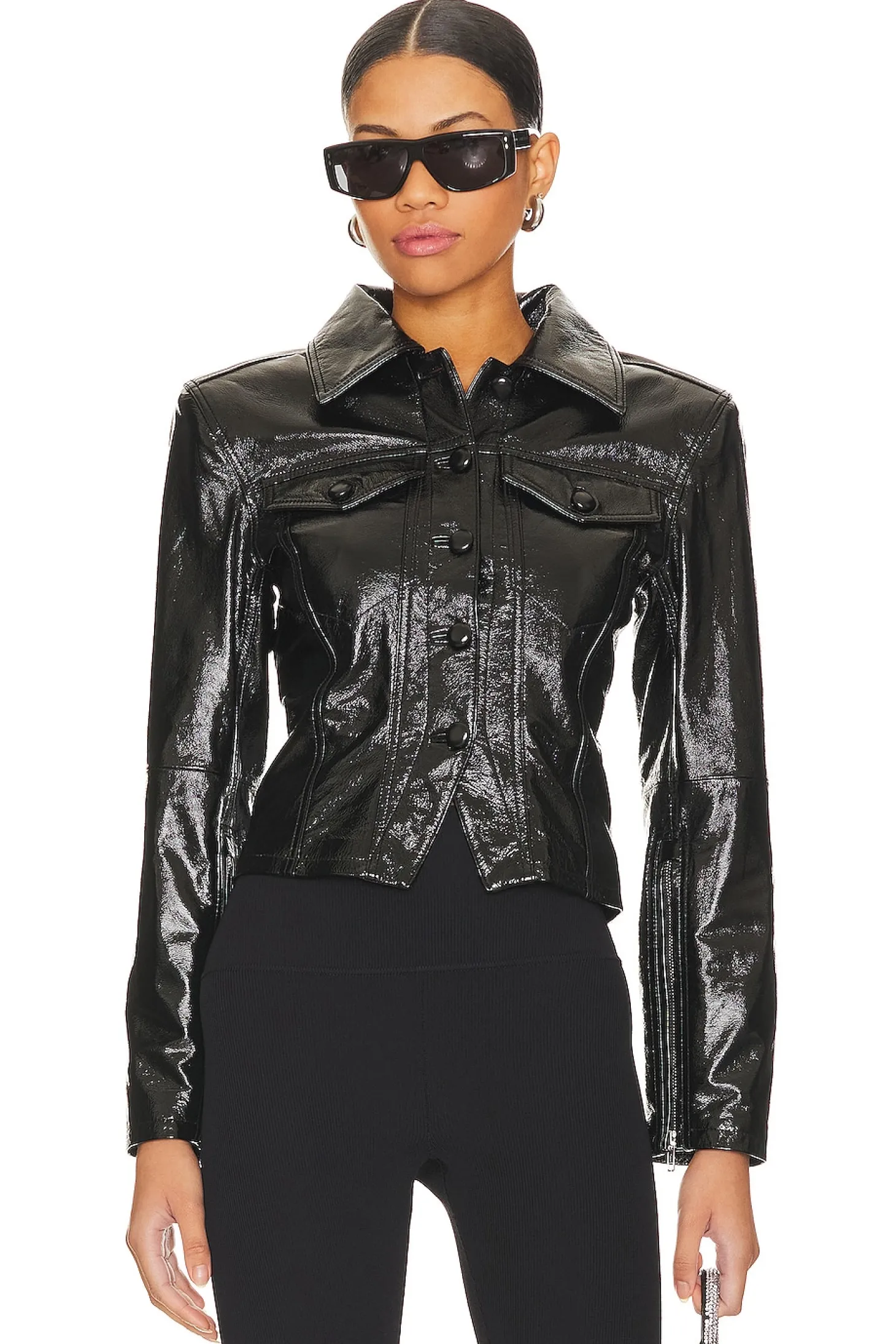 Self: 100% lamb leather Lining: 100% polyester.Made in China.Professional leather clean only.Front button closure.Padded shoulders.Breast flap pockets with button closure.Zipper gusset sleeves.Cinched waist at back Sheen finish