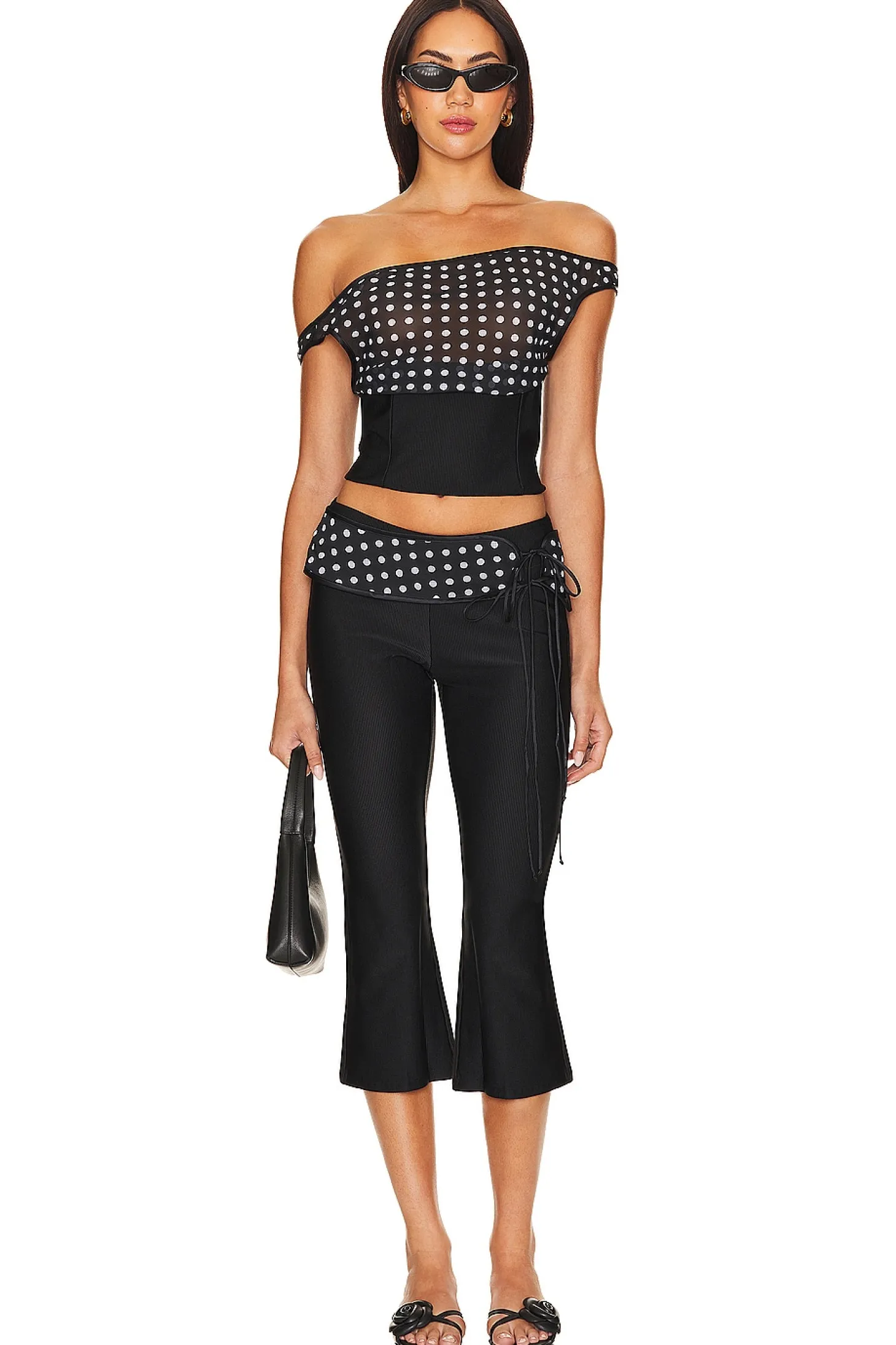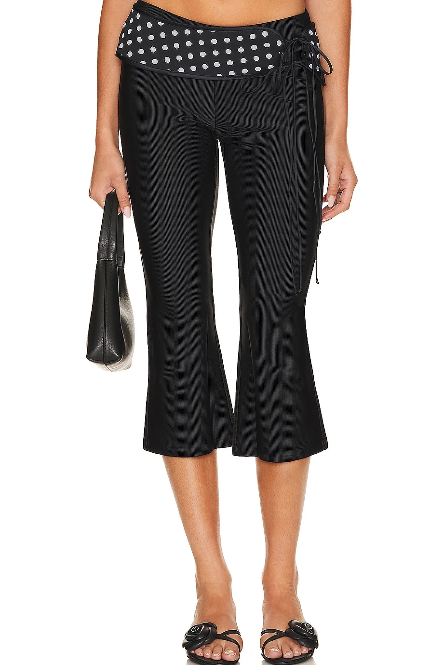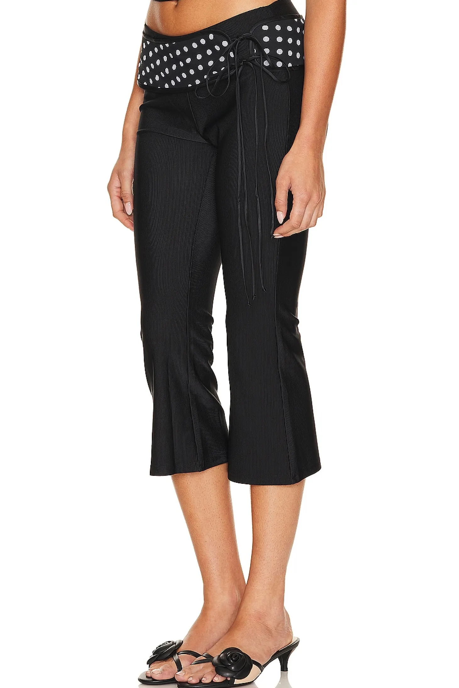 Polyester blend.Imported.Hand wash recommended.Detachable polka dot waist accent with side tie closure.Ribbed jersey fabric.Item not sold as a set.14" at the knee breaks to 16" at the leg opening