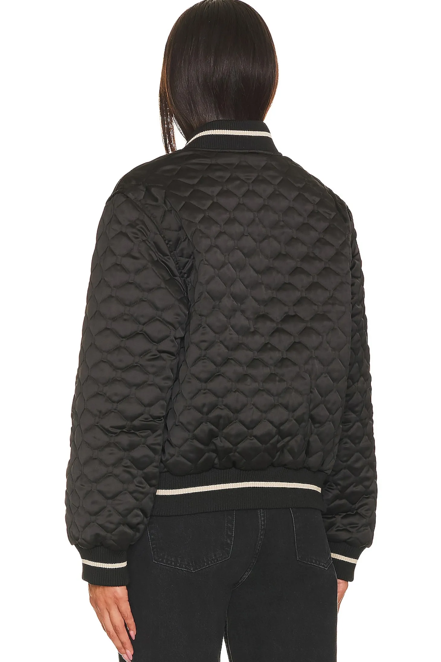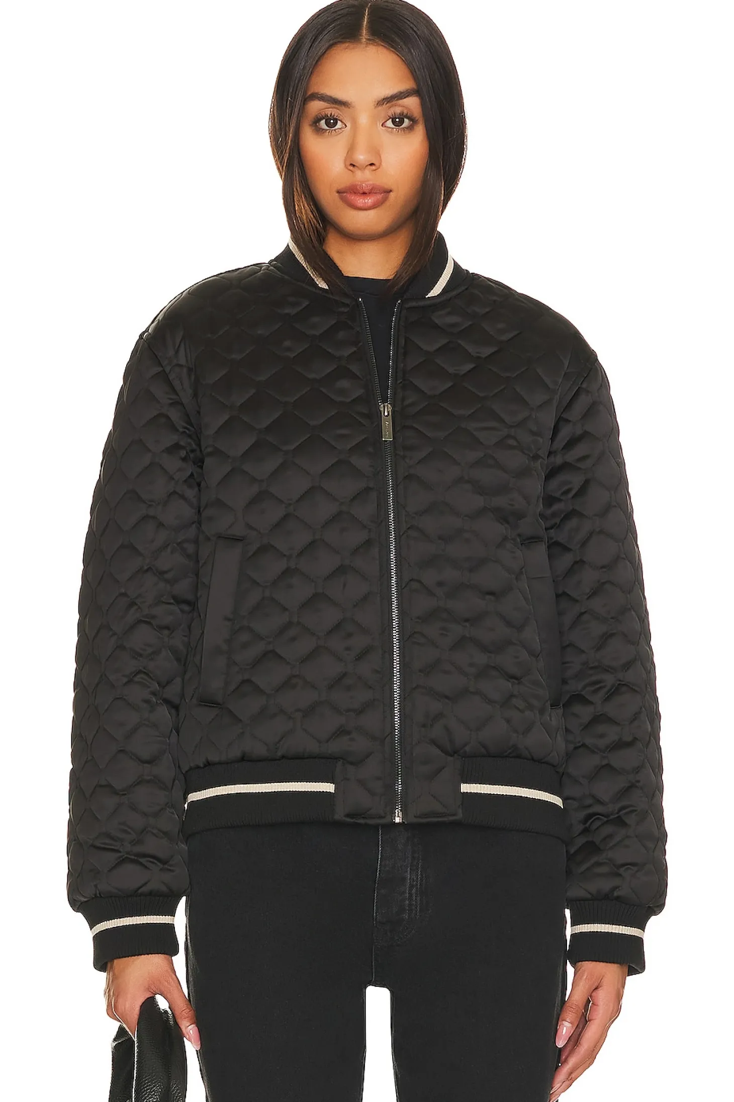 Self: 97% polyester 3% spandex Lining: 100% polyester.Made in China.Machine wash.Front zipper closure.Side slant pockets.Quilted satin fabric with ribbed trim with contrast striping