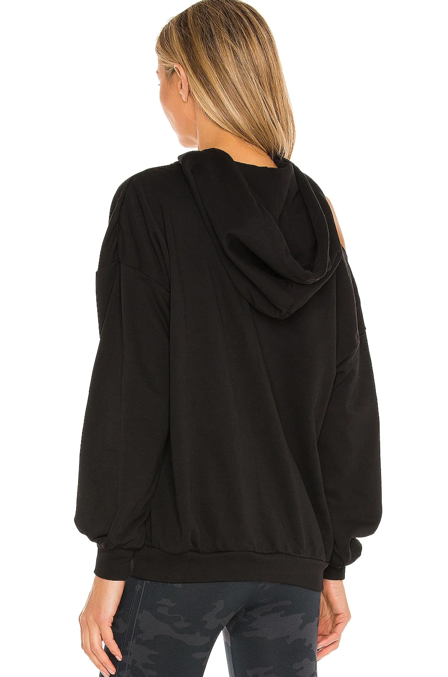 80% cotton 20% poly.Hand wash cold.Attached drawstring hood.Shoulder cut-out.Oversized fit.Imported