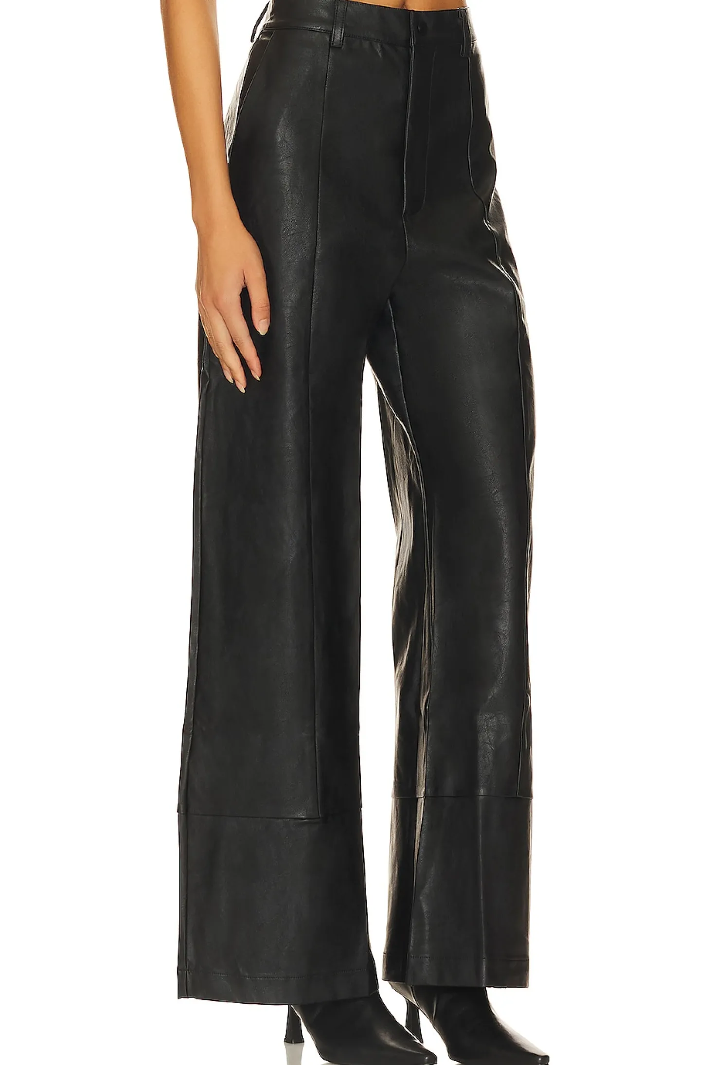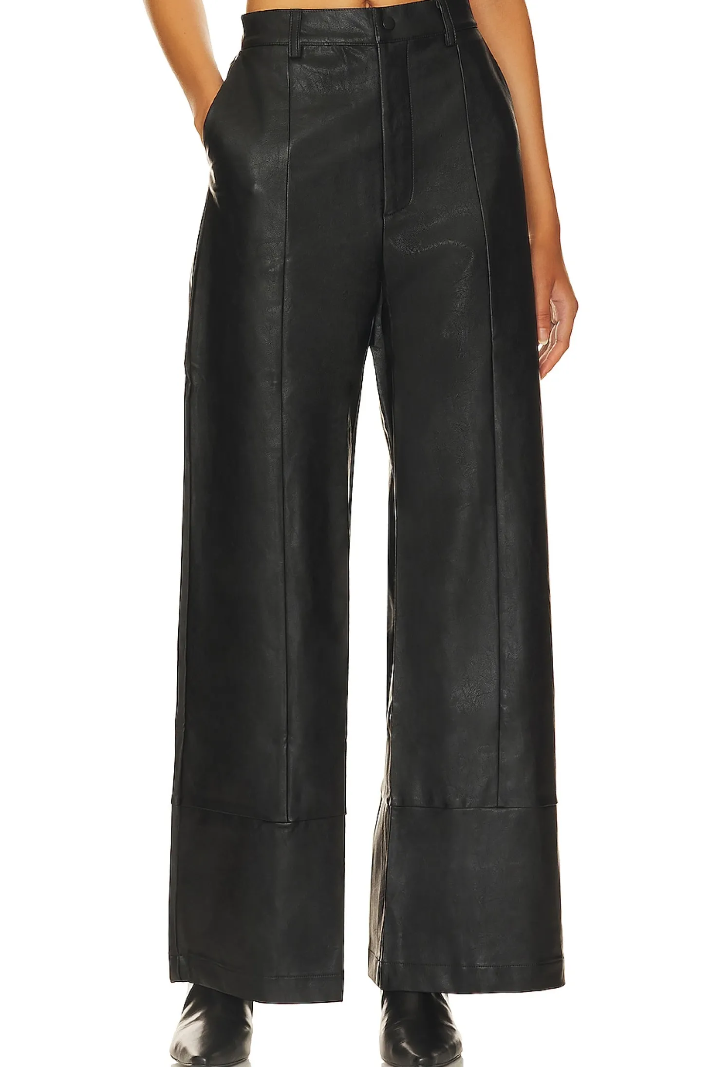 Self: 55% polyester 45% cotton Lining: 97% polyester 3% elastane Contrast Fabric: 100% polyester.Made in China.Hand wash.Zip fly with button closure.4-pocket styling includes back faux welt pockets.Darted faux leather fabric.24" at the knee and 24" at the leg opening