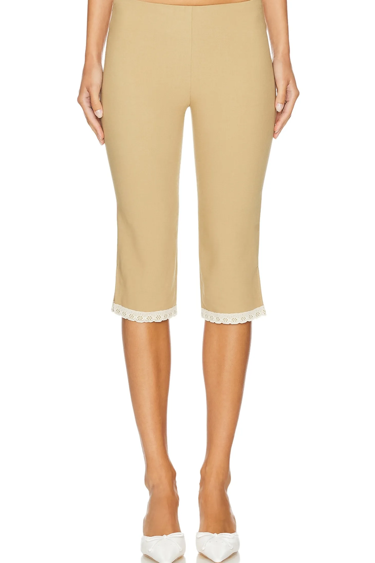 70% polyester 23% rayon 2% tencel 2% acetate 3% spandex.Made in China.Machine wash.Hidden side zipper closure.Jersey fabric and slit hem with lace trim.17" at the knee narrows to 14" at the leg opening