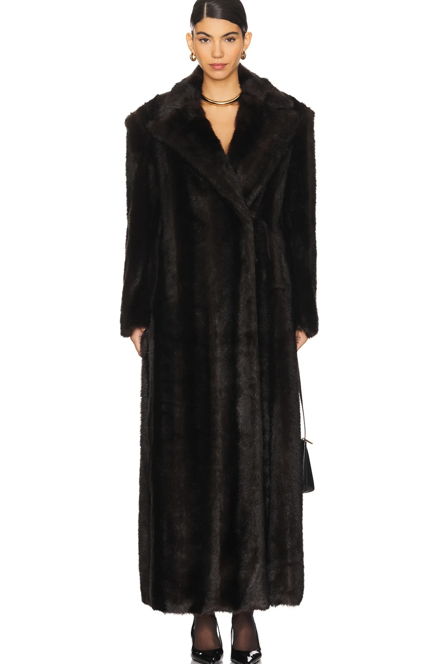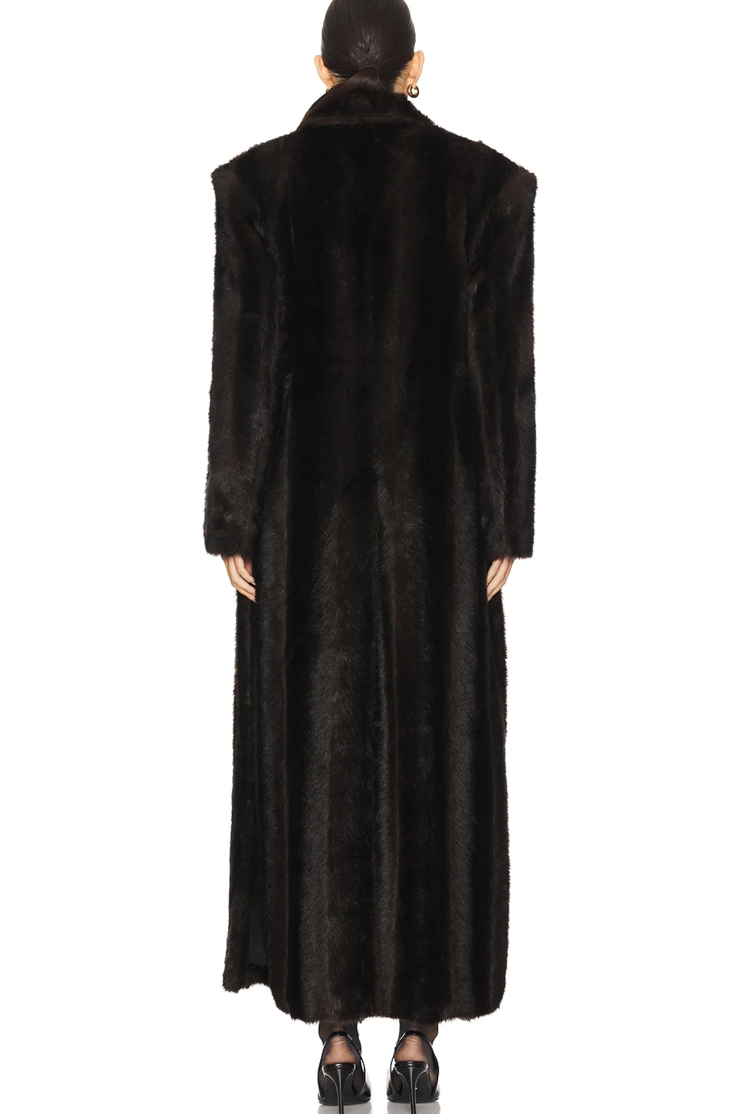 Self: 81% modacrylic 19% polyester Lining: 100% polyester.Made in China.Dry clean only.Dual hook and eye closure.Side pockets.Interior breast pocket.Faux fur with padded shoulders